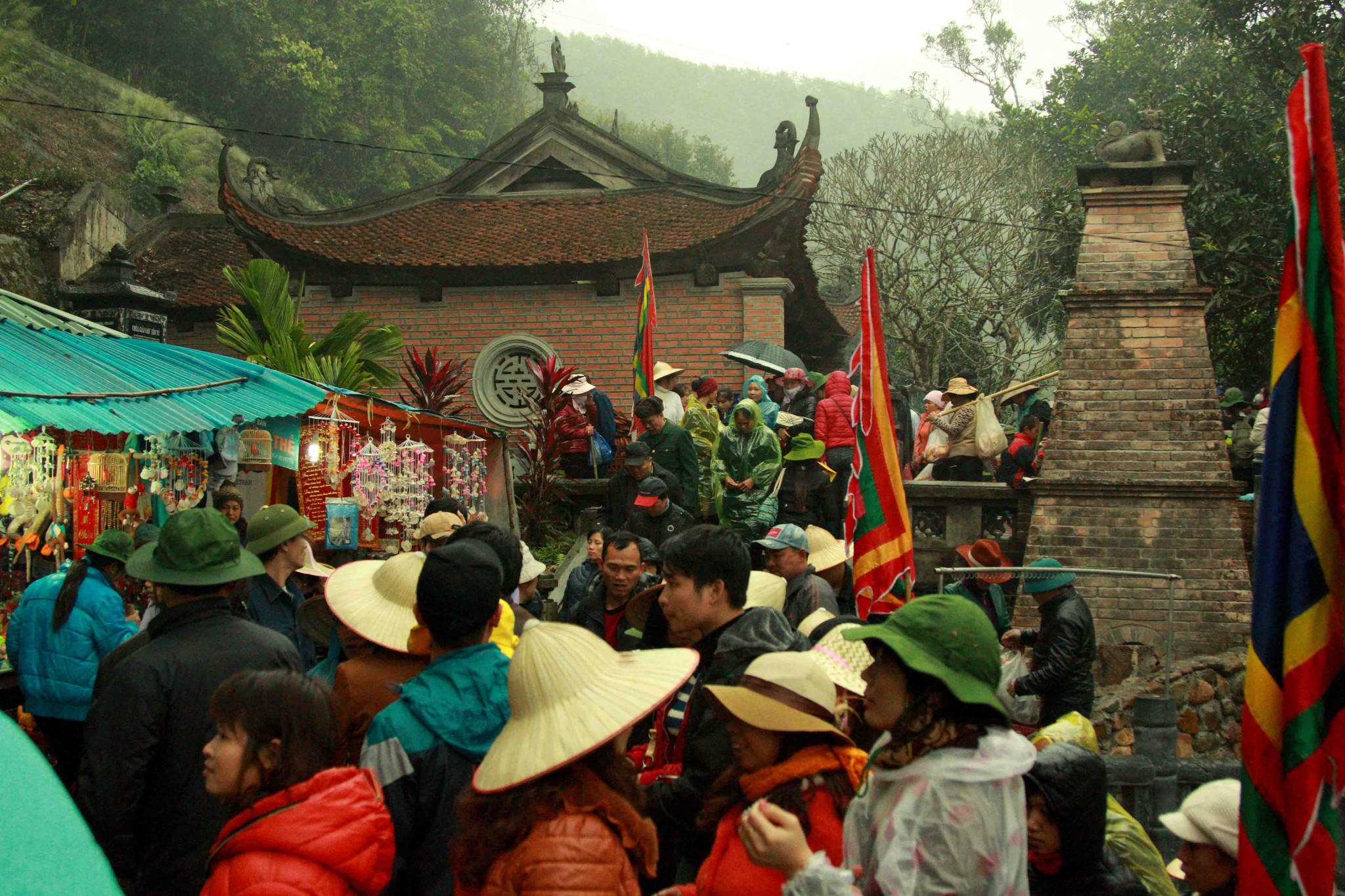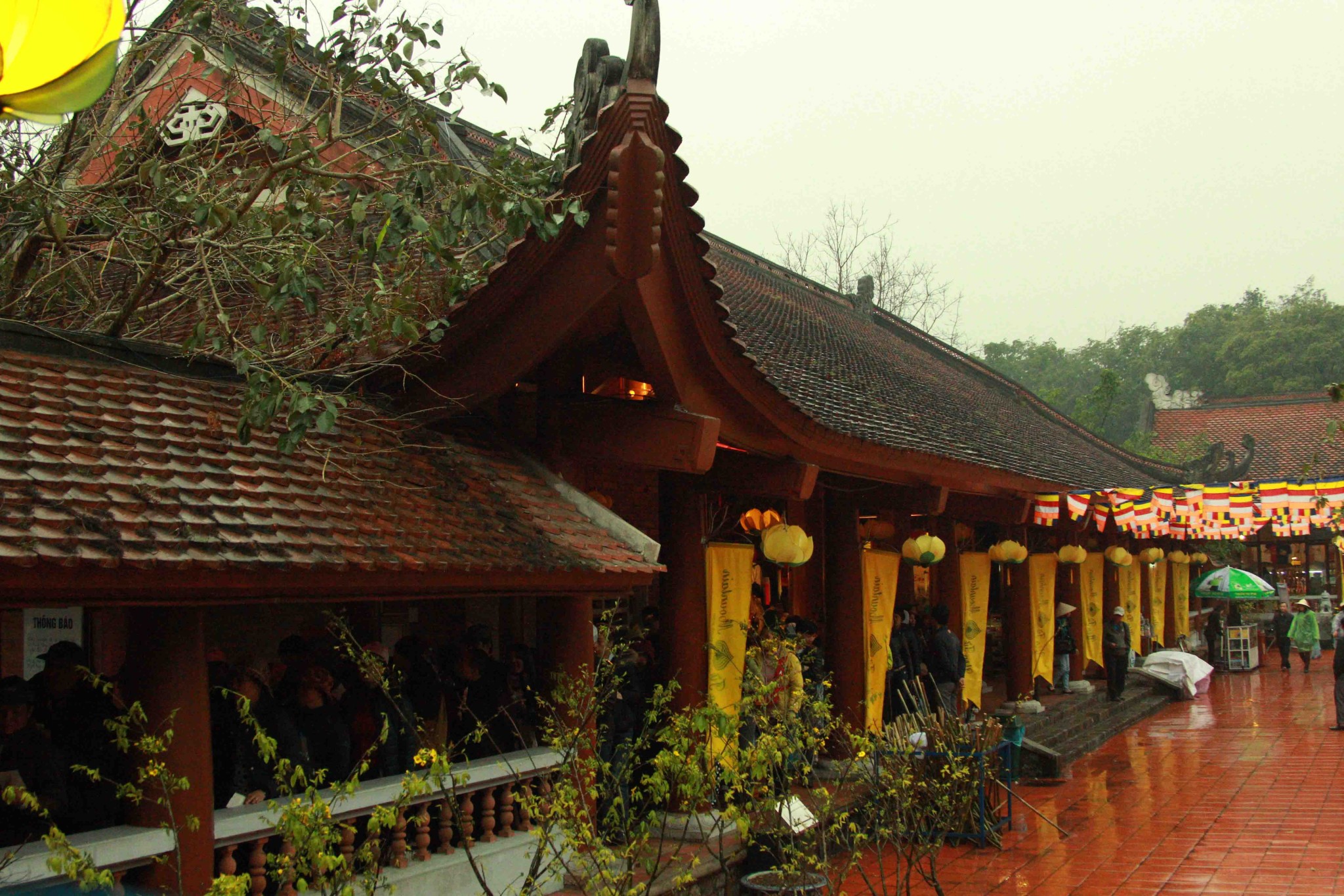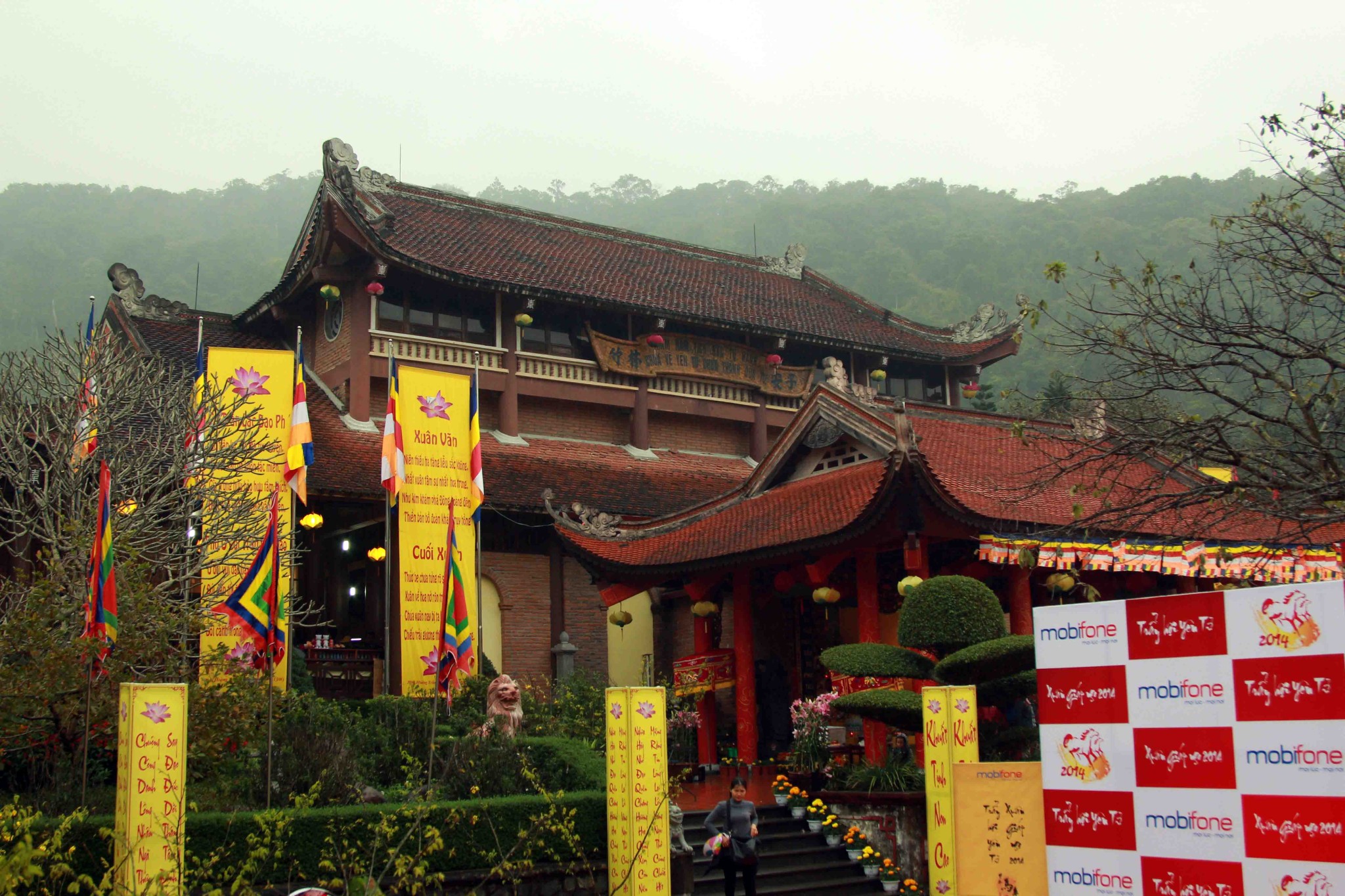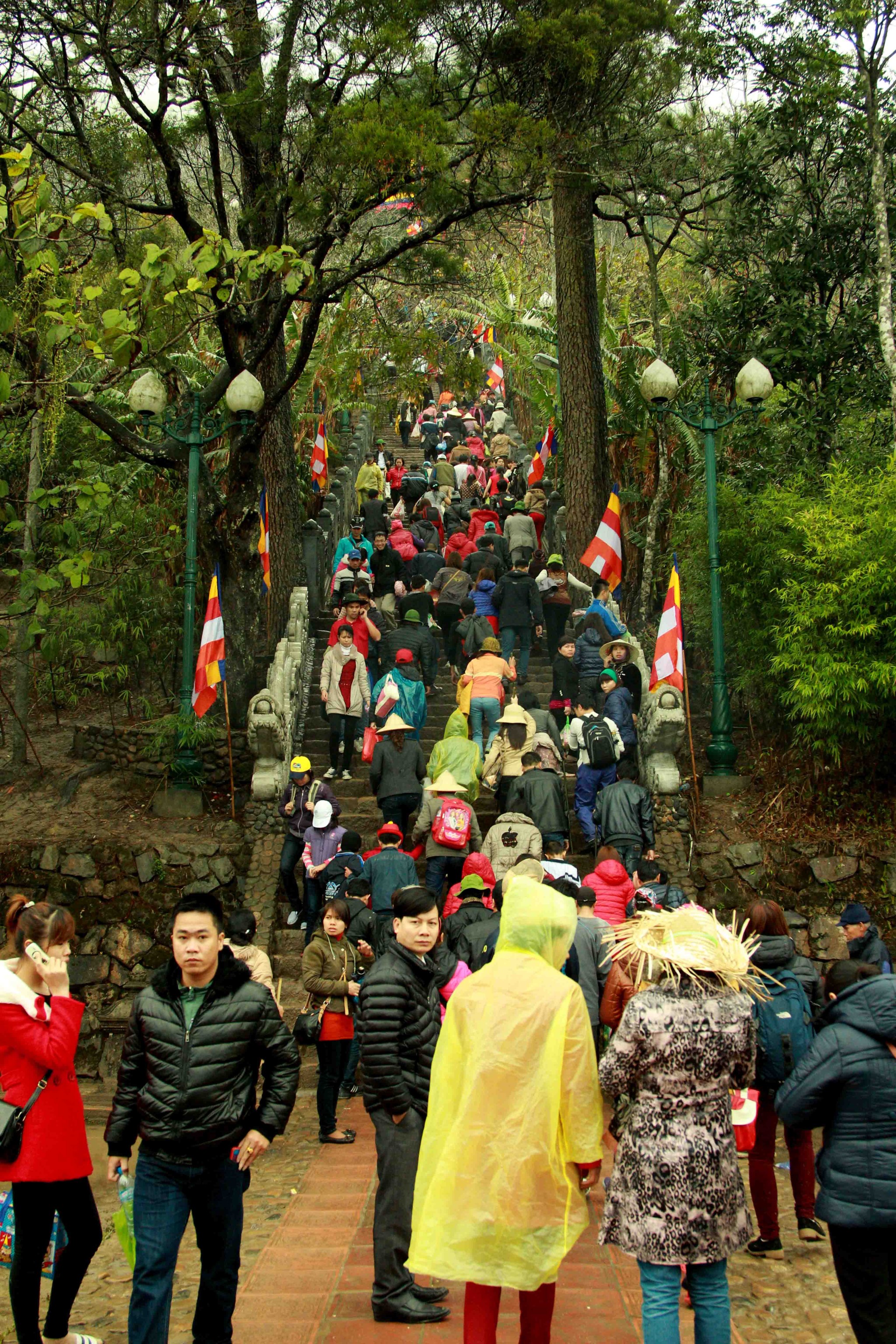 铜寺座落在广宁省东朝弧形山脉最高峰的建筑,被越南吉尼斯书评为最大的铜建筑,同时也是越南纬度最高的庙宇。这也是世界上独一无二的神圣建筑。这座寺完全用铜铸成,总重量70吨,长4.6米,宽3.6米,高3.35米。寺庙以莲花台为造型,旁边有一口仙井,常年有水。四面八方的游客到这里来,因能喝上几口仙井里的水而感到莫大的幸运。从山脚到山顶的铜寺,游客需要走 6000米的崎岖山路才能到达山峰。如果要节省时间和体力,也可以选择坐缆车上去。到了山峰,游学感觉行走在云里雾里,分别不出哪是天,哪是地,哪是人间。从铜寺向四周眺望,东北平原象一张绿色的地毯延绵张开,美丽的景色尽收眼底。