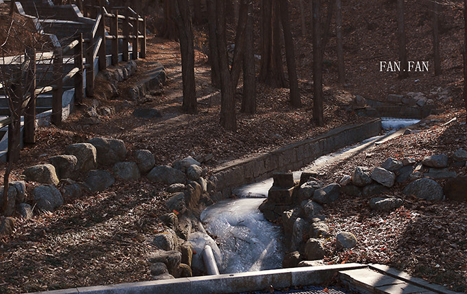 阶梯两旁的树木在夏天必然是郁郁葱葱的,而此时光秃秃的