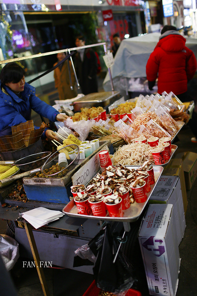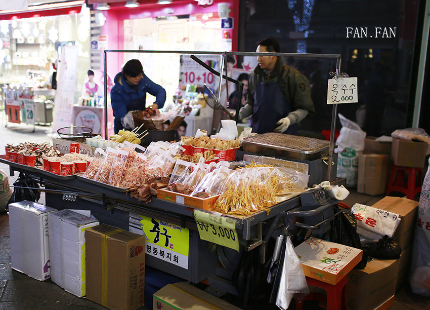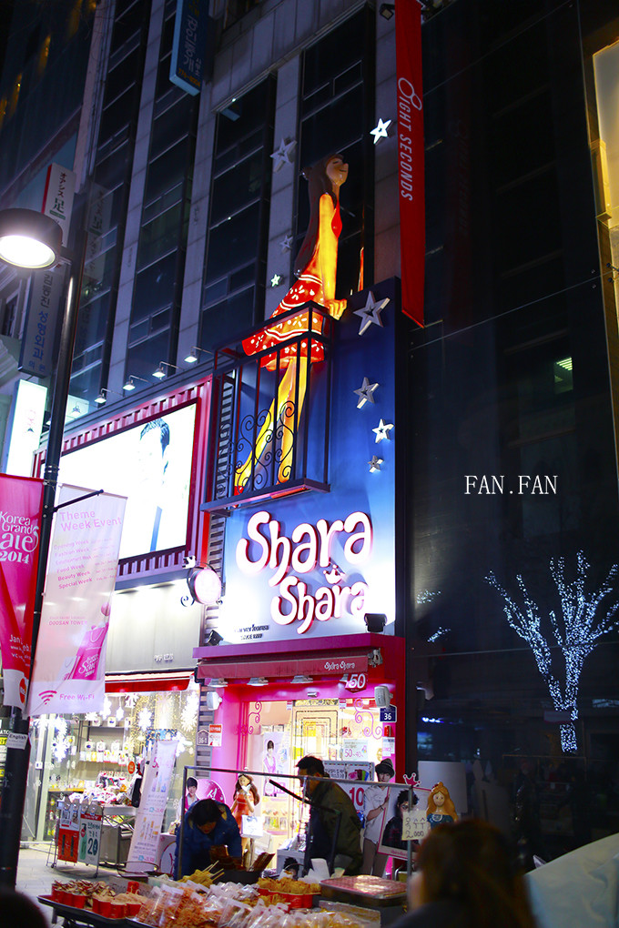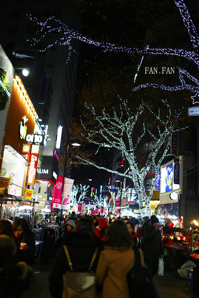 晚上的明洞大街比白天的还要热闹,灯火通明,很有味道