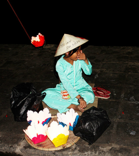 在河边看见许多卖水灯的越南 小女孩。。。很可爱。