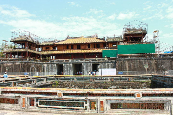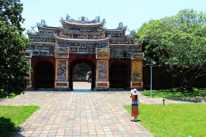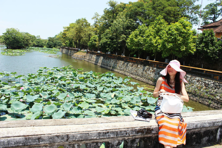 上午10点左右,大巴到达顺化 ,顺化 从1802年作为阮朝的都城,第一位皇帝嘉隆从1804年开始建造皇家建筑,直到1945年阮朝的最后一个皇帝保大退位。尽管1947年的一场大火毁坏了阮朝统治时期顺化 150座皇家建筑中的大部分,又历经法国 战争和越南 战争(1968年春,越共和 北越的军队在这个城堡与美国 海军的激战中坚守了25天),却完全没有毁坏这座古城 。其中大部分宏伟的建筑都得以保留下来,并经过精心的修缮保持或恢复了原貌。宏大的顺化 皇城拥有神话般的紫禁城以及宫殿、亭台、寺庙、池塘、花园等,同时也环绕着紫禁城附近的绿树成荫的街道、公园、博物馆和小餐馆。在1992年被联合国教科文组织列为一处世界遗产。