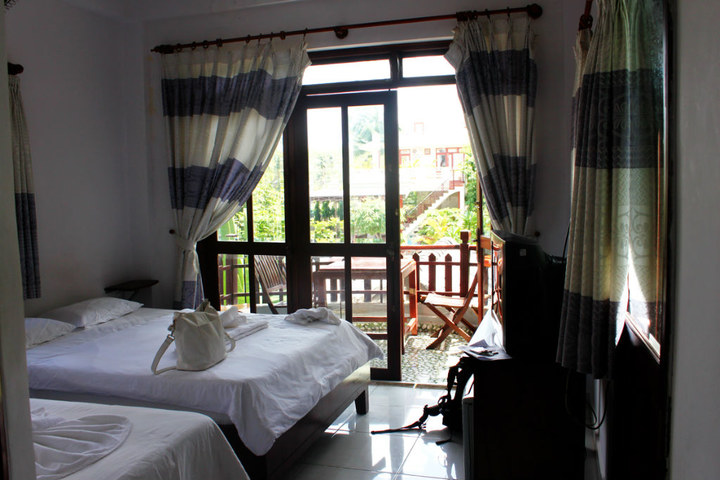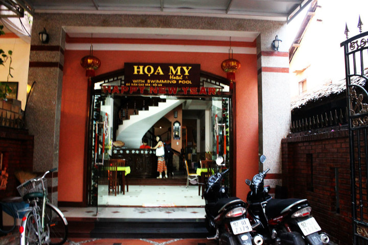 到达会安 古镇的时候天色已近黄昏。Sinh Cafe的巴士停在古镇外围的Nhi Trung St.,车站的对街一家挨一家楼房式的家庭旅店,甚至有的还带有楼顶天台 泳池的。一下大巴,就有骑摩托拉 客人的大叔,我一向很懒,觉得大叔开价不错就去了。我们没有住进古镇核心区域,就近找了家旅店入住,两人间325K(162.5K/人)。
