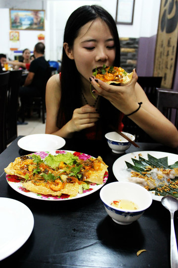 之前做过攻略,会安 有三大名 菜。白玫瑰(white rose),炸云吞(fried wonton)和caolao必须要吃。。。走出住的地方。就看到一家很多越南 本地人在吃的店子。。。于是果断地走进去,点了招牌菜,白玫瑰和炸云吞。170K。