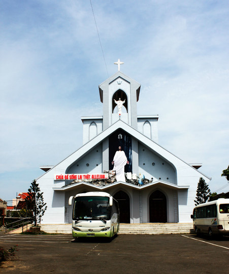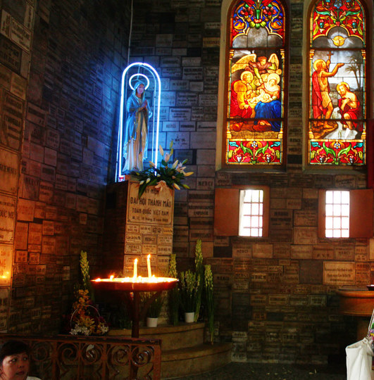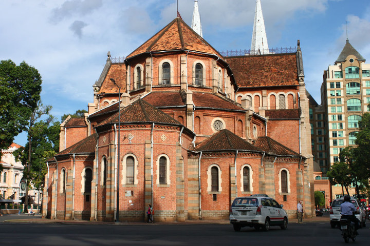 接着前往东桂路,看看美丽的教堂。圣母大教堂,该教堂是在越南 的法国 天主教建筑中最宏伟的一座,由法国 建筑师朱尔斯·布瓦德 在19世纪70年代中期设计建造。教堂正对东桂路北端的街心广场,正面相配两个高达56米哥特式尖塔的钟楼,6个钟重量几乎达到了30吨。教堂的砖石是从马赛 进口的,花岗岩取自西贡 河边,建筑的装饰物号称花费了250万法郎。圣母大教堂的中殿有两根石柱 撑起拱形的屋顶,以及由屋顶流线一气呵成的半圆形的后殿,圣堂两侧一排排的壁龛上放置着耶稣受难像和守护神的雕像。