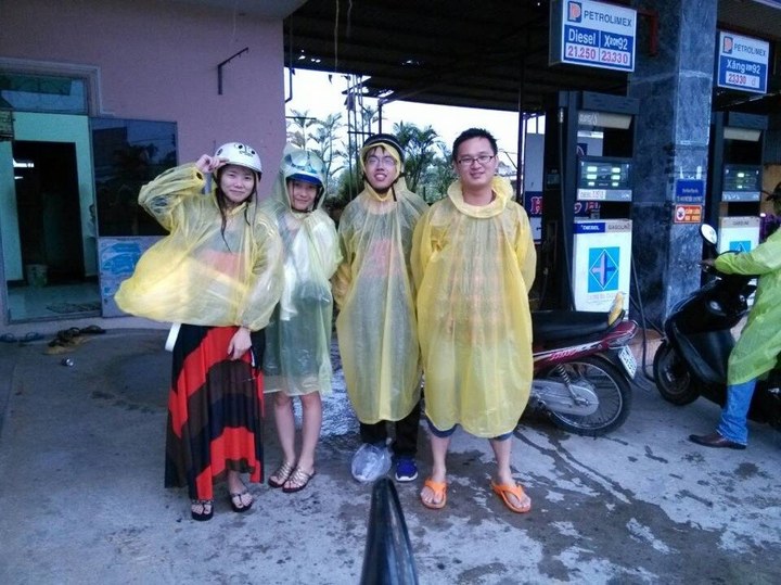倾盆暴雨中骑摩托车的惨状就不予描述了,我是坐摩托的,雨水打在我脸上都超级无比疼。俺觉得载我的阿亮同学。。。肯定被雨水打惨了。。。然后加油的时候,用手机拍了一张四个人狼狈无比的照片。。。(我,红豆,亮,阿军)
