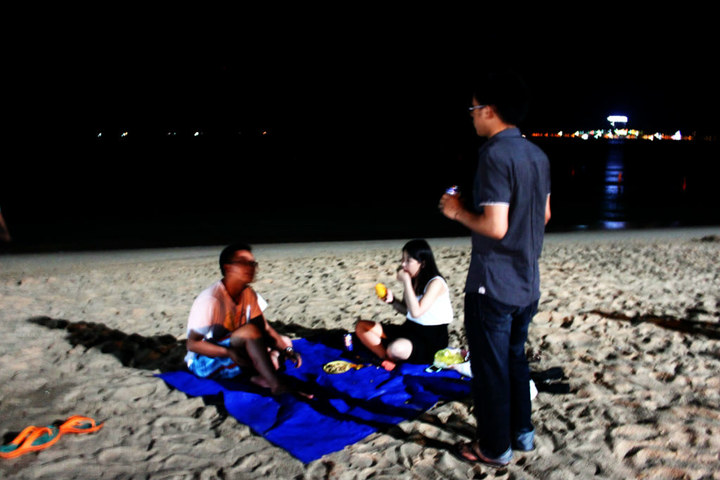 期间阿军输了,我们让他去和旁边一个体重有100公斤的女人拥抱去,他去了。。然后。。我们全部都笑死了。后来又在海边拍了好多视频。