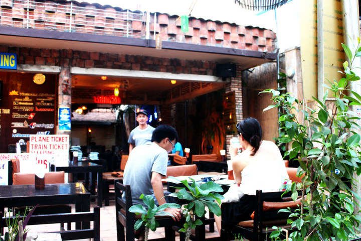 范五老街 上已经人满为患了。露天的啤酒坐满了欧洲 人。相比去年在曼谷 看到的考山路,有过之而无不及。然后我们两个女人。。。就在街上晃来晃去,,,不知道去哪个酒吧坐。