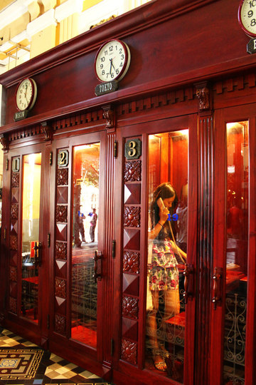 圣母教堂 的对面是胡志明邮局,邮政总局本身也是西贡 一处标志性的参观景点,由古斯塔夫·埃菲尔公司设计,在1886年至1891年间修建,其拱形的内部结构和天窗让人想起来19世纪的欧洲 火车站。走进邮局,大厅拱顶的正面墙上挂着胡志明同志的巨幅画像,让人刚才还身处东桂路的奢华与时尚,而在踏进室内的一刻间清晰——纵然是在西贡 ,那也是在社会主义红旗下的越南 。