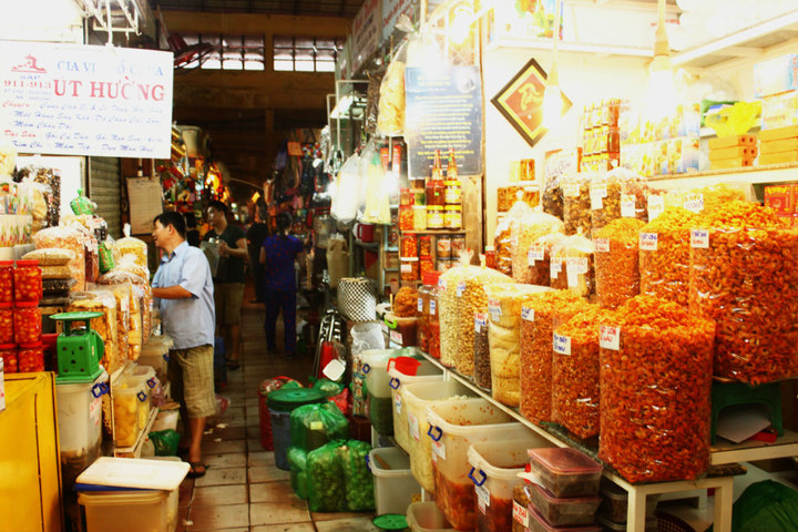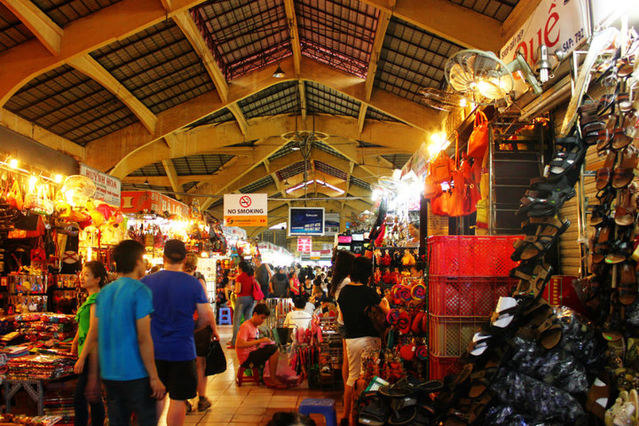 边青市场[Ben Thanh Market]。原来的边青市场位于Ben Nghe河岸边,距离嘉定 城堡很近,1859年法国 发袭击毁坏了市场所处的码头要塞。直到1914年,法国 政府在现址又建立了边青商业中心,占地12000平方米,两个主要的通道 将市场分为四个区域,四个大门中南门是一座标志性的钟塔,从这里进入市场的南部是服装区,紧挨着的是鞋类、箱包和各种小商品,继续前行是食品区等,另外还有12个出入口,通达整个市场的1200个摊位。