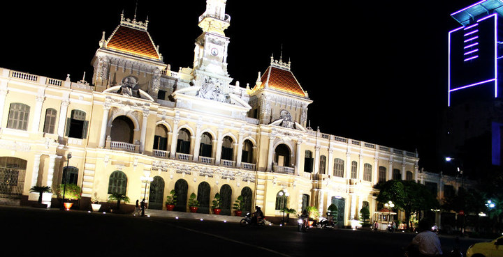 东桂路右转正对Nguyen Hue St.矗立着1908年修建的人民委员会大楼,他仍被当地人称为市政府大楼。夜景也很美。