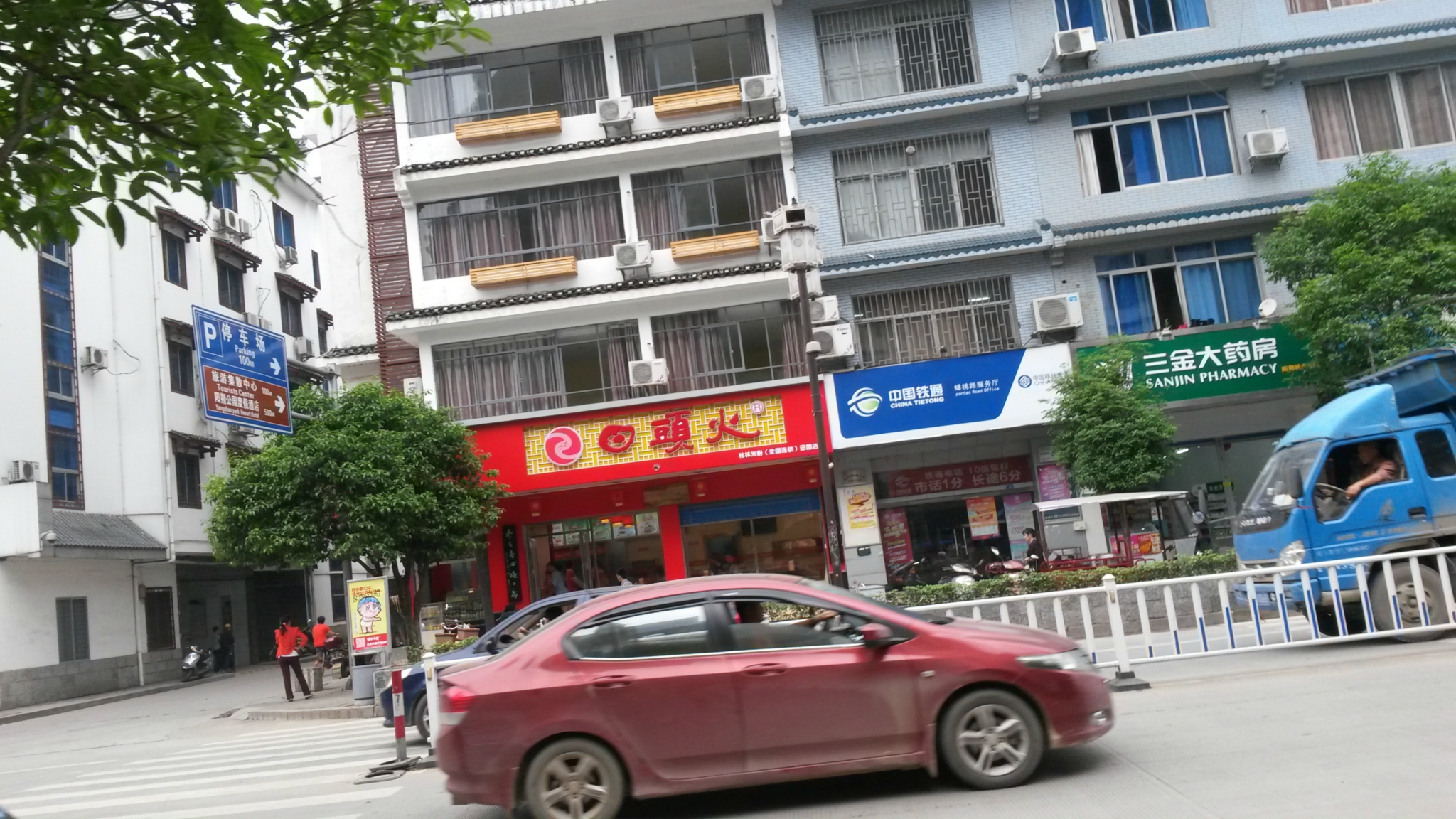 出了火车站火车口就有去/travel-scenic-spot/mafengwo/10027.html{阳朔} 的车,我们本来是想时间还早就往汽车总站方向走,顺便买个早点。结果半路上有许多路过的车都是到/travel-scenic-spot/mafengwo/10027.html{阳朔} 的,也都招呼路人要不要上车,其中一辆车直接停下了,问我们去不去,我们问多少钱,售票员说20,我们看攻略,不知道哪年的写着价格15左右,我们就直接说15行不行,他们说行就直接上车了,应该是那种不是很规范的中巴车,到火车站啊,路边啊都会停2分钟喊客等人,但其实时间都和大巴差不多。到了/travel-scenic-spot/mafengwo/10027.html{阳朔} 总站下了车步行至酒店,我们是在网上团购的/travel-scenic-spot/mafengwo/10027.html{阳朔} 雨亭酒店,价格79元,酒店离西街不是很远,在一个小巷子里,是一对年轻夫妇开的,酒店还算干净,大堂有饮水机,不过第二天没有水了一直也没人换水了,我们住的3层,酒店的WIFI信号不是很好,iPhone5s和ipad mini收不到信号,但/travel-scenic-spot/mafengwo/75843.html{三星} 手机可以搜到正常使用。