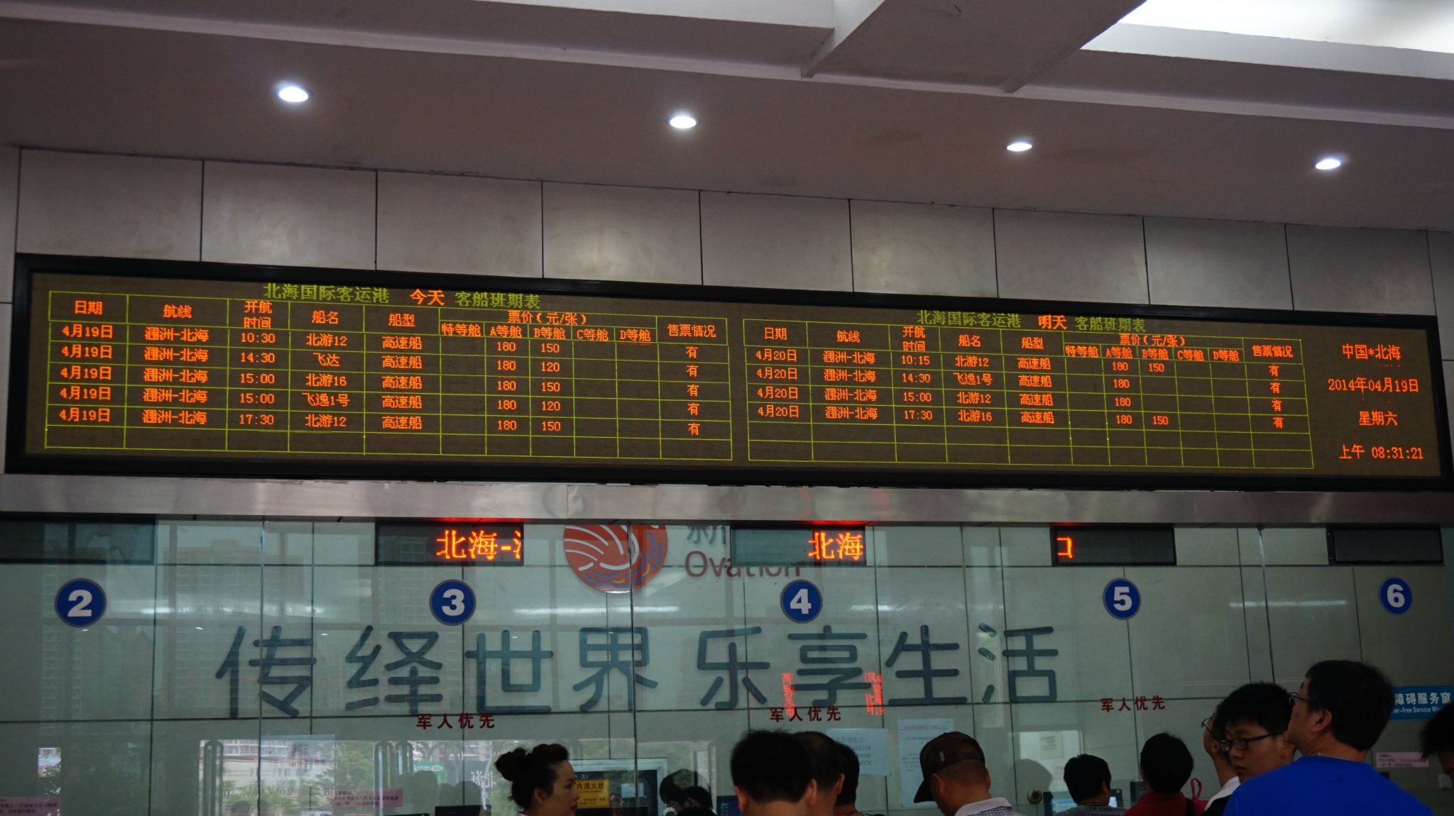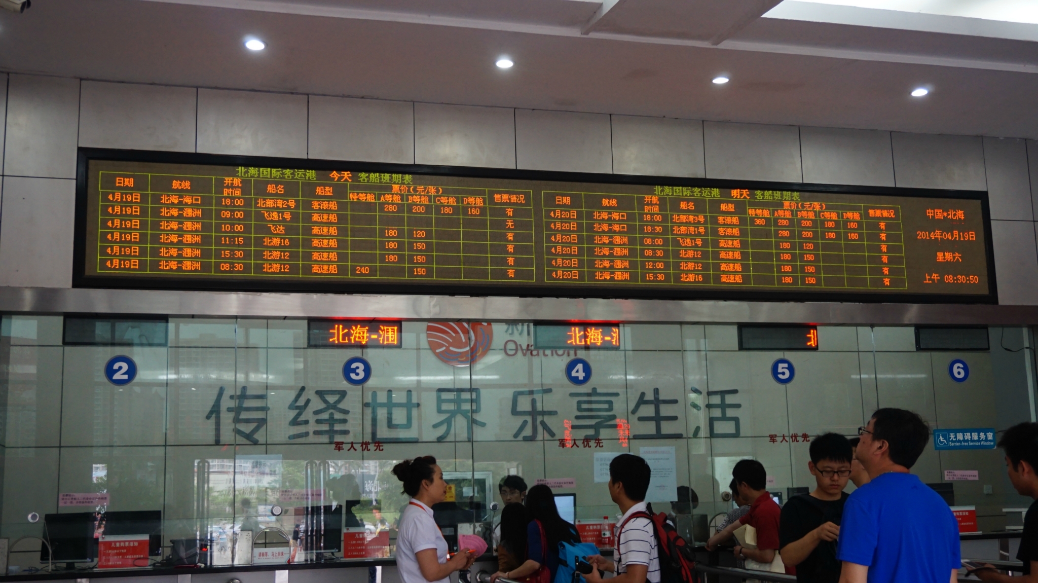 售票大厅上会展示今天和明天的发船时间和剩余船票。