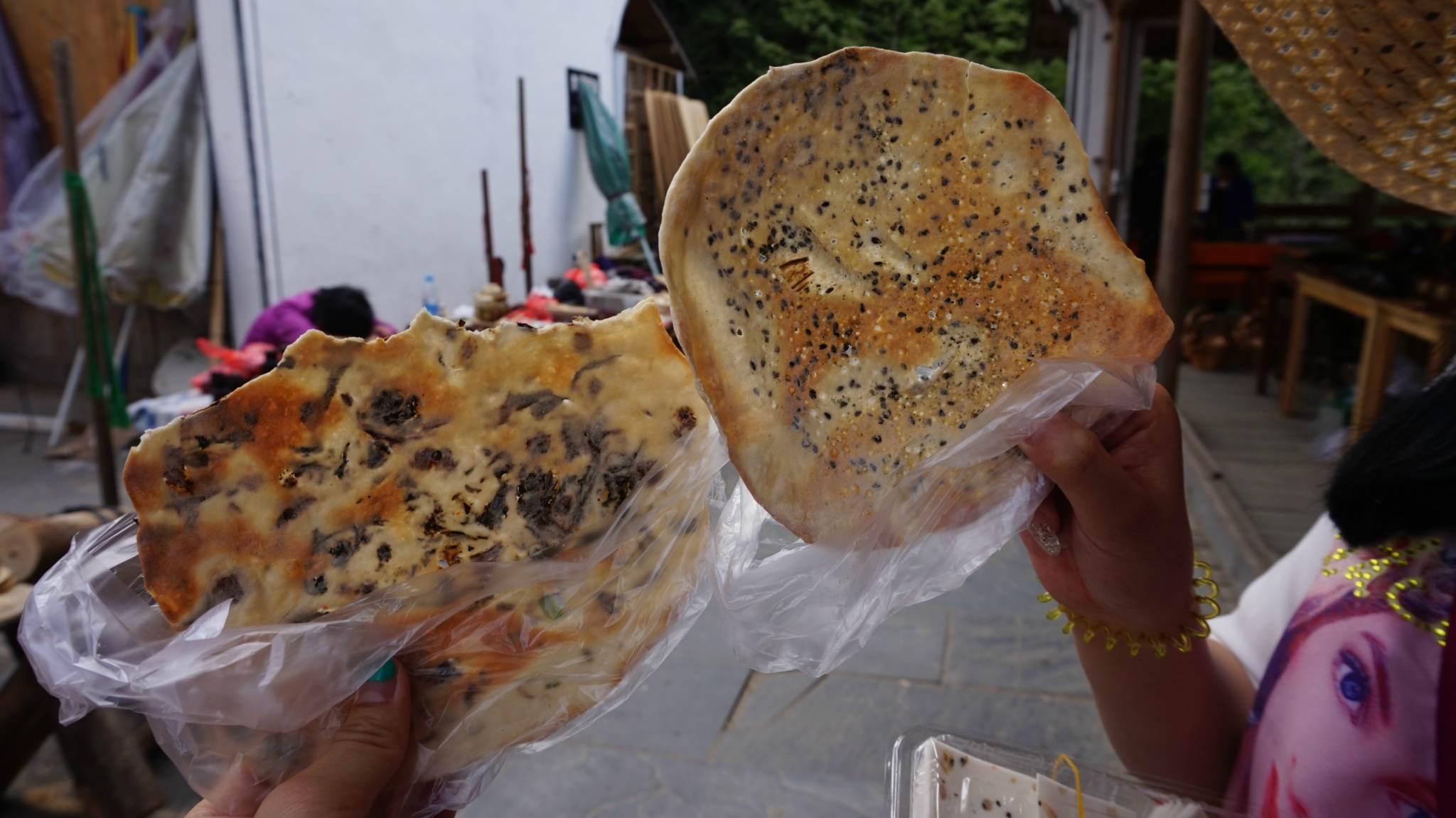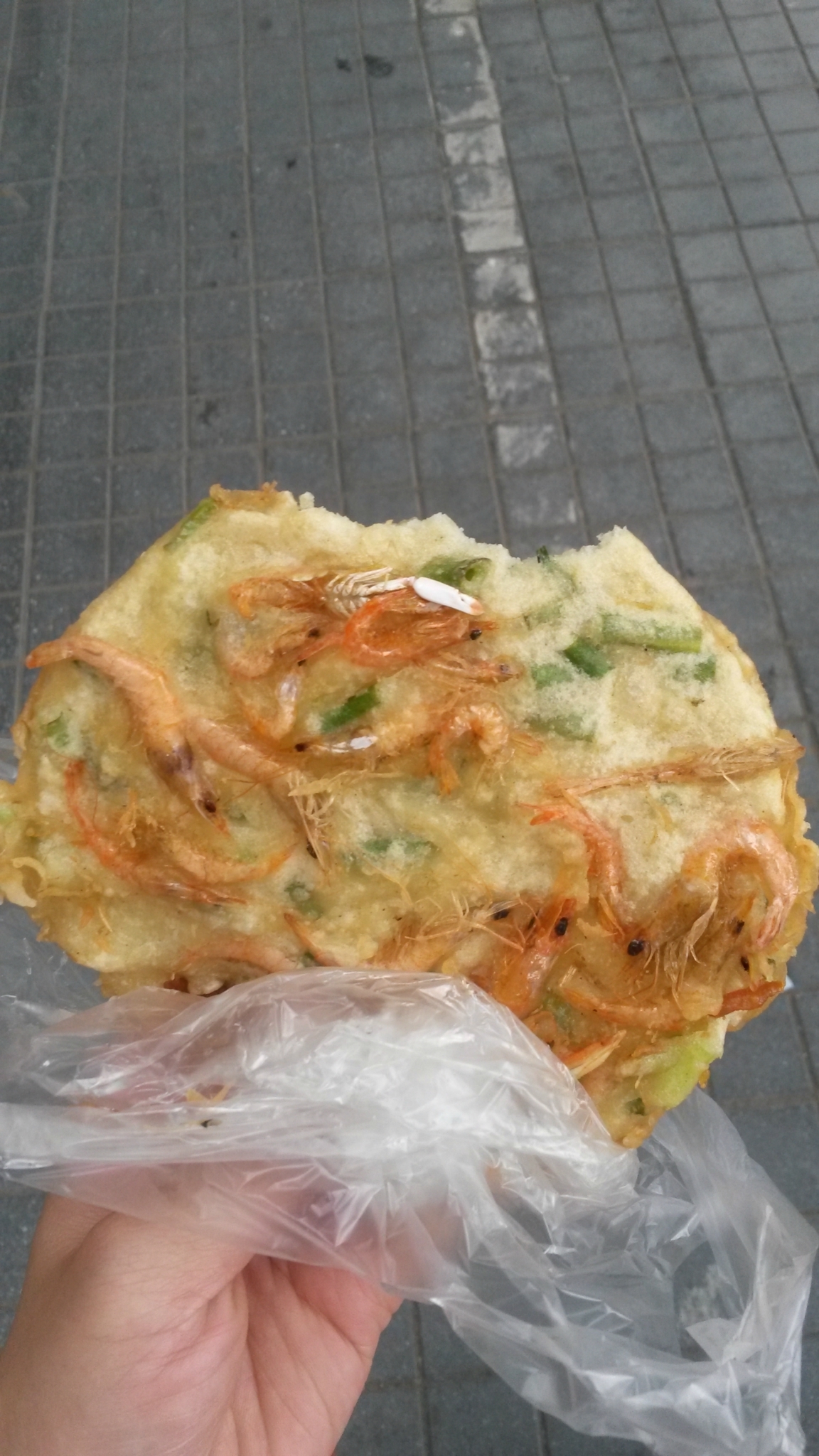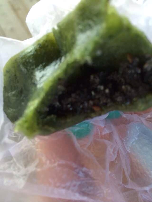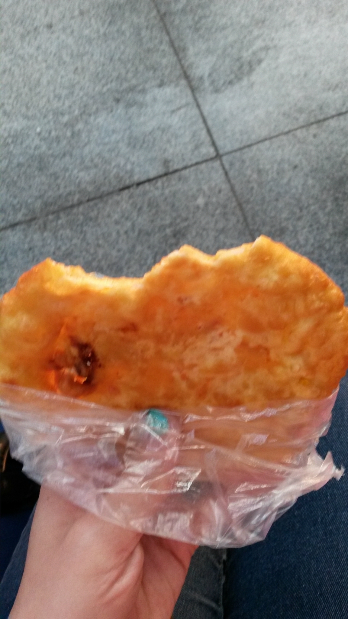 路边卖的什么饼,5块钱2个,左边咸的好像是梅干菜的,右边甜的是黑芝麻和糖的,还可以。