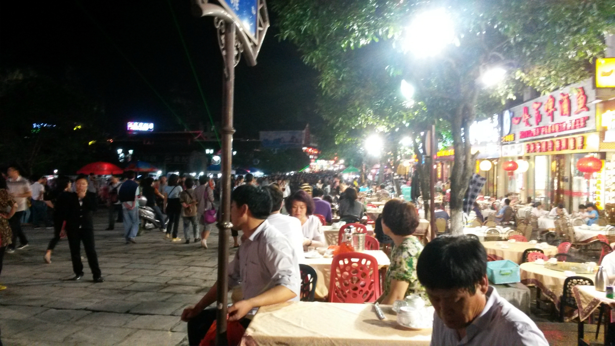 我们找了一个还算比较大的店,罗三姐啤酒鱼,点了一份啤酒鱼,一个西兰花,一份虾,花了一共98,他们也不能提供发票,看了一个收据还写的乱七八糟,图片上的虾有大概8厘米大,实际的也就3厘米,所以感觉很上当,鱼的味道还不错,如果我们晚上不赶时间的话也会选择其他人攻略里说的谢三姐啤酒鱼的。吃完饭在公园门口等他们开着小面包来接,然后顺路还接了好几批客人,基本上一个小面包车都坐满了人,到了他们的基地我们就后悔了,天还没全黑,我们就是拿着他们给我们准备的小凳子坐在江边,可以远远的看到正规的看台,基本上上座率也有100%,我们本来以为我们的座位会在看台的旁边或者后边,其实不是,是隔了一条江,虽然表演也在江上,但是在江的拐弯处,他们那边,我们还是什么都看不见,而且同观的人员素质太次了,不/travel-scenic-spot/mafengwo/16104.html{会安} 安静静的看着,或小声说话,有一大堆一大堆的老大妈们一起吃瓜子,一起唠嗑,还讲笑话,抬杠,声音不比菜市场小,我们真是无语了,看了一半有一批人就走了,我们也顺便搭了顺丰车,把我们送到西街,亲们想看表演的话一定要买正规的票哦,这个便宜真的占不得,真的什么都看不见,除了几个光点和一大堆的吵吵声。