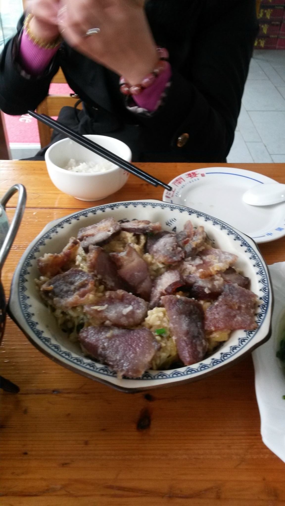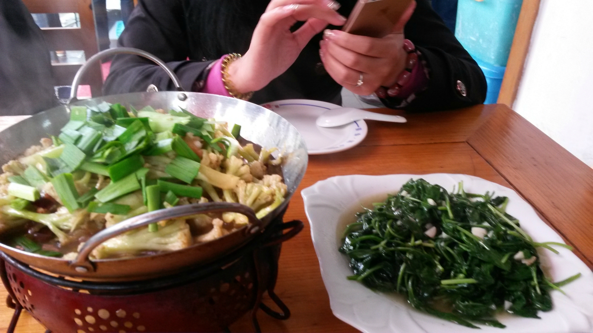 小巴车20元回到县里准备先找吃的,先前听第一天入住的酒店的老板说,车站十字路口附近有家/poi/7398272.html{彩虹楼(/poi/7398272.html)} ,他们自己也常去吃,我们也去尝试了下,结果很一般,感觉就是给游客开的一样,我们点了一个干锅花菜,一个炒青菜,当地的一个野菜吧,还有一个米粉蒸腊肉,腊肉很难吃,花菜正常水平,野菜还不错,2份米饭,一共花费97元。