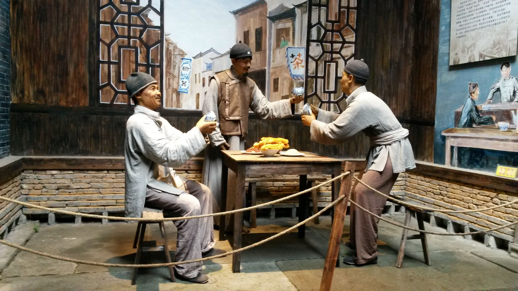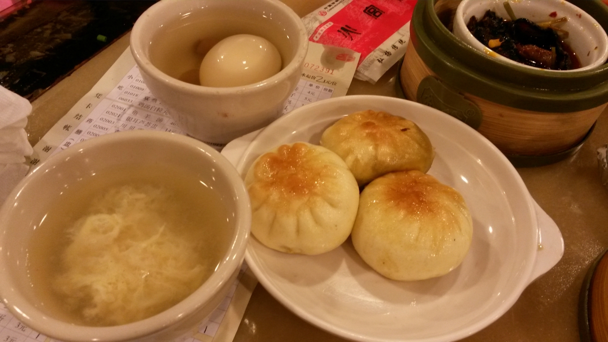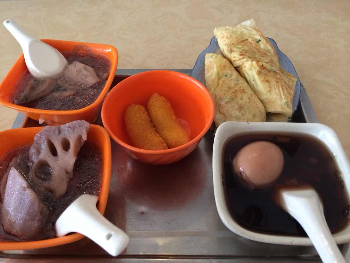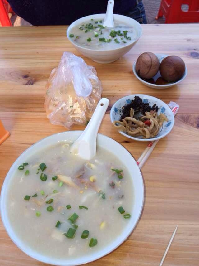 早餐和前台打听告诉我们向前走,看到公交车站往右手边胡同进去,里边有吃的,去古窑就在这个公交车站坐车就可以了,那条小巷交太白园路,里边有个菜市场,好多早餐小摊,我们选了一家人比较多的叫什么飞云阁米粉店,点了2碗鸭汤米粉,一小碟香菇鸡肉,一小碟鸭肠,一个茶叶蛋,在对面买了一根油条,一共花了14块8,味道还不错,环境很一般。