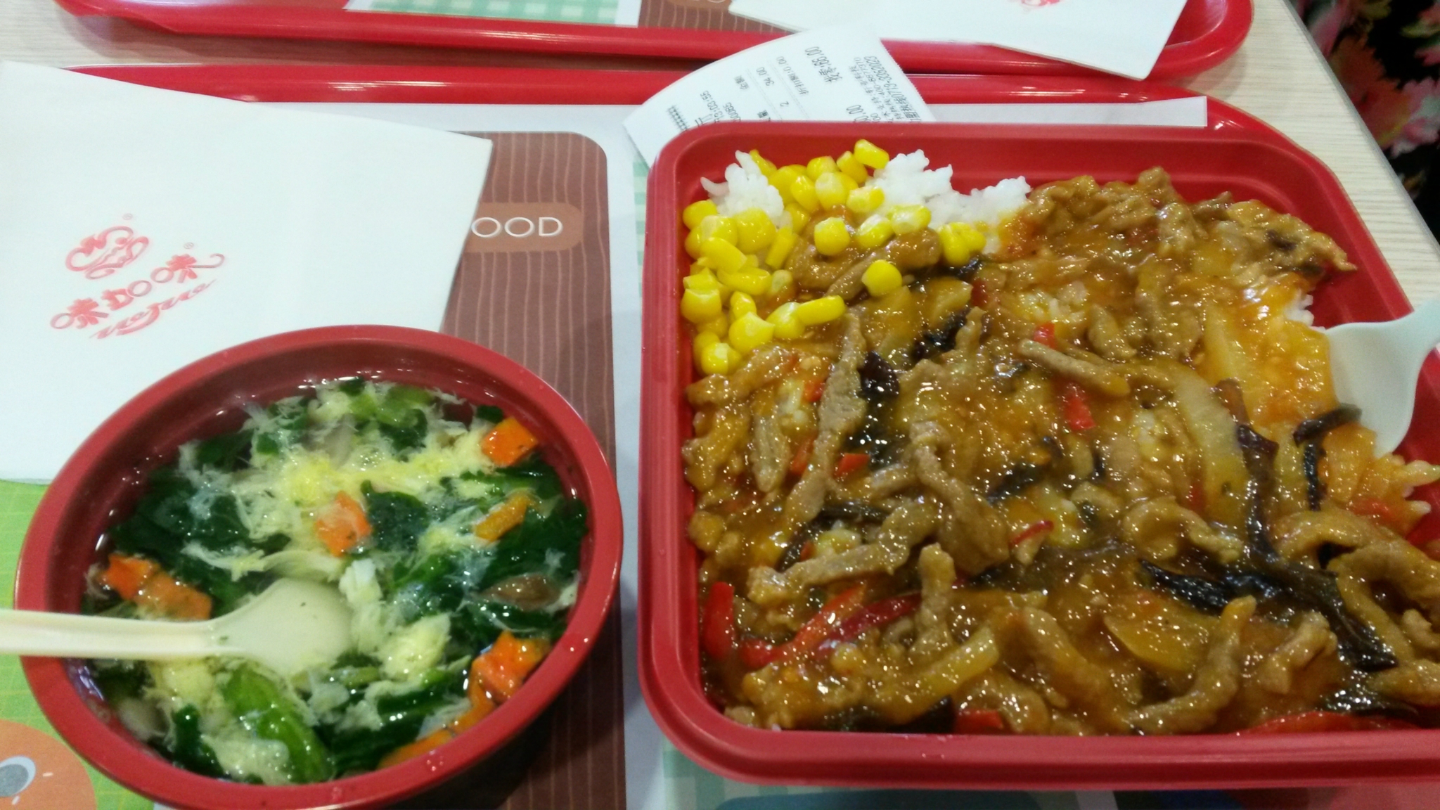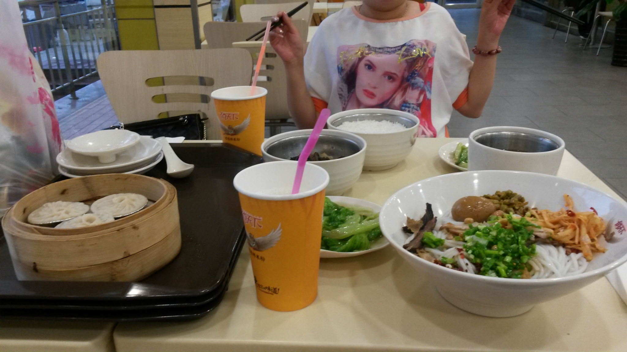 吃完之后在一家挺大的俏天下吃的晚饭,点了一份米粉,一个米饭的套餐,加了一杯饮料喝一份汤包,汤包难吃的不得了,其他的还好,一共花了44。