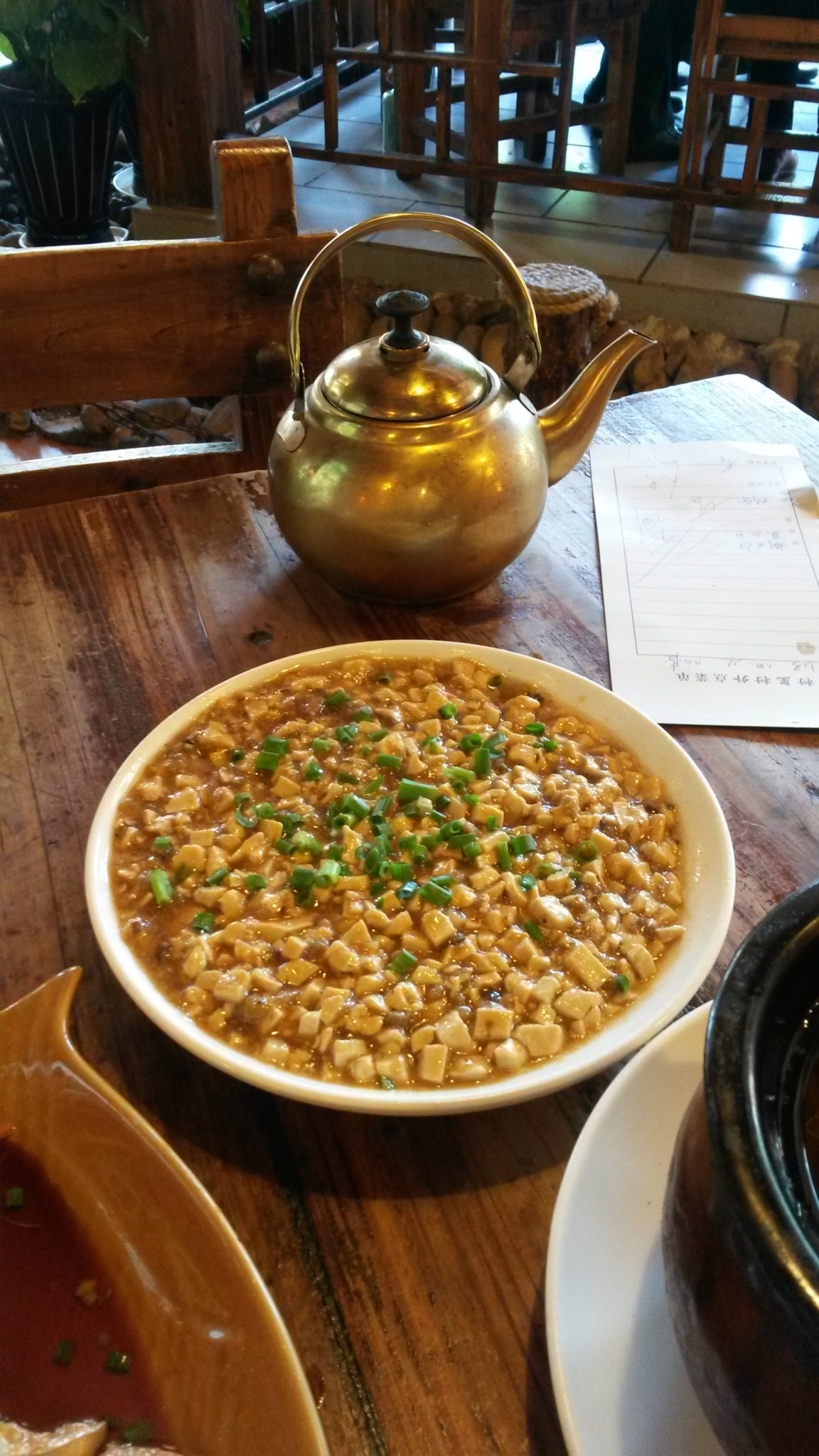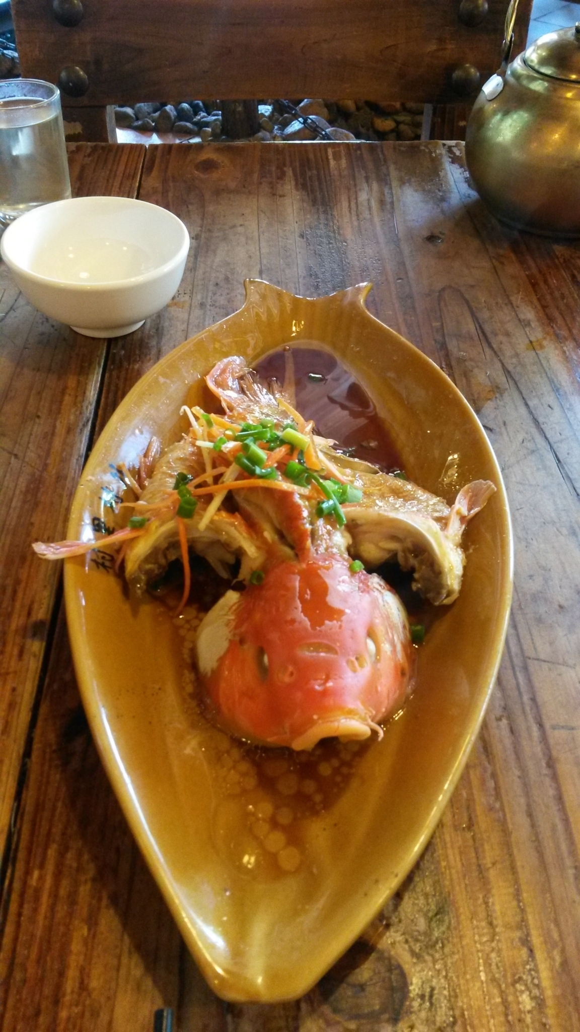 办完入住后就直接去找吃的了,之前看攻略介绍了一家/poi/2802.html{村里村外大碗菜(/poi/2802.html)} ,就在下车那个环岛的边上/travel-scenic-spot/mafengwo/16215.html{东北} 角很明显,我们点了一个荷包红鲤鱼,一个糊豆腐,一个鲜菌瓦罐汤,2份米饭,一共花费85元,味道还可以对北方人来说口味有些偏淡,这也是我们在/travel-scenic-spot/mafengwo/10045.html{婺源} 2天中吃的最好的一顿饭了。