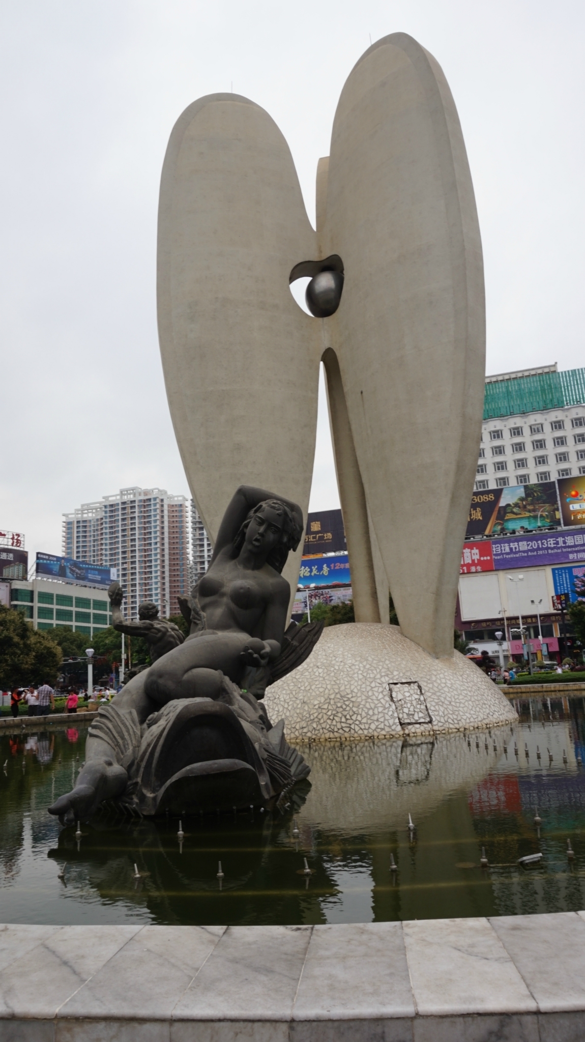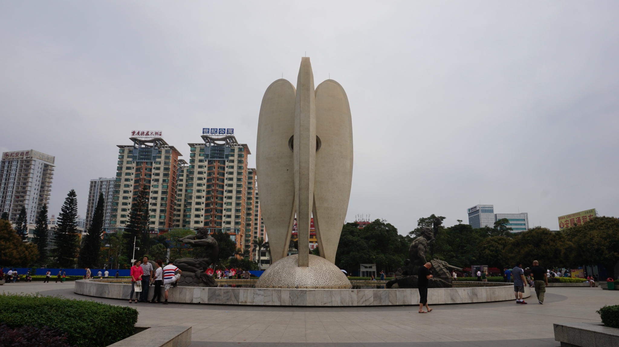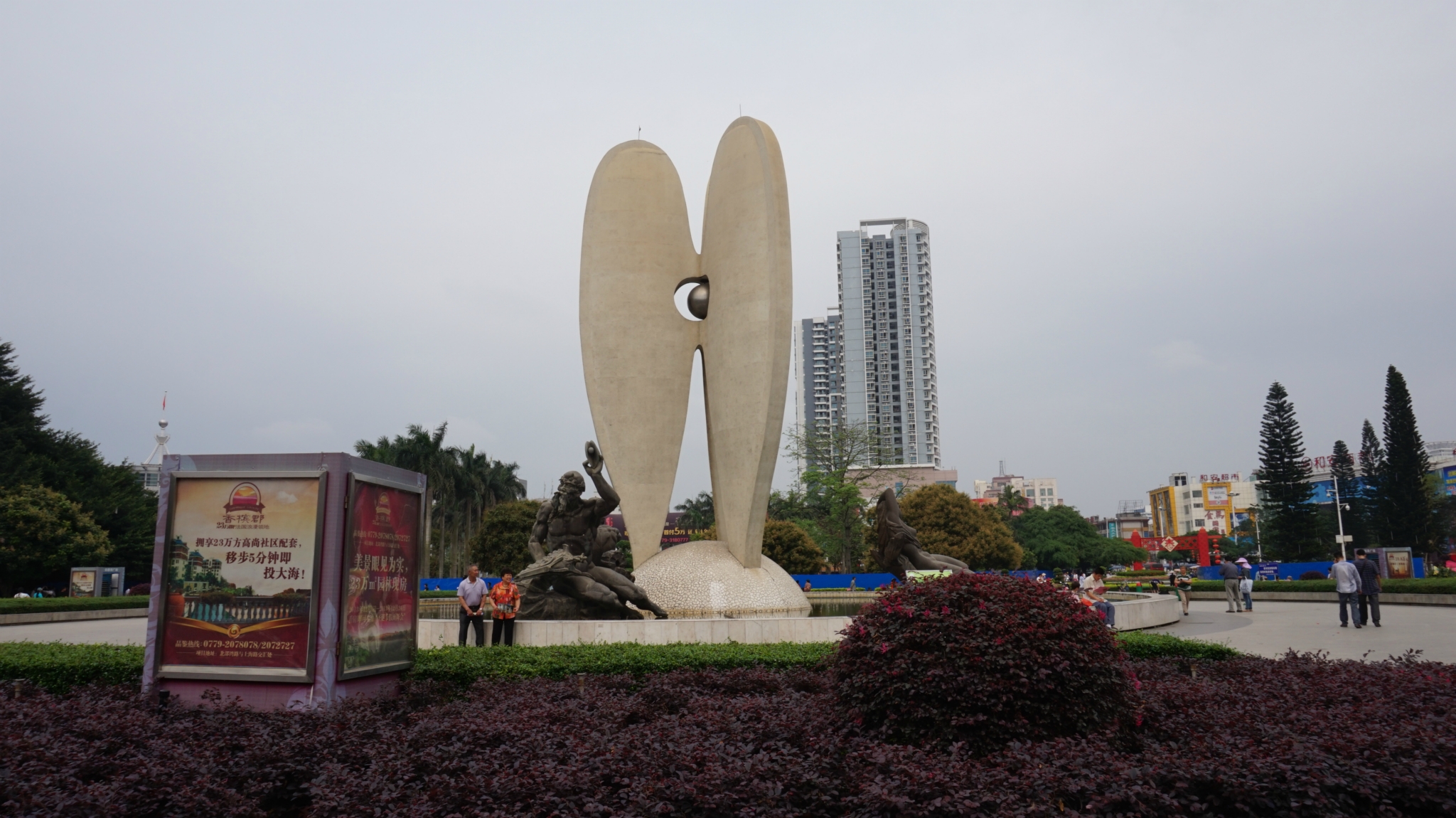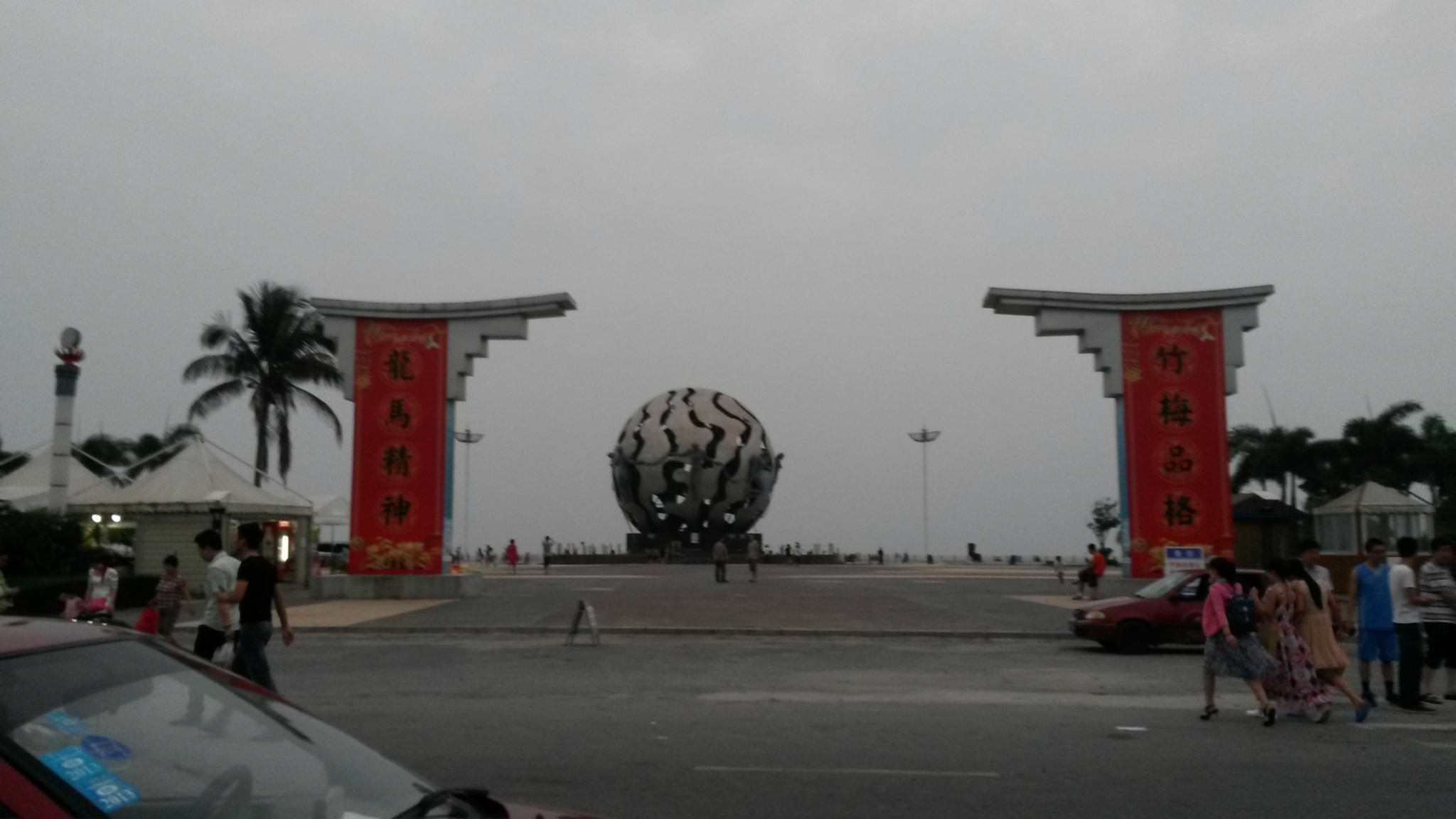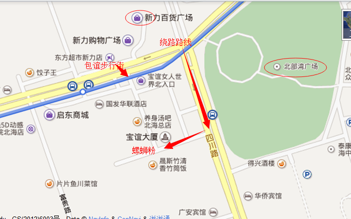 在我们酒店对面坐8路公交车1块钱到新力购物广场下车,左手边对面就是/travel-scenic-spot/mafengwo/11814.html{北部湾} 广场,本来还以为名气那么大规模也应该挺大的,其实特别小,甚至和一些小区的绿化公园差不多大了。