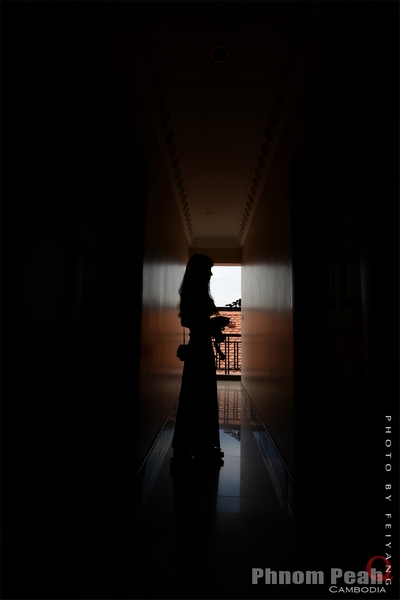 在酒店换完长裙的小Q,楼道里的剪影。