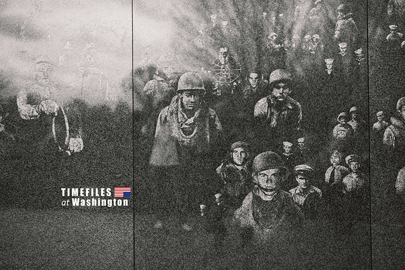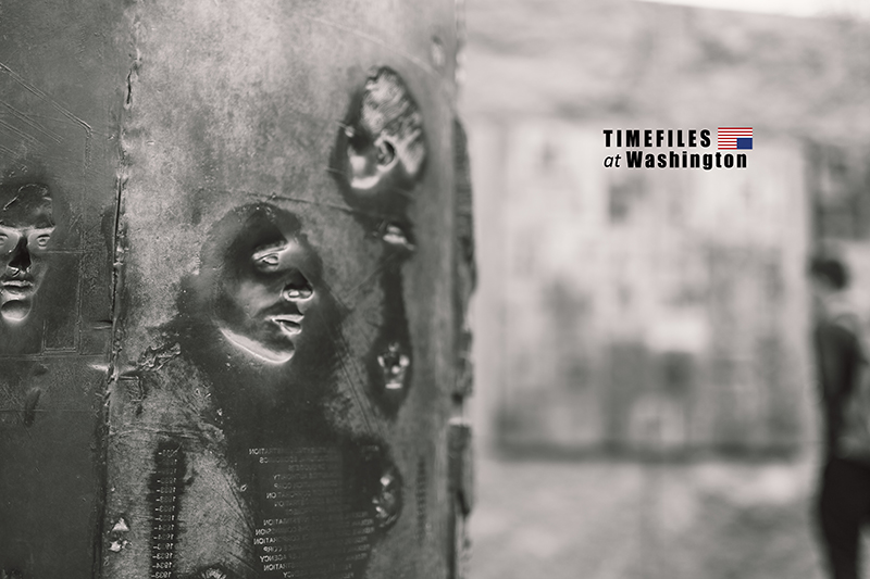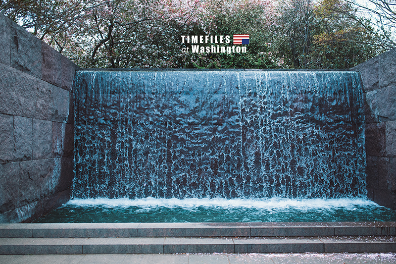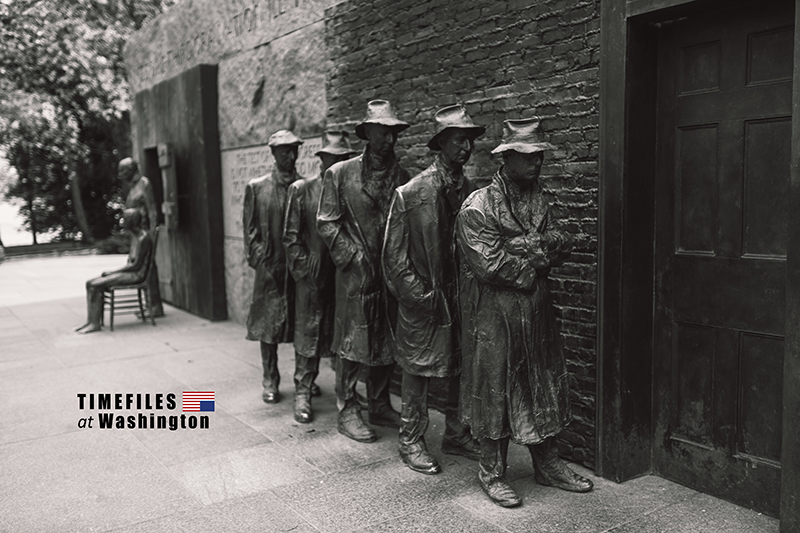 沿着潮汐湖 继续前进,就能看到罗斯 福纪念馆。罗斯福生前推动了美国 社会福利制度的建设,并带领美国走出了经济衰退。所以在华盛顿 的罗斯福纪念馆,我们能看到下面的这个雕塑,它反映了大萧条时人们排队领取救济时的场景。