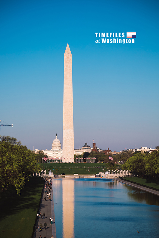 站在林肯纪念堂 楼梯顶上,方尖碑与国会山 正好映在反思池 里