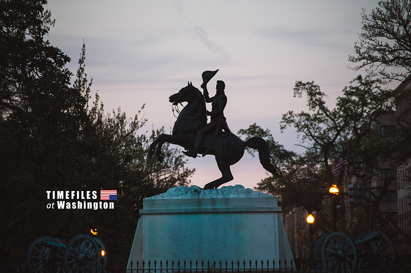 太阳落山了,白宫 门前的杰佛逊总统雕像似乎也在向我们说再见了