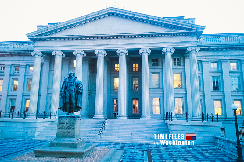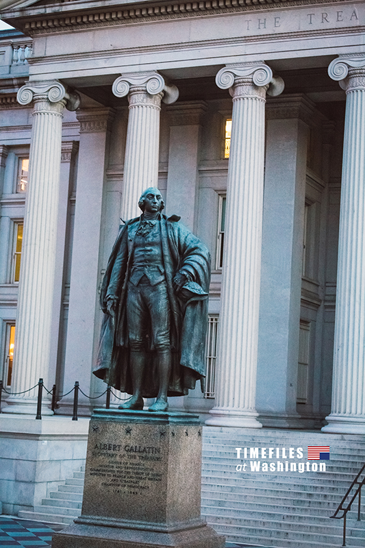 门口的雕像正是美国 第一任财长——亚历山大 ·汉密尔顿 。