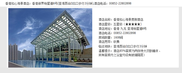 我们前三晚住在荃湾的如心海景度假酒店,在TB上的定的。前一阵有说在携程上预定酒店,付款后没房间的事。这点taobao还是比较靠谱的,周五、周六、周天的房价一般会比平时高,如心酒店的房价预定确定后是不能取消的。