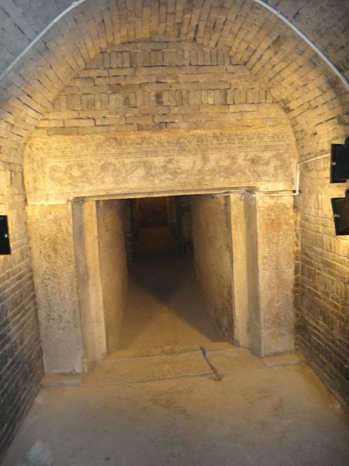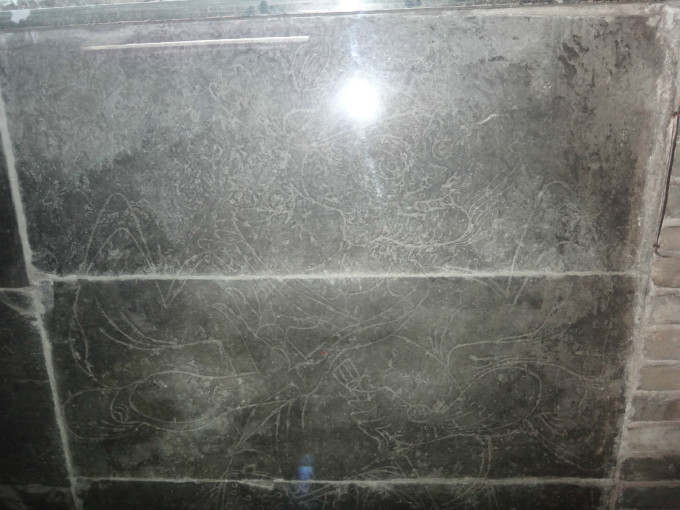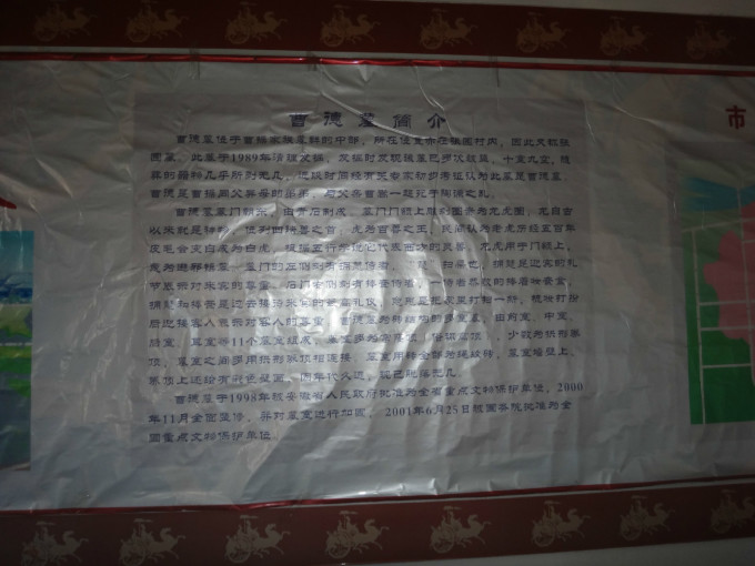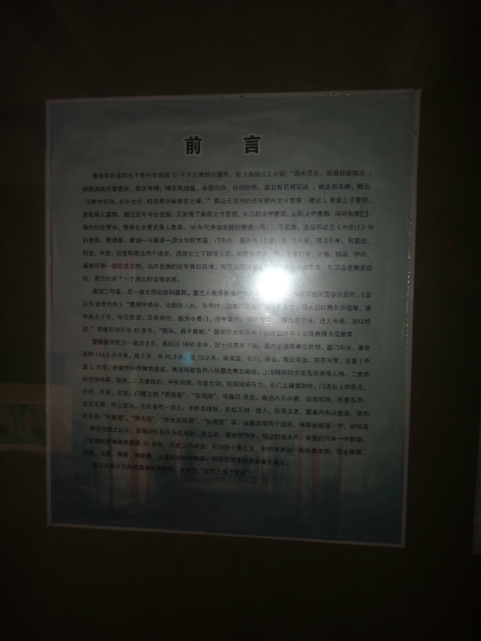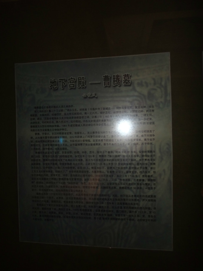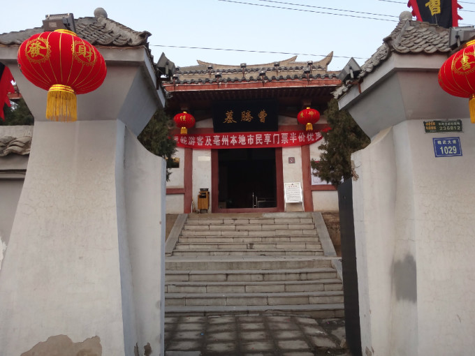 马路对面的曹德墓。曹德是曹操同父异母的弟弟。曹德墓又叫/poi/5431497.html{张园汉墓} ,有前室、中室、后室、耳室等11个墓室组成,全部用绳纹砖筑砌。墓门向东,为石结构,门额、门框、门扇均饰有画像石刻。门额雕刻龙虎图,意为避邪镇墓。门框南旁雕刻拥慧侍者。慧,扫帚也,《史记高祖本记》载“太公拥慧迎门却行”,拥慧是迎宾的礼节,表示对/travel-scenic-spot/mafengwo/13048.html{来宾} 的尊重。门框北侧雕捧奁侍者,一侍仆恭敬的捧着妆奁盒。