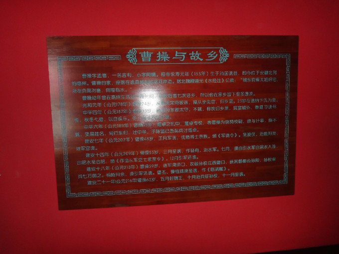 /poi/5427570.html{曹操纪念馆} ,位于/travel-scenic-spot/mafengwo/20566.html{亳州} 市中心,曹操公园内。曹操在/travel-scenic-spot/mafengwo/20566.html{亳州} 城东还有故居,至今还留有遗迹,现在/travel-scenic-spot/mafengwo/20566.html{亳州} 正准备招商引资再次修建。我用的联票,不知道这里的票价,这里和所有/travel-scenic-spot/mafengwo/20566.html{亳州} 主要景点一样当时都是属蛇游客半价。纪念馆是现代/travel-scenic-spot/mafengwo/66306.html{新建} 的。