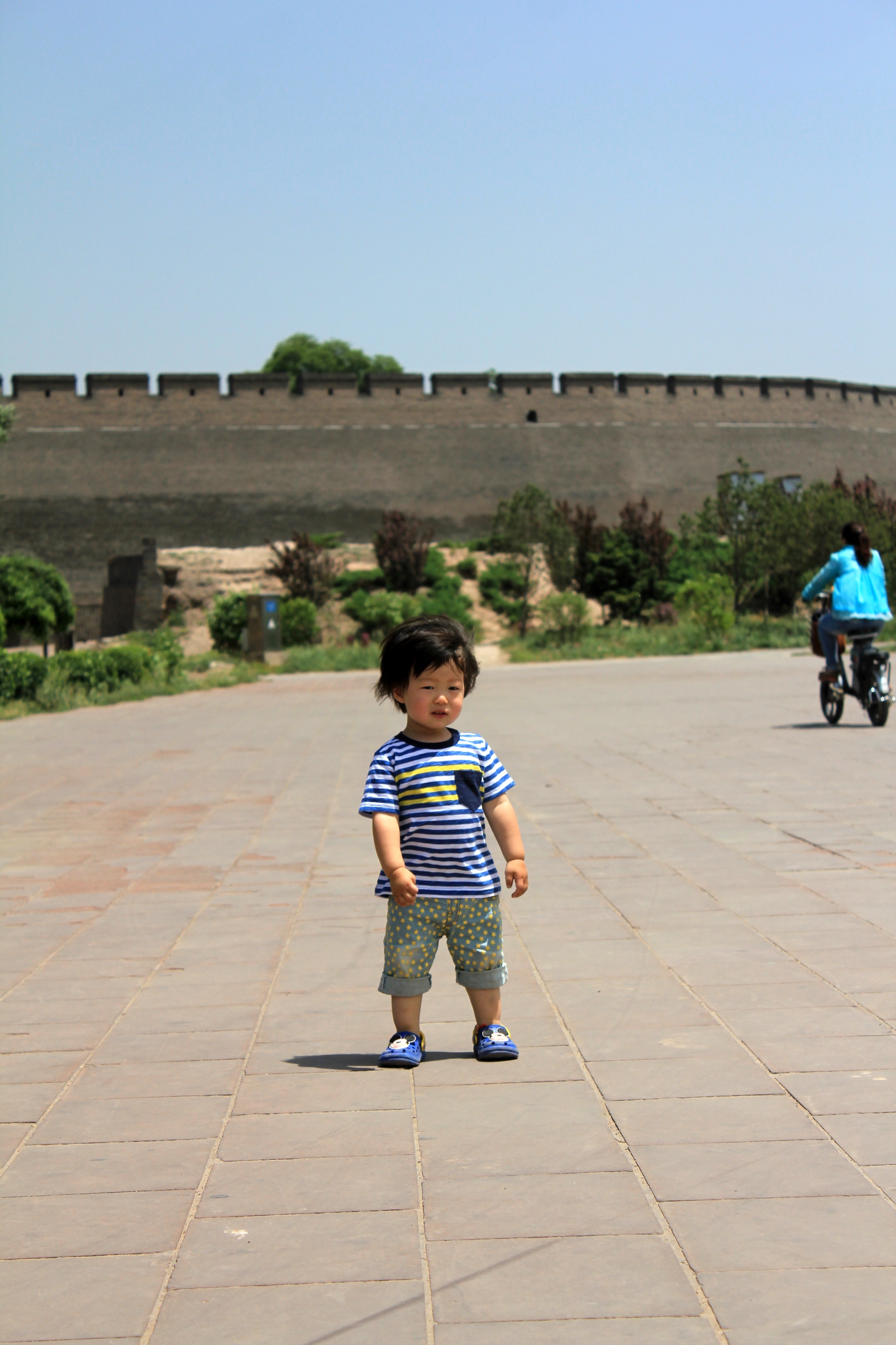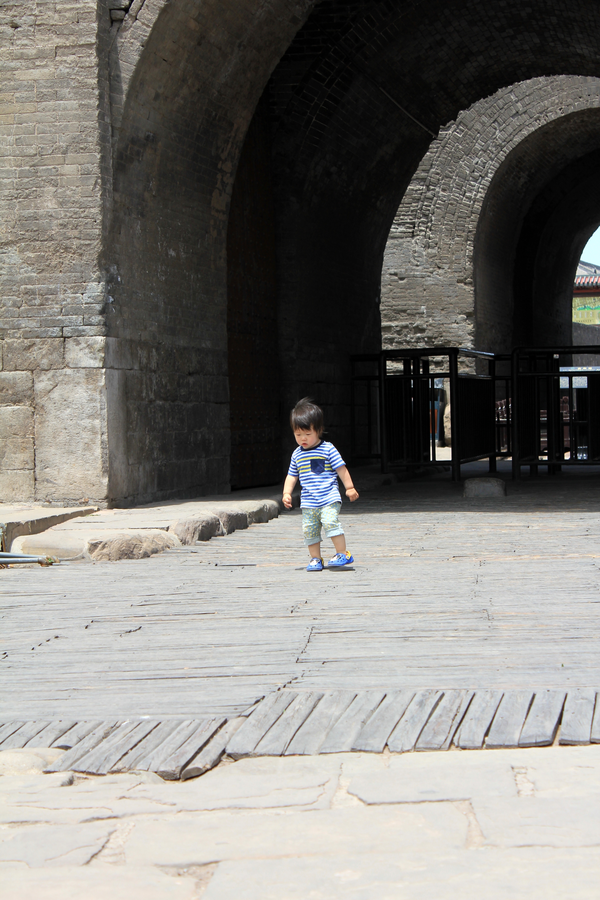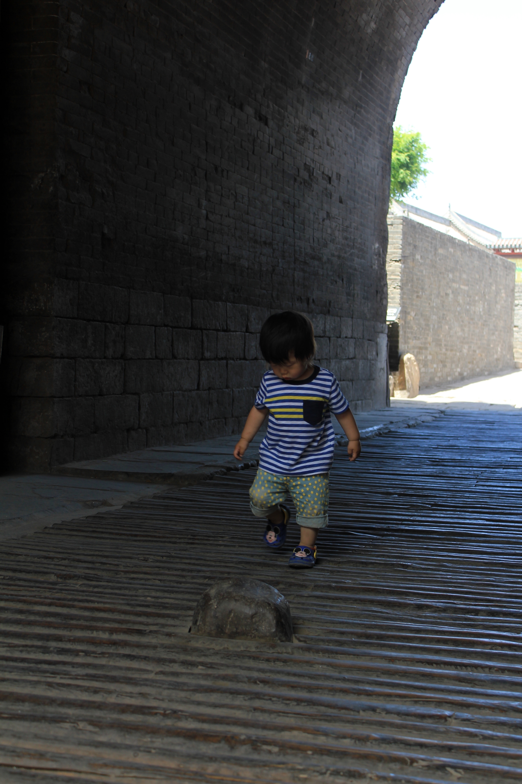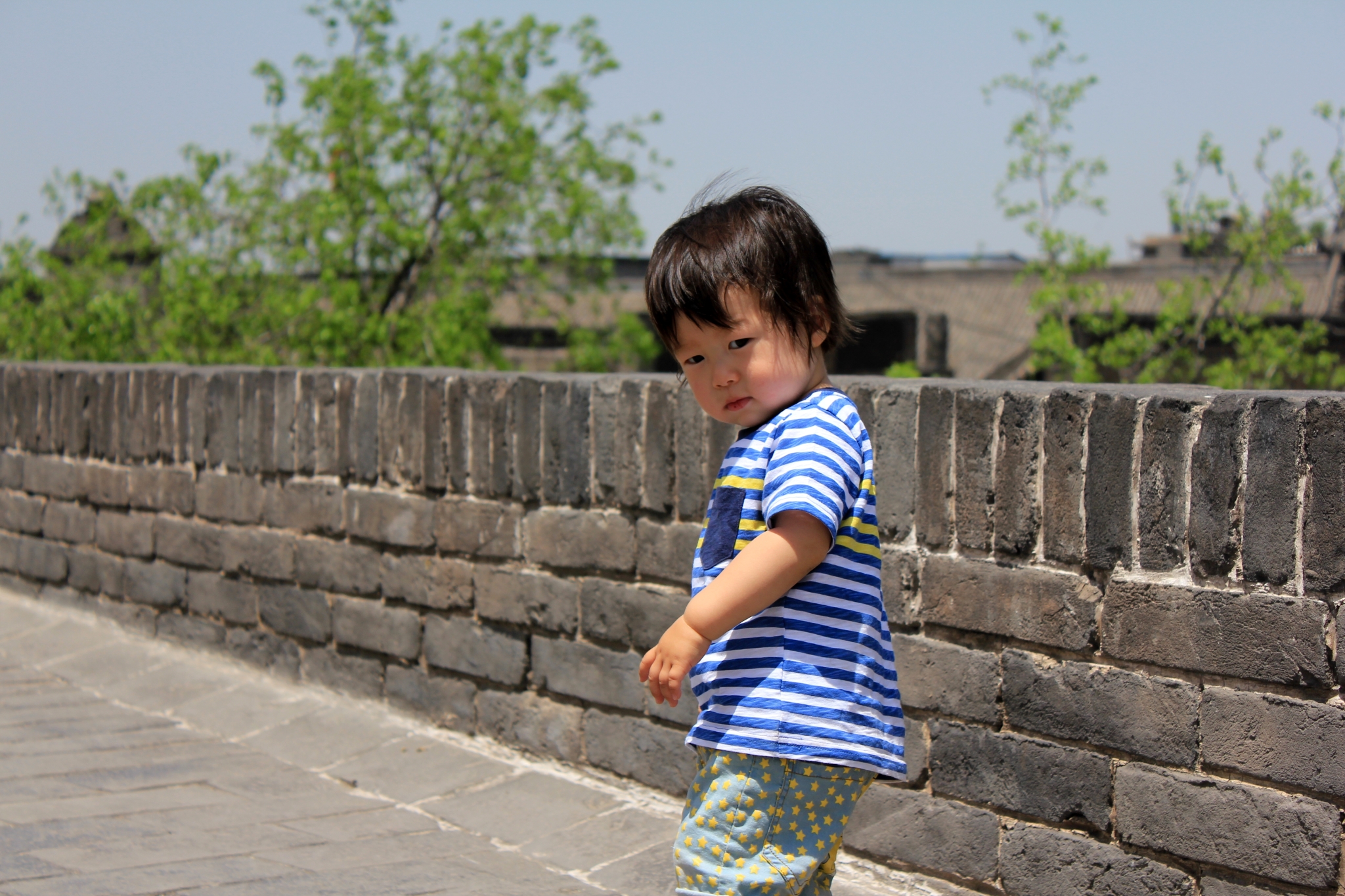 这样完整的城墙全国貌似只剩下四座了,而城墙里面是古镇的,只有平遥 一座了。上去的时候eason依旧要自己爬可是刚上去不就就困了,要睡觉了。我们只好匆匆下去,还没有下去就倒在我怀里睡着了。
