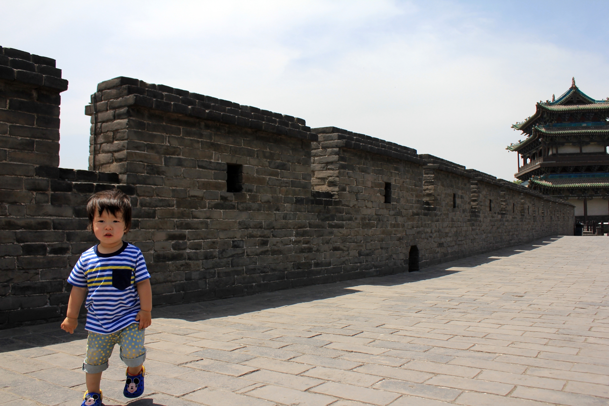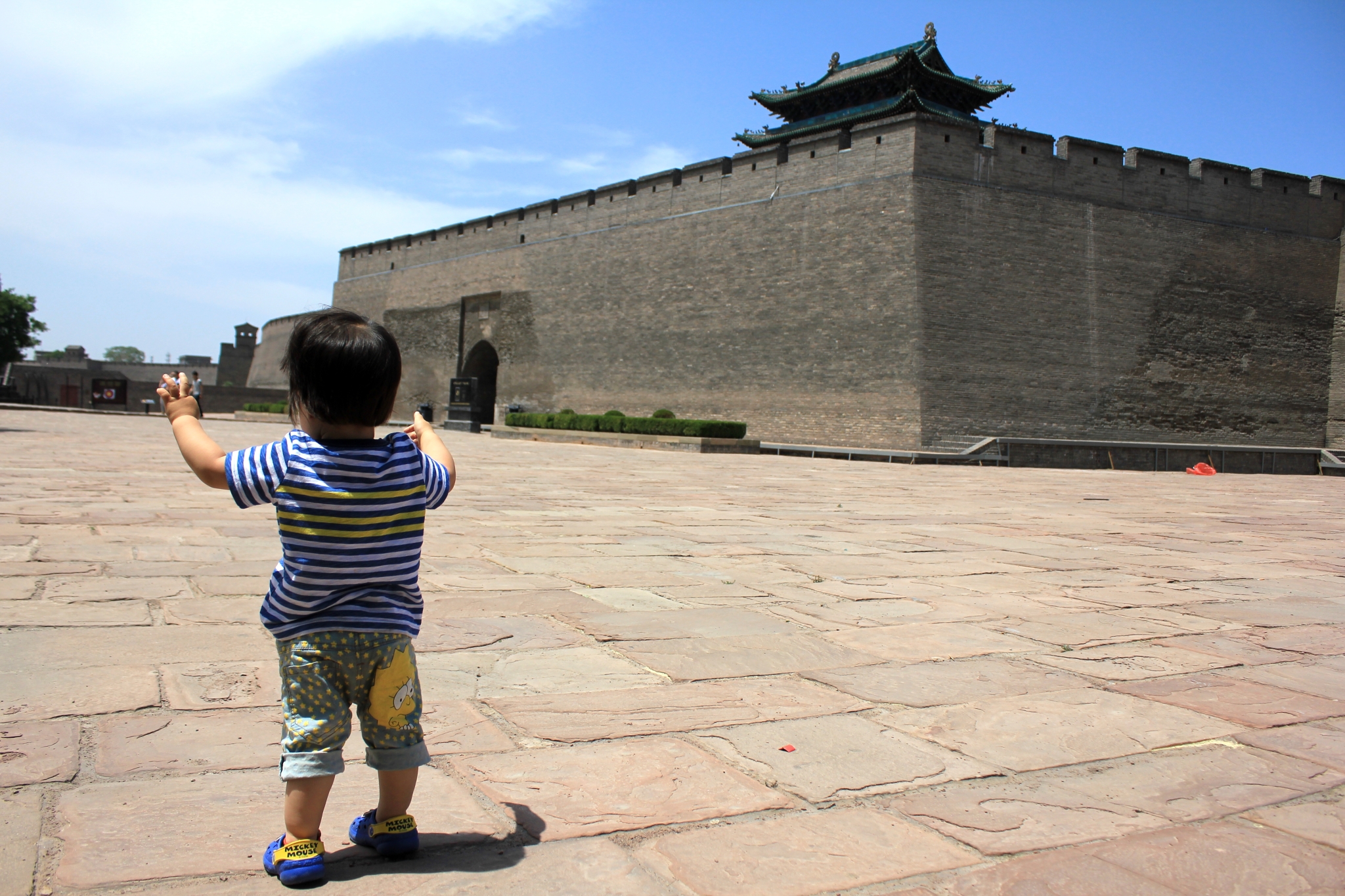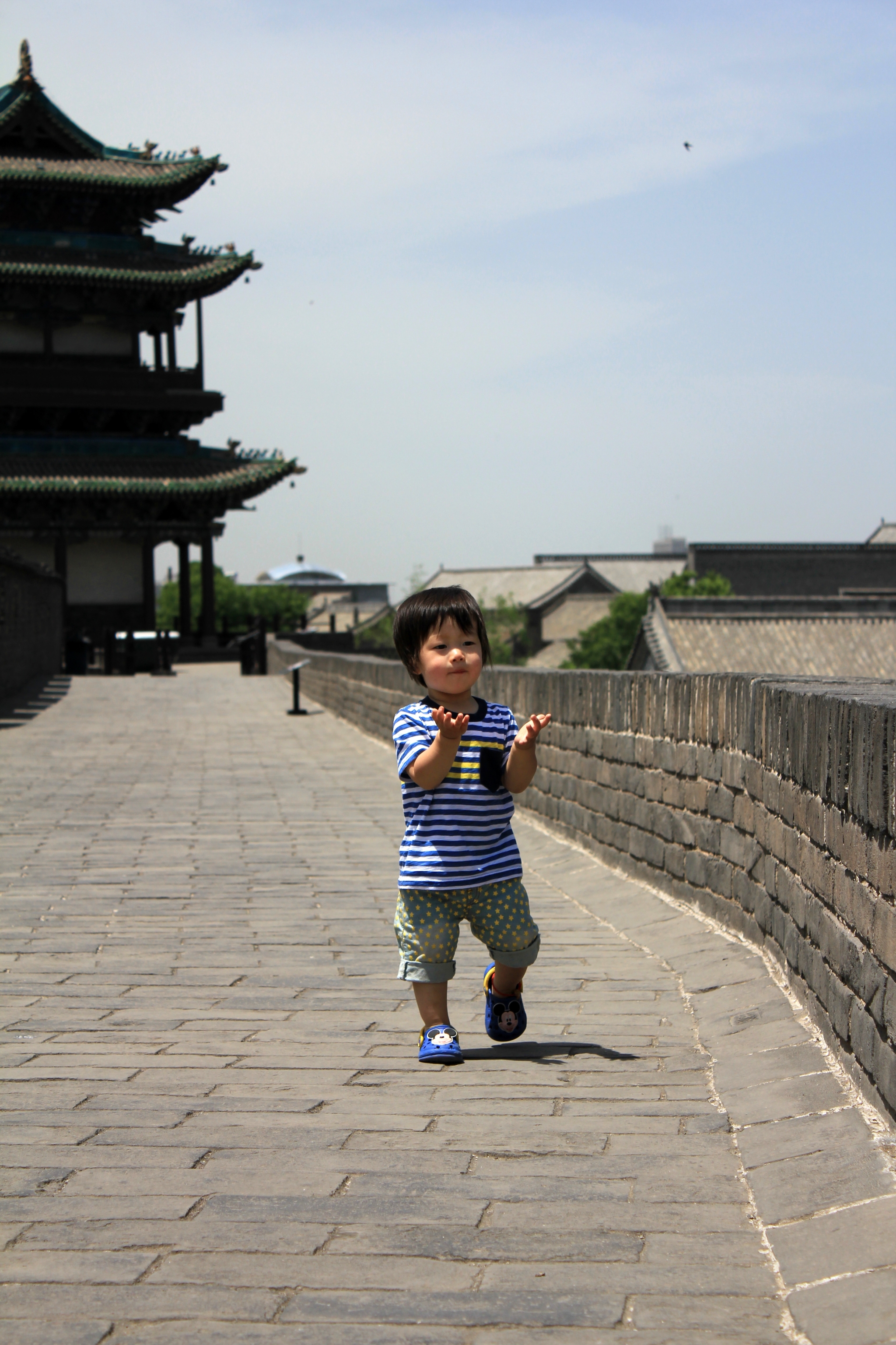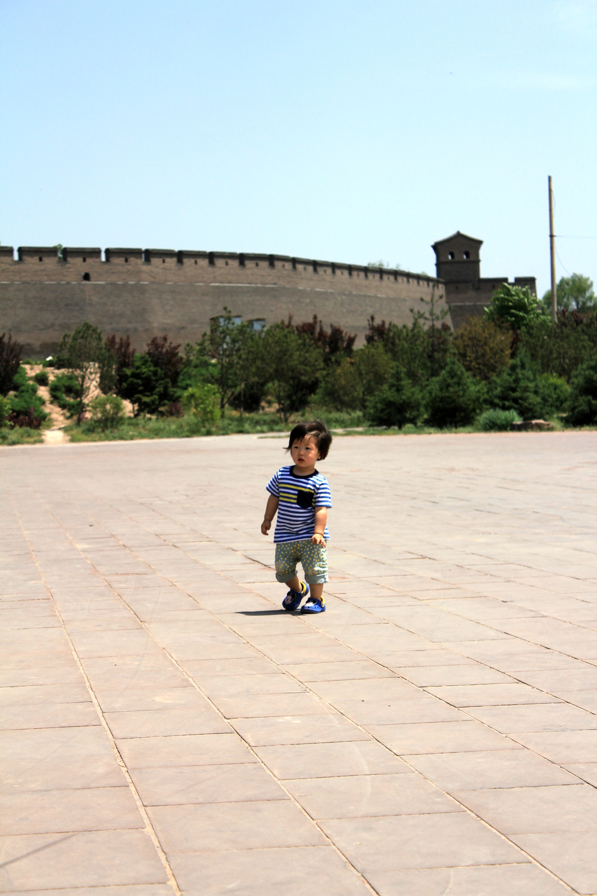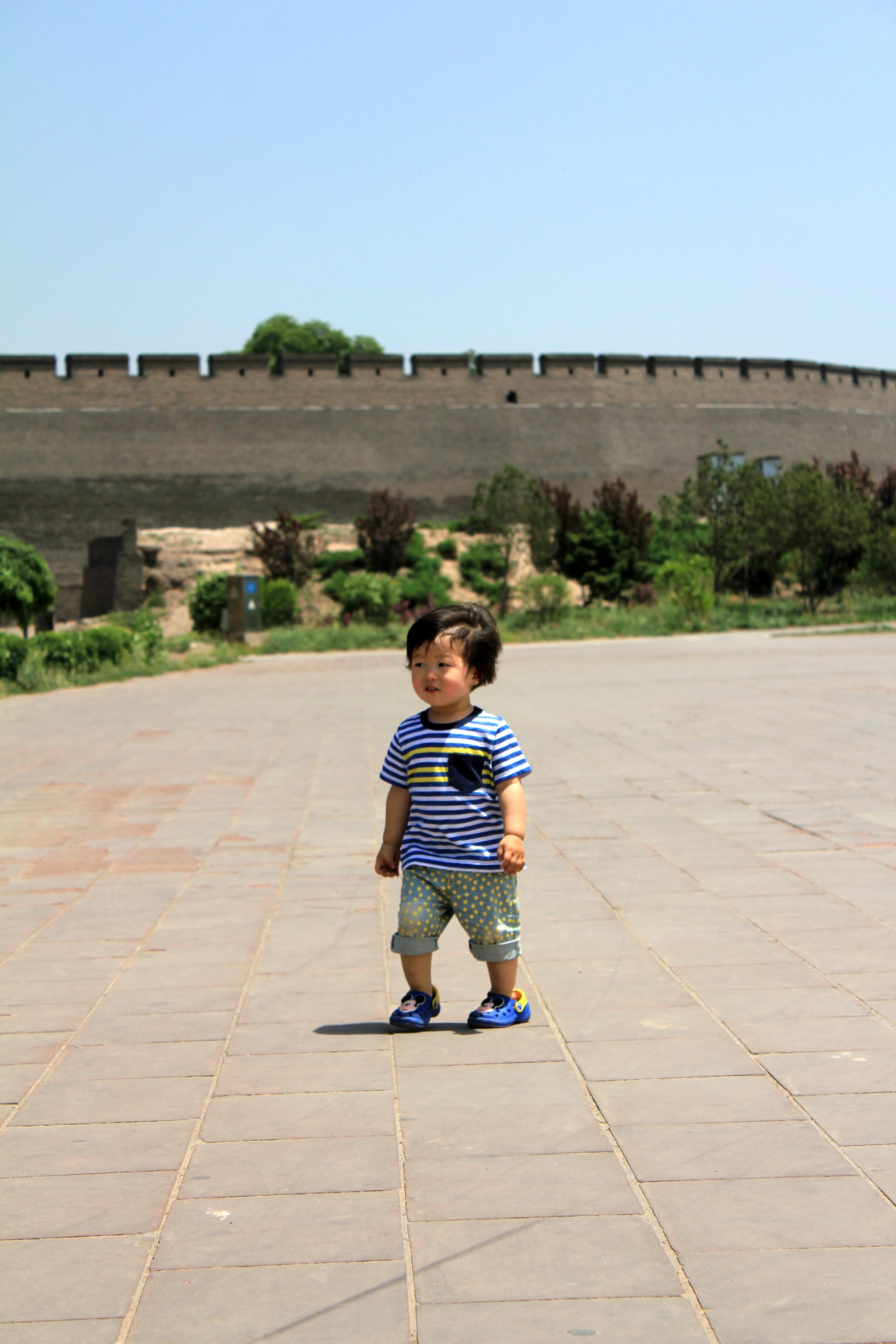 这样完整的城墙全国貌似只剩下四座了,而城墙里面是古镇的,只有平遥 一座了。上去的时候eason依旧要自己爬可是刚上去不就就困了,要睡觉了。我们只好匆匆下去,还没有下去就倒在我怀里睡着了。