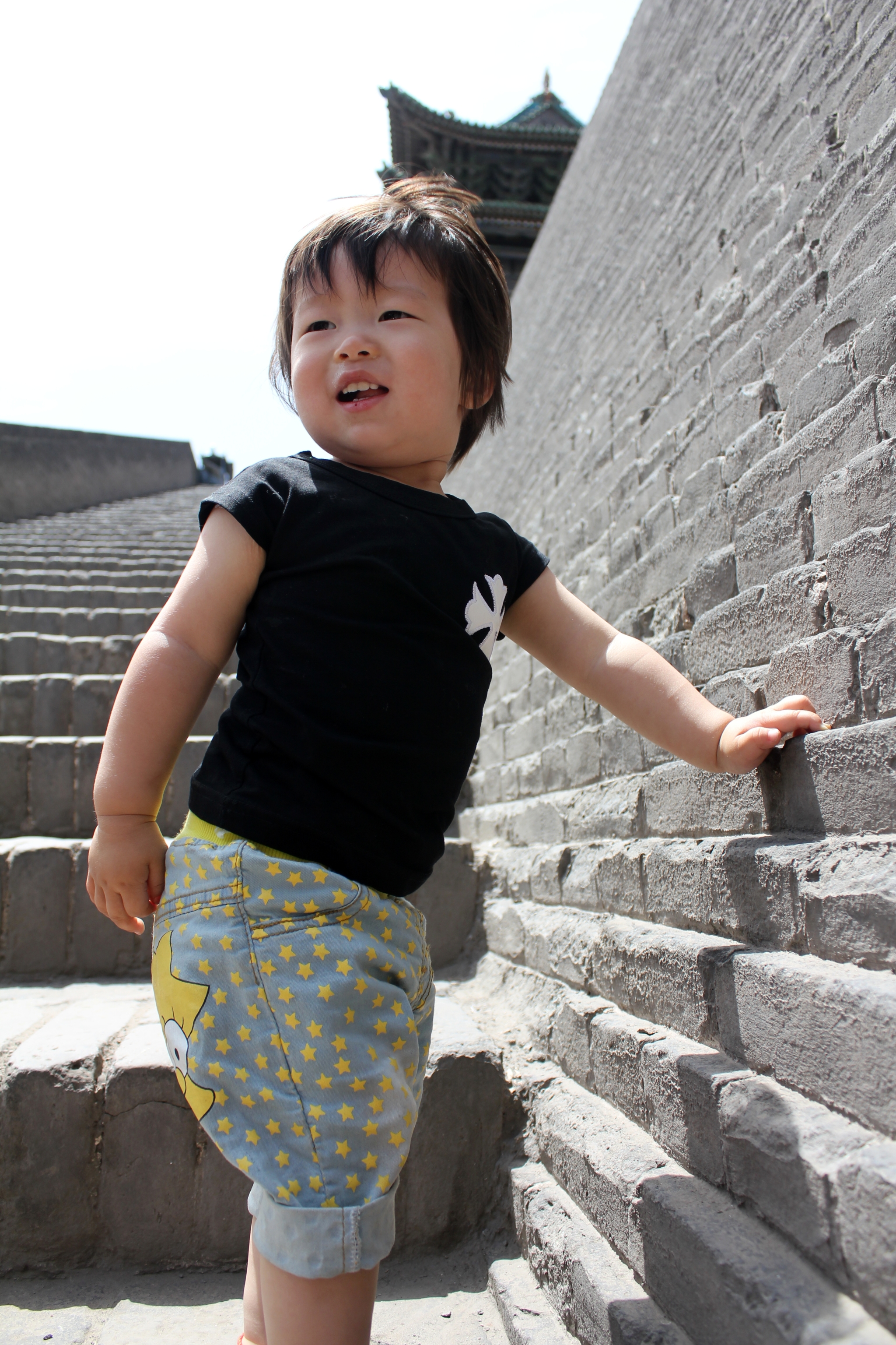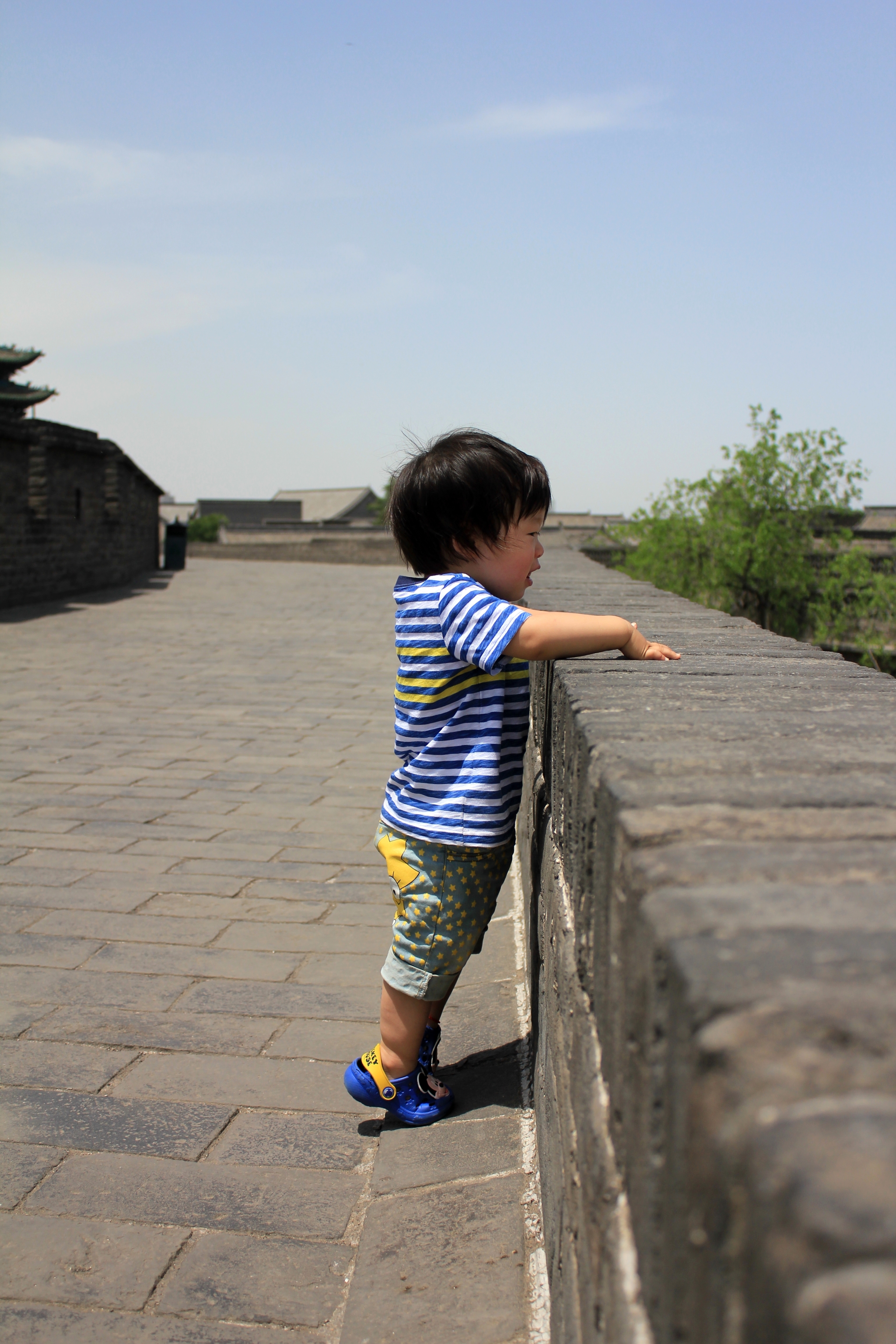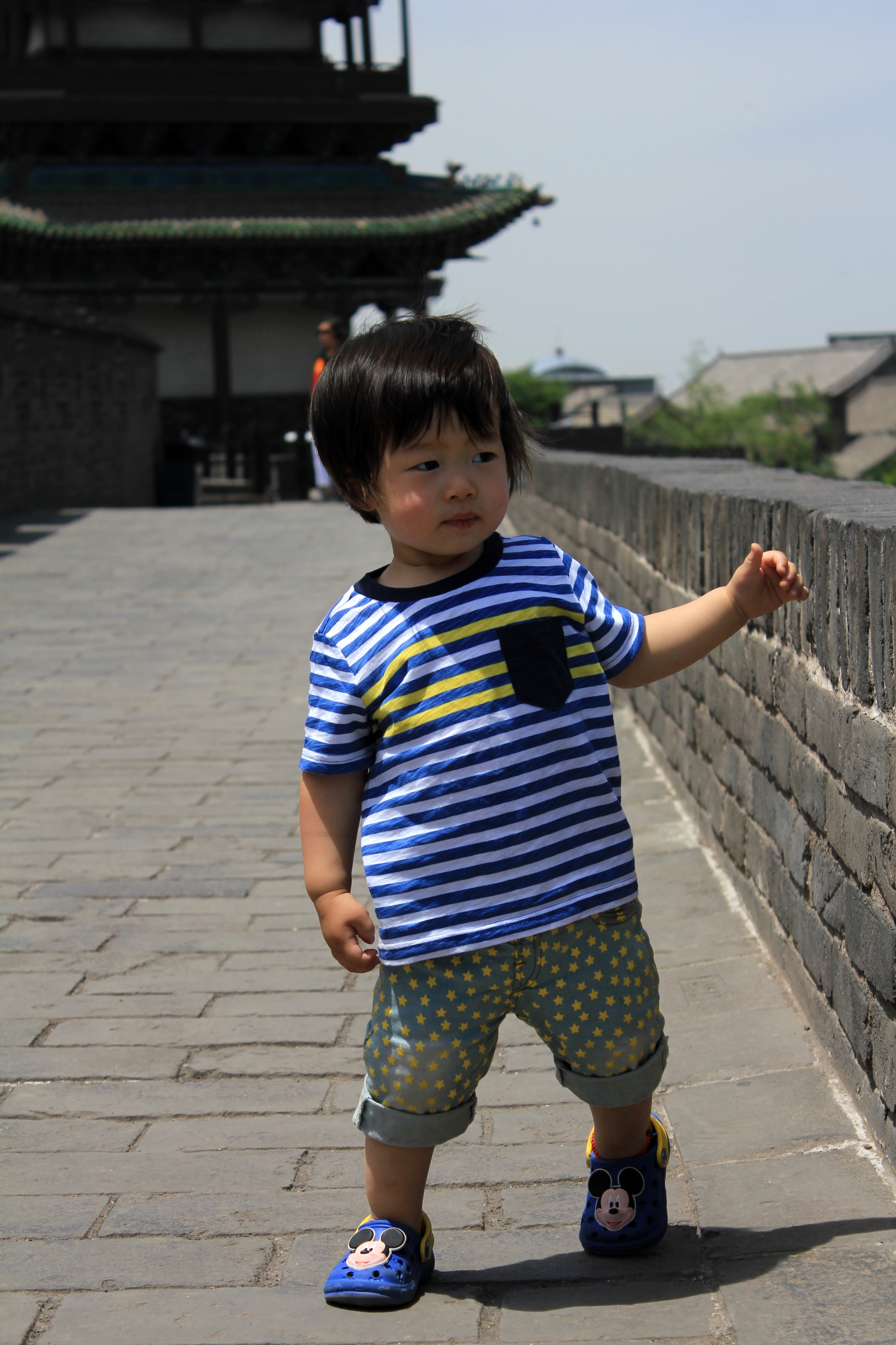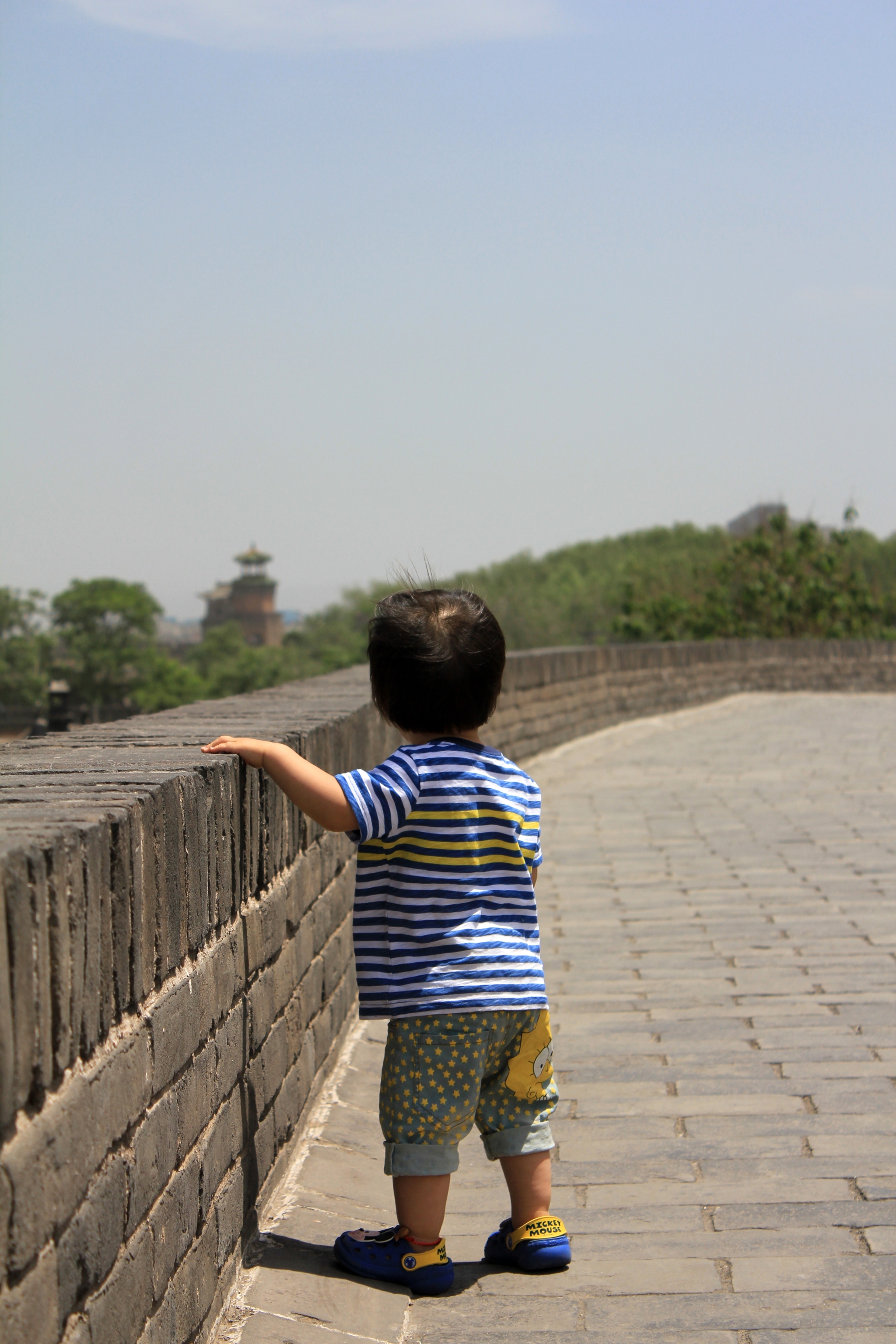 这样完整的城墙全国貌似只剩下四座了,而城墙里面是古镇的,只有平遥 一座了。上去的时候eason依旧要自己爬可是刚上去不就就困了,要睡觉了。我们只好匆匆下去,还没有下去就倒在我怀里睡着了。