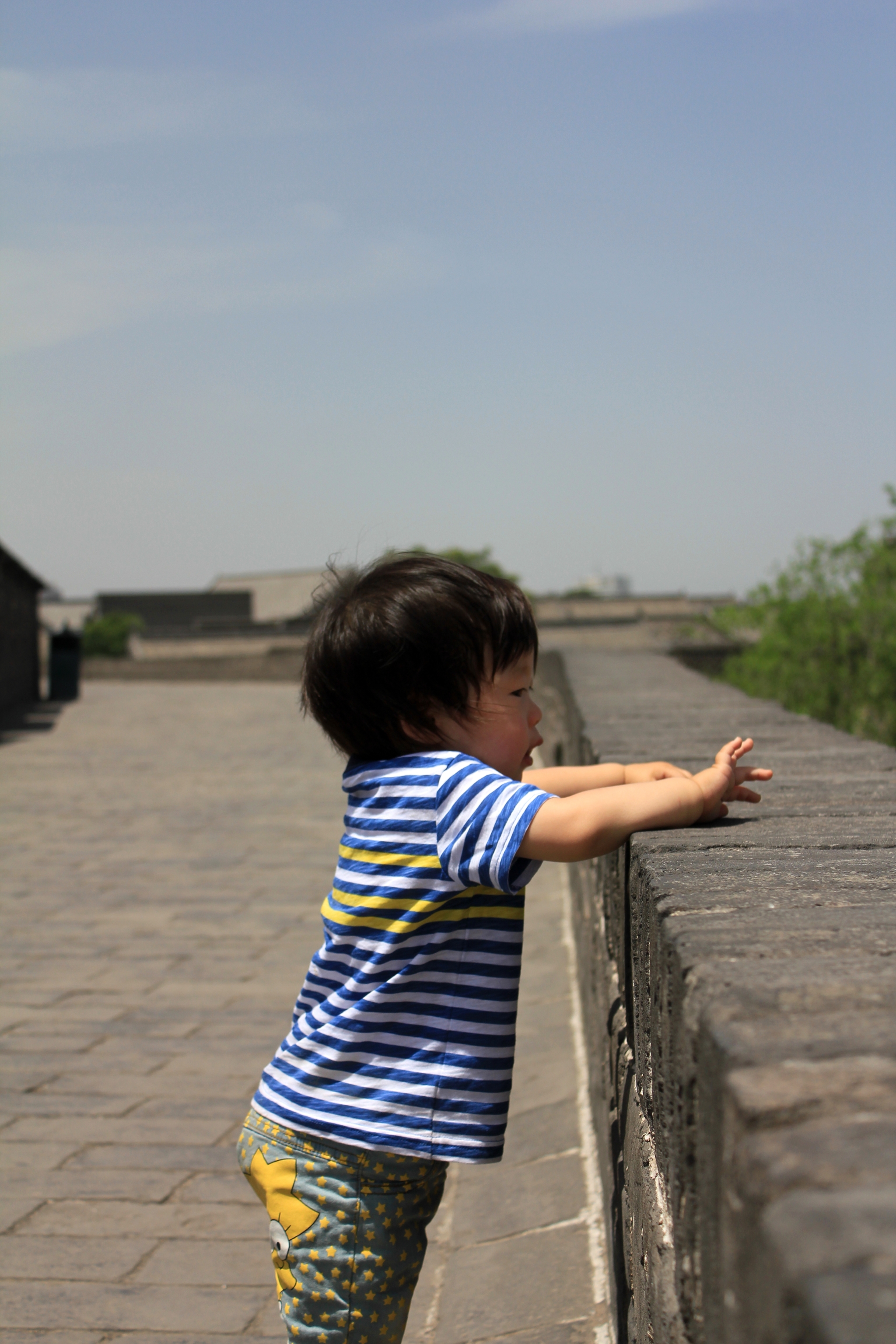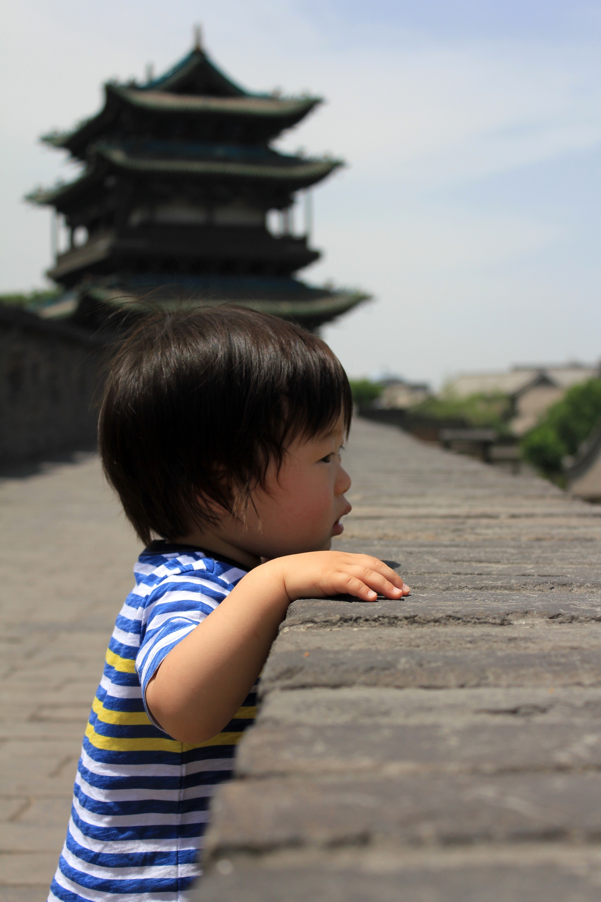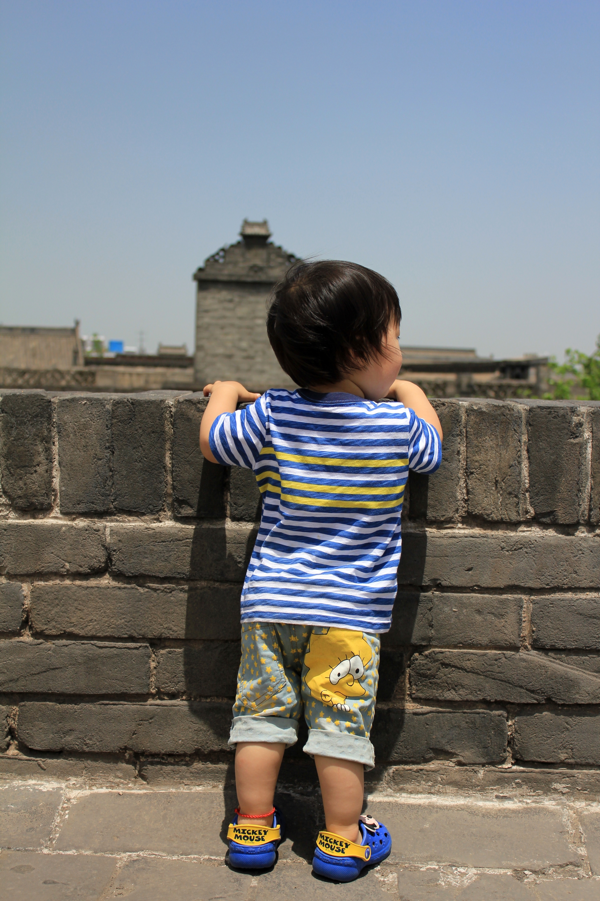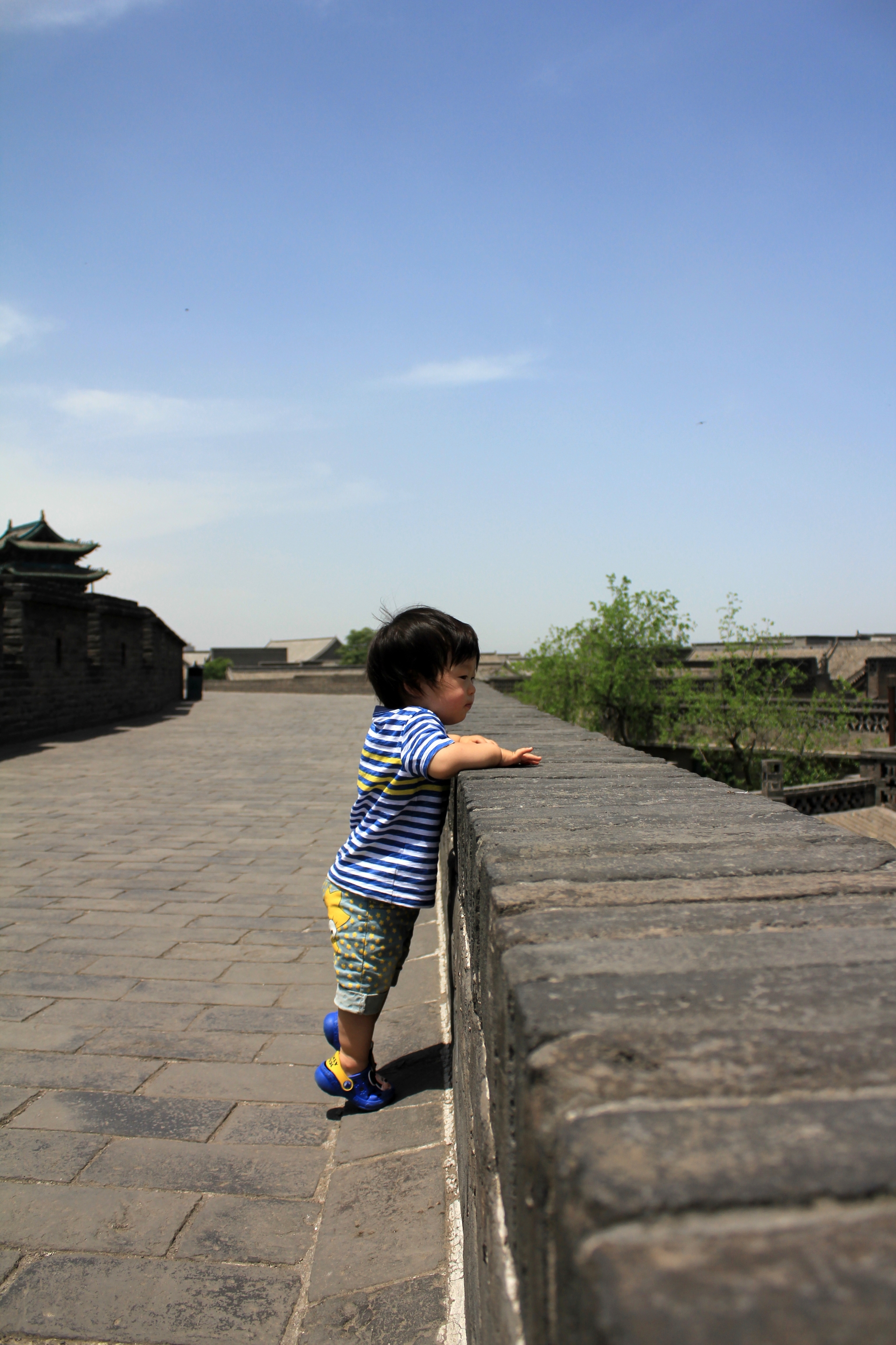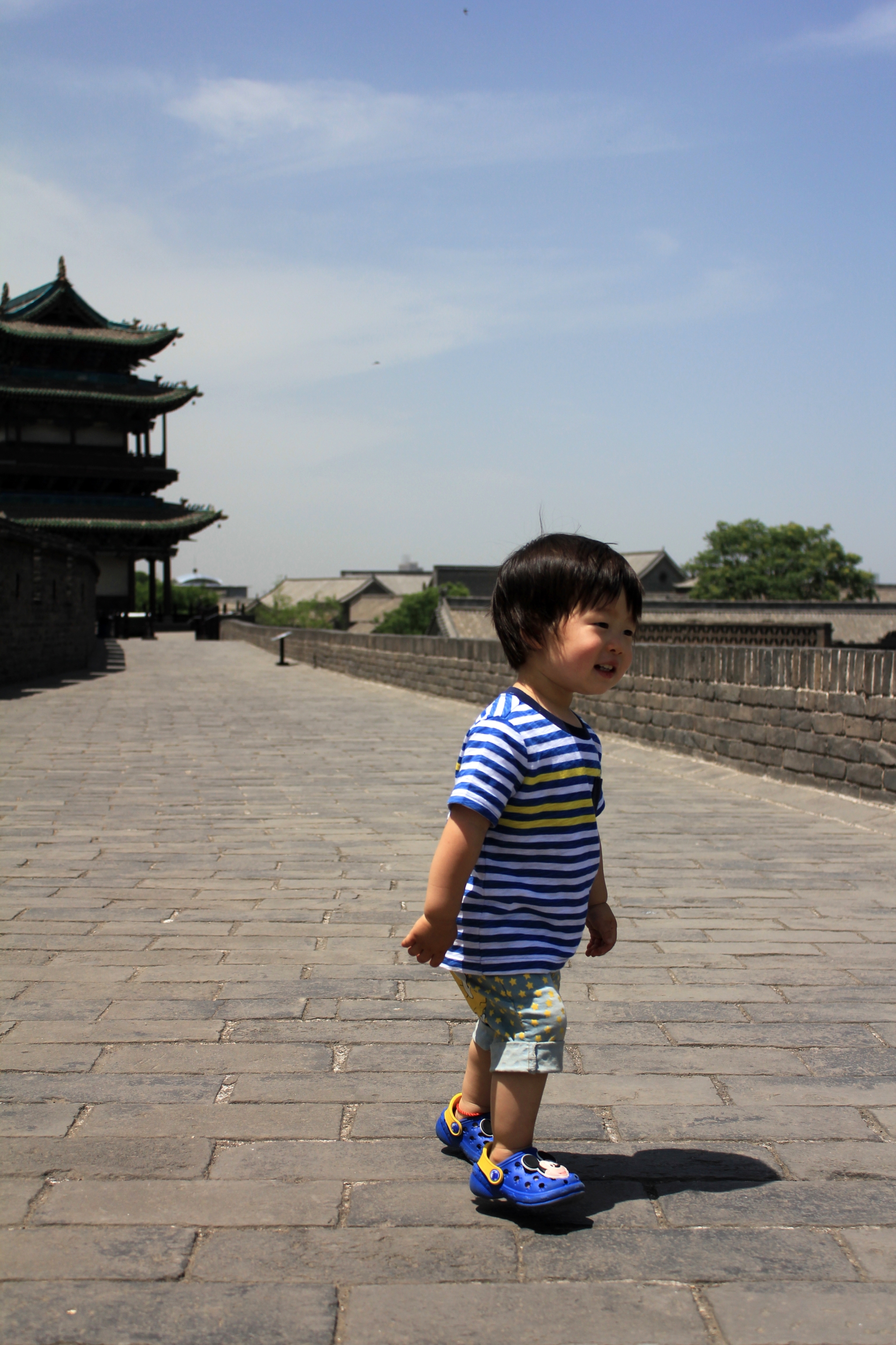 这样完整的城墙全国貌似只剩下四座了,而城墙里面是古镇的,只有平遥 一座了。上去的时候eason依旧要自己爬可是刚上去不就就困了,要睡觉了。我们只好匆匆下去,还没有下去就倒在我怀里睡着了。