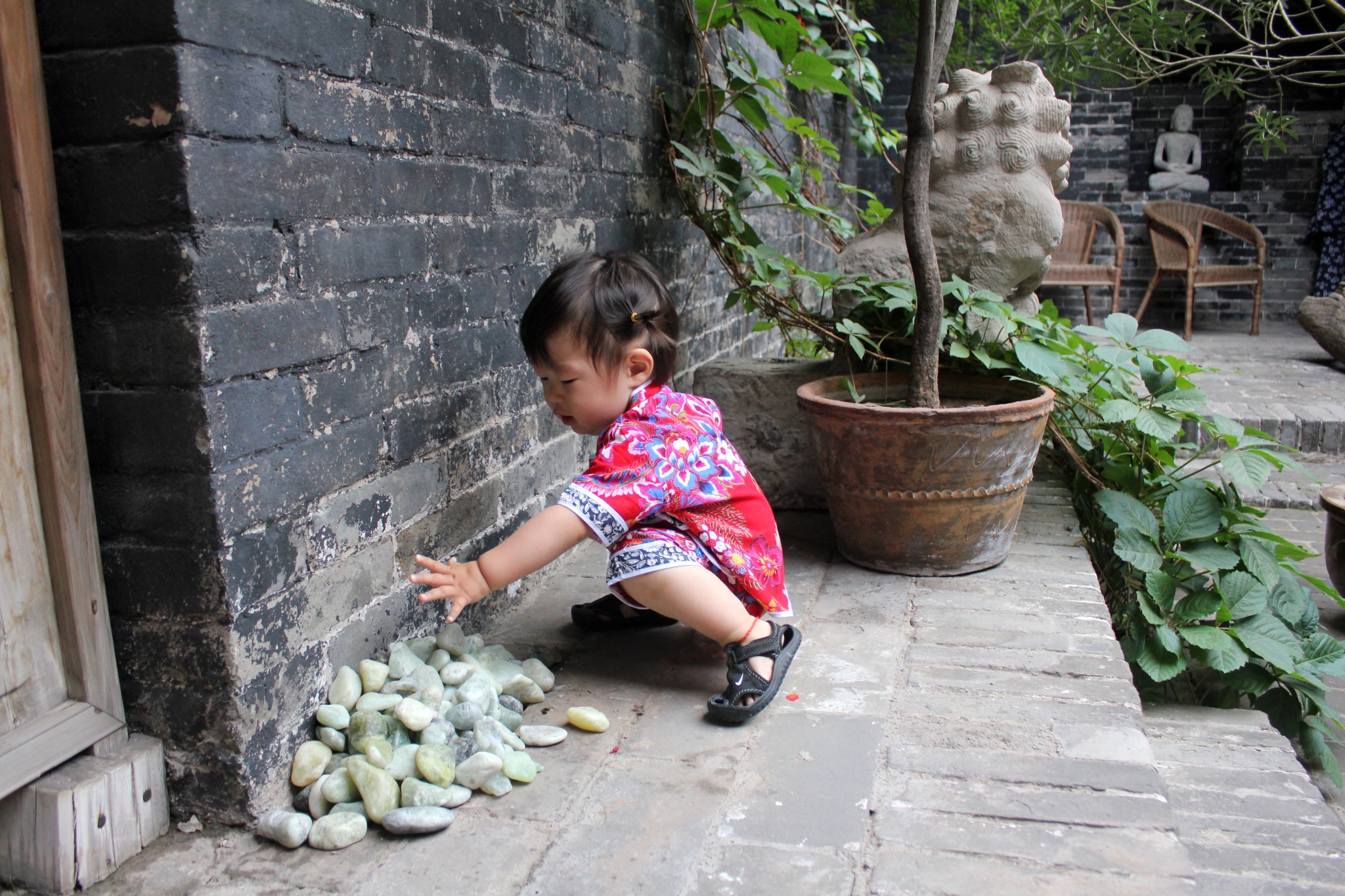 不知道几号房的门口用绿色的鹅卵石堆砌的小景,入了他的眼。就搬来搬去了,我就坐在旁边看着他。心里想着要是有这么个小闺女养在这个阳光小院,挺好的。