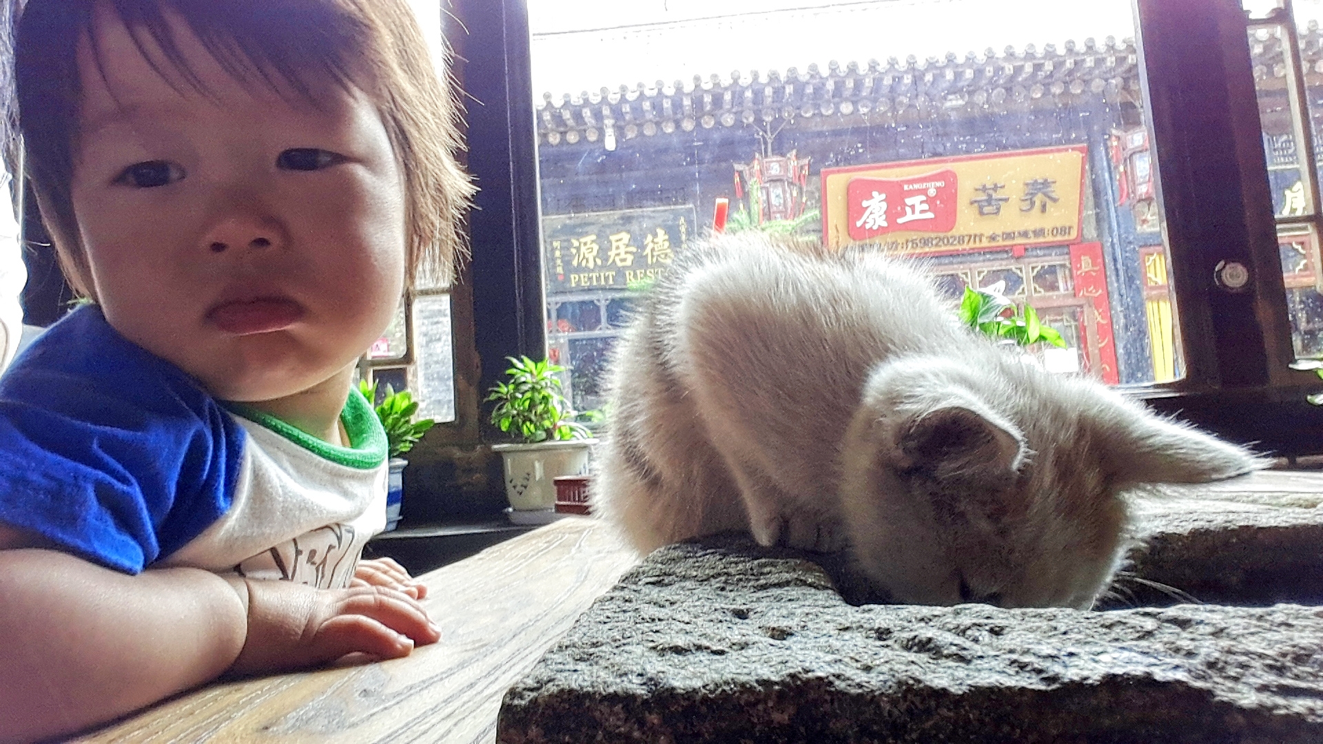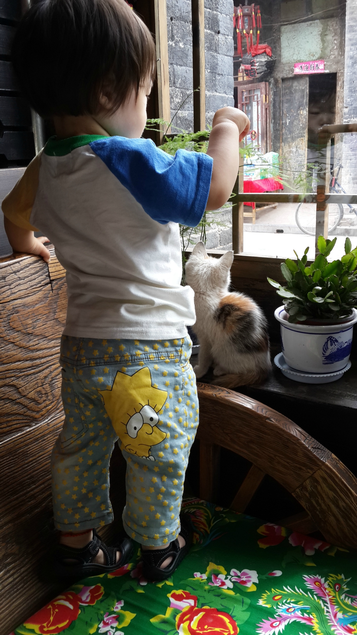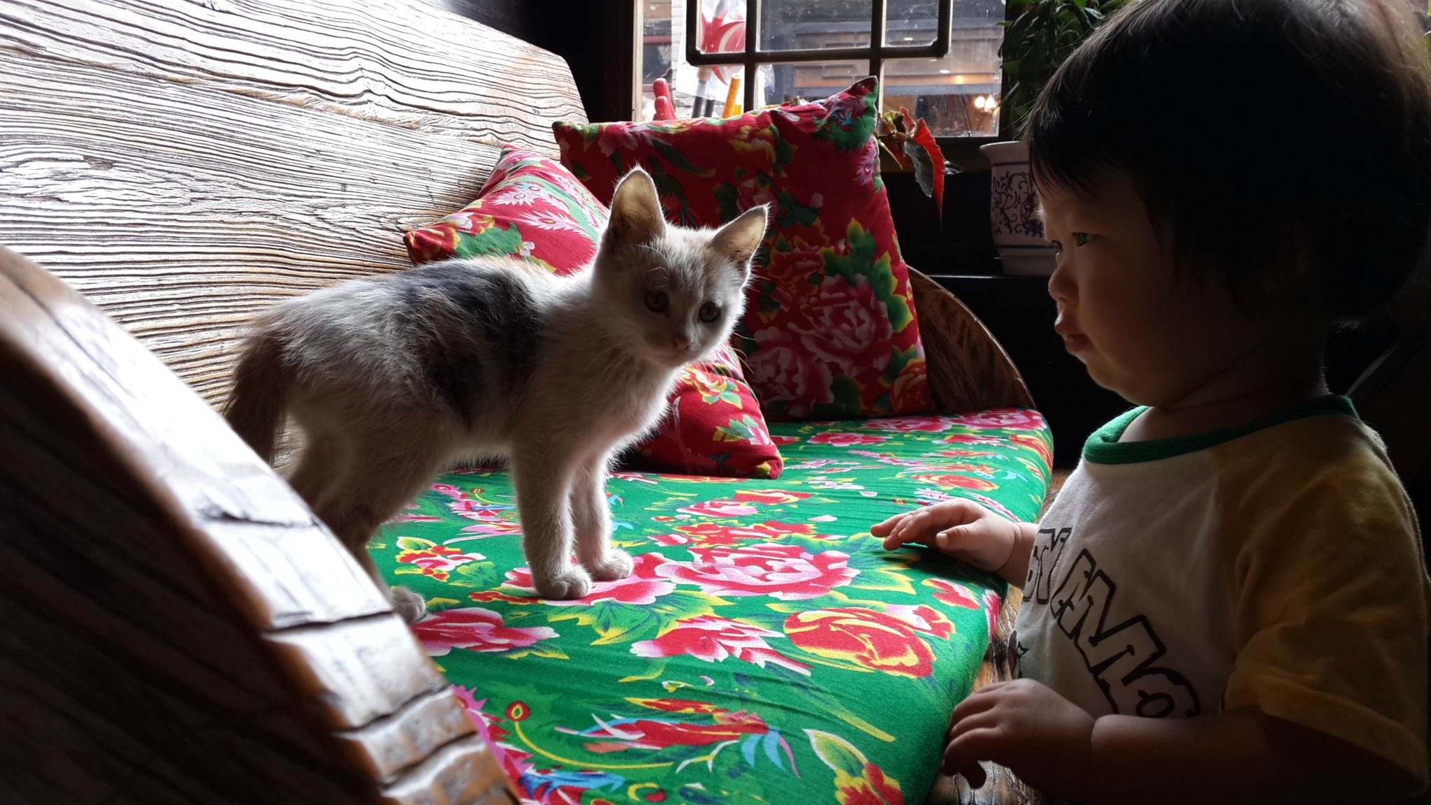 收拾一下去吃早餐,推开门小院的清晨好安静啊。客栈前面就是餐厅酒吧,境外人很多, 我们点了一份早餐,阳光下的座椅上小奶猫在懒懒的晒太阳,小奶娃貌似很happy的跟它玩耍。这样的日子,真好!!