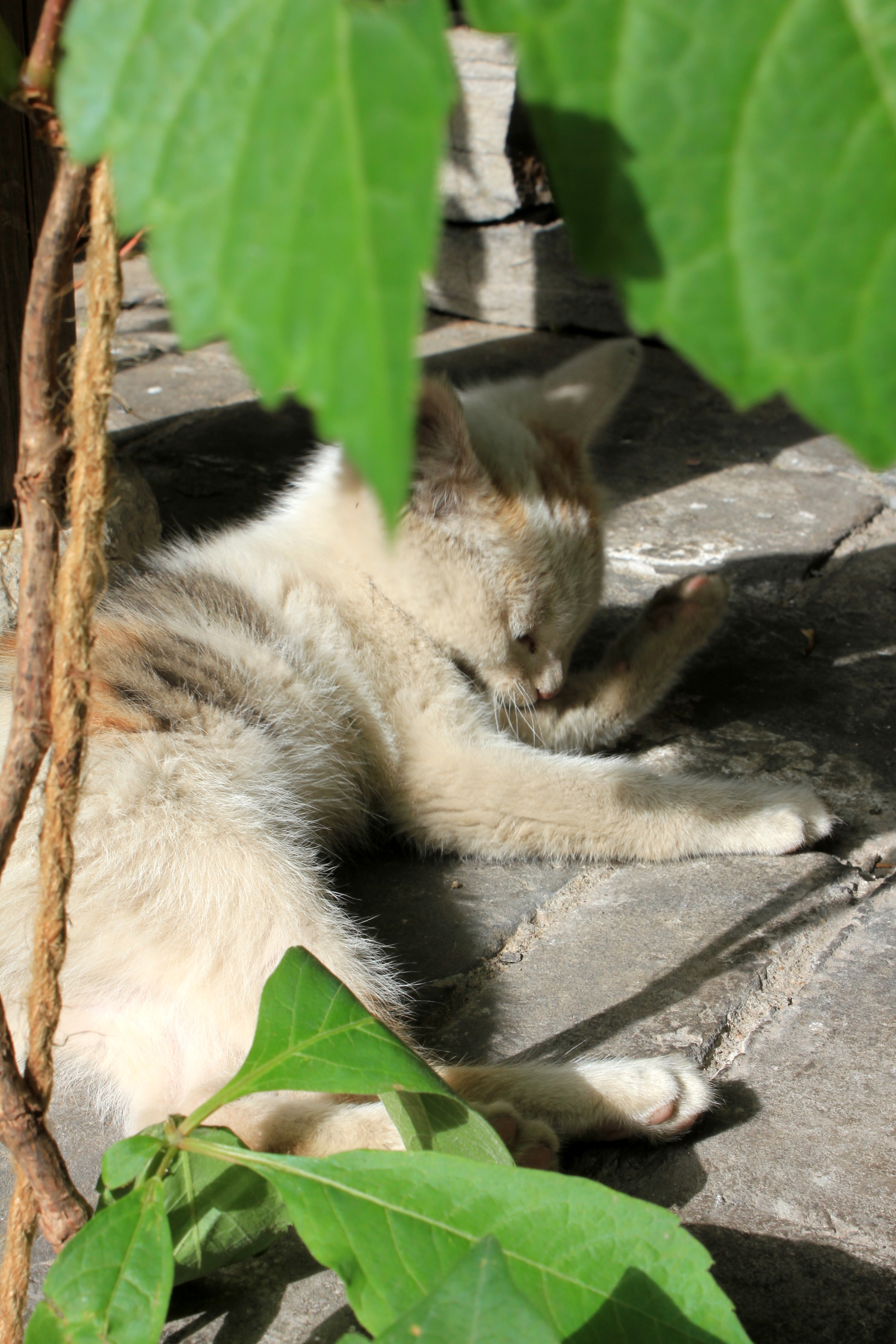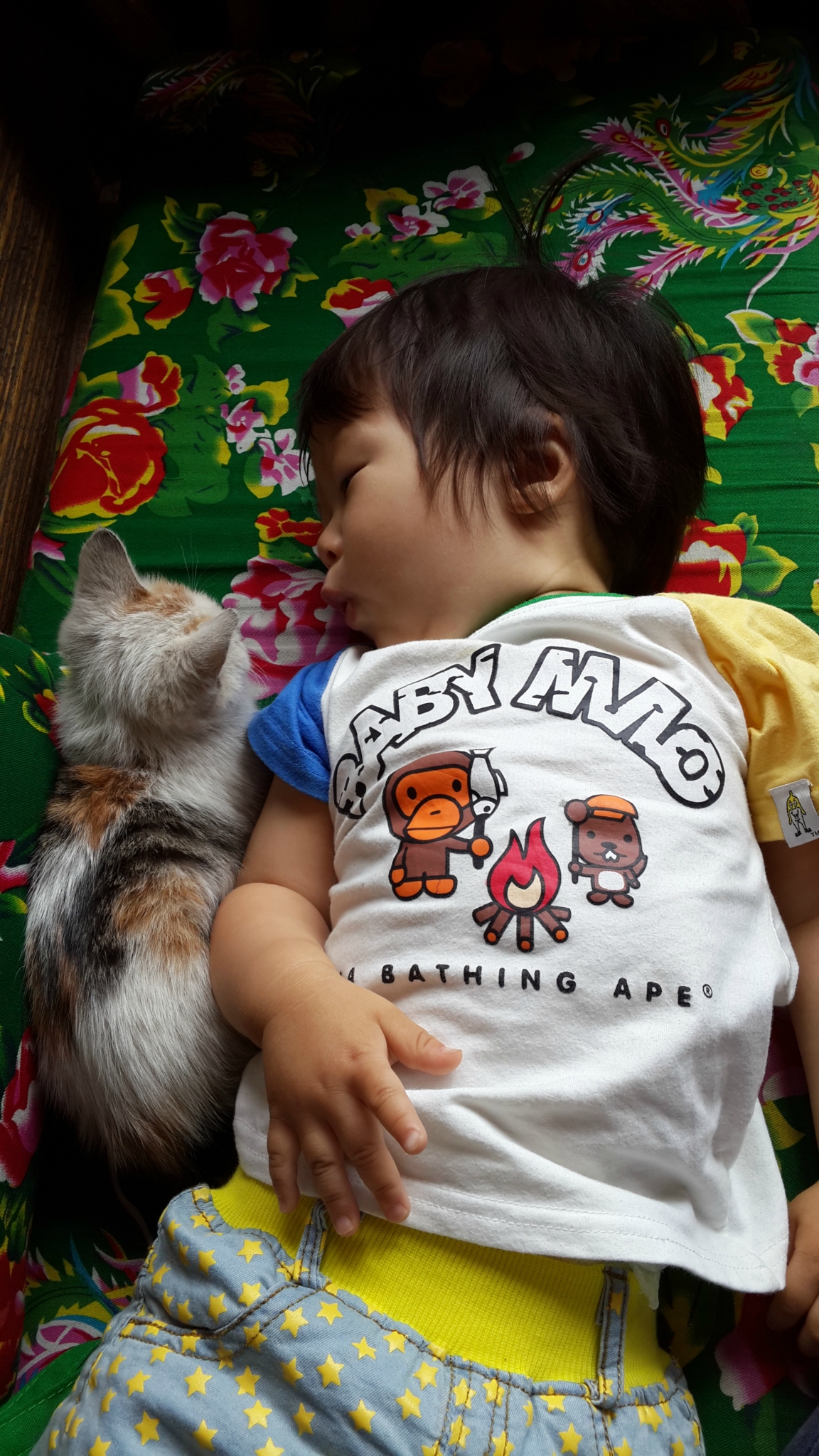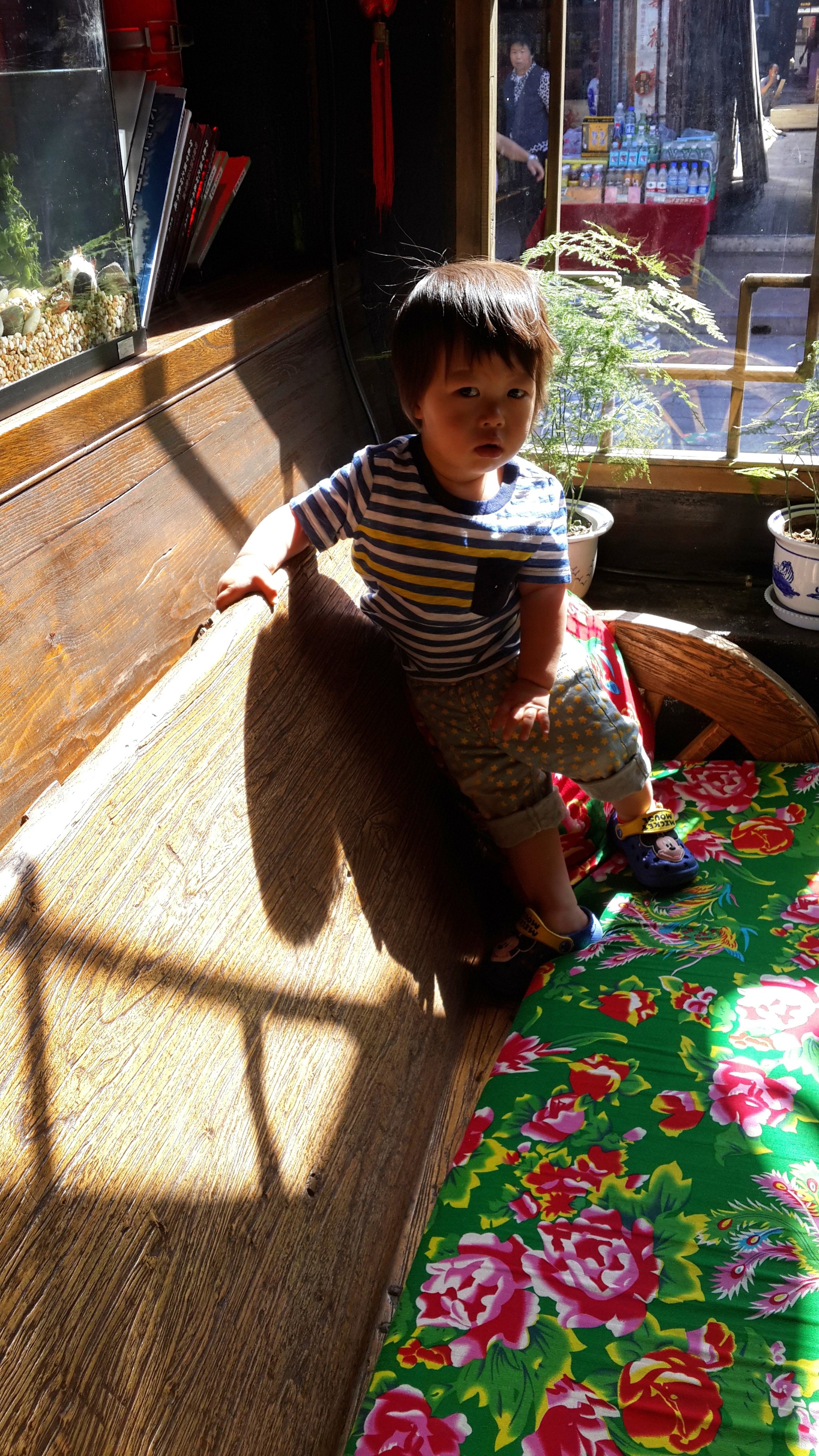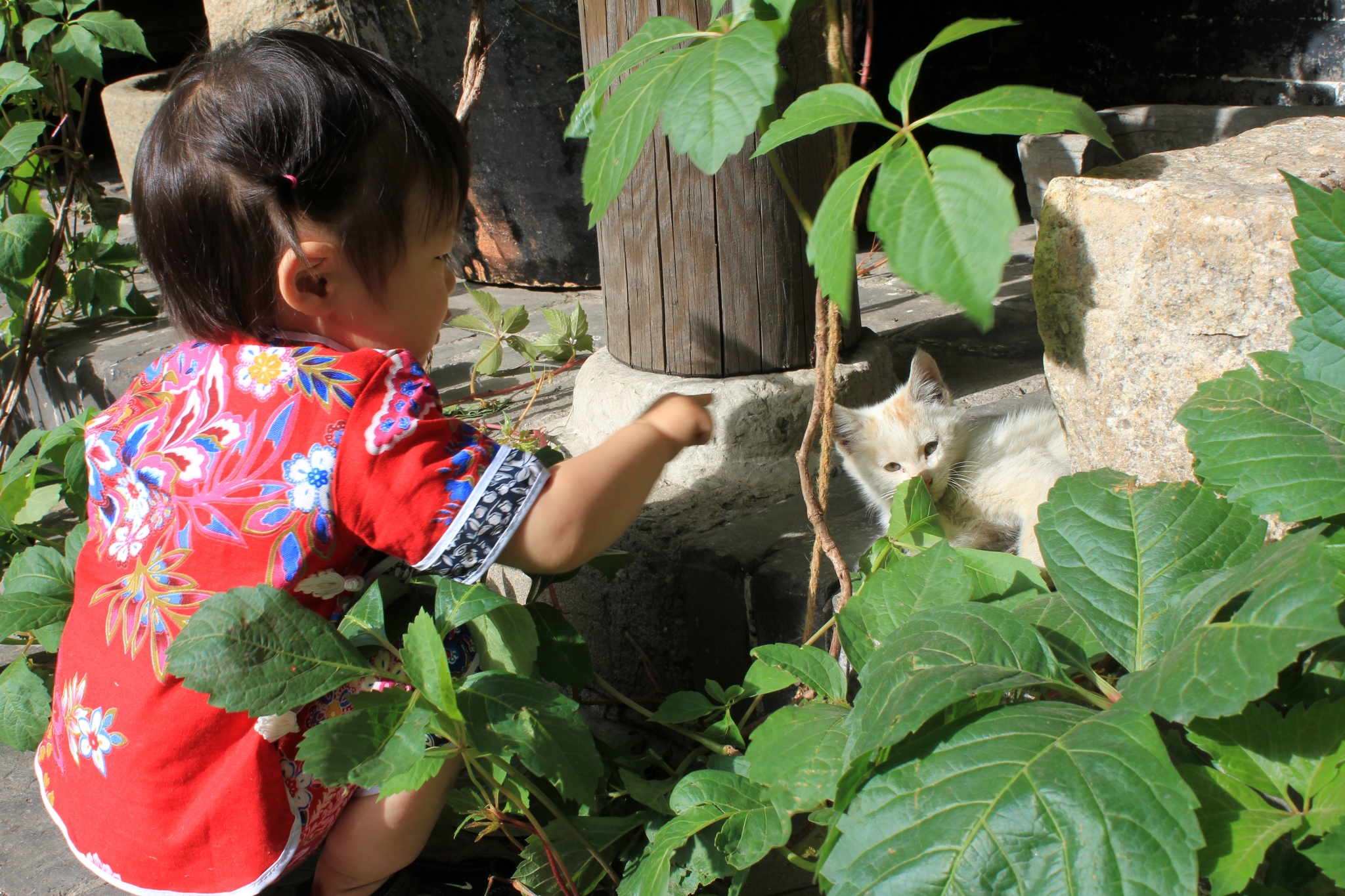 收拾一下去吃早餐,推开门小院的清晨好安静啊。客栈前面就是餐厅酒吧,境外人很多, 我们点了一份早餐,阳光下的座椅上小奶猫在懒懒的晒太阳,小奶娃貌似很happy的跟它玩耍。这样的日子,真好!!