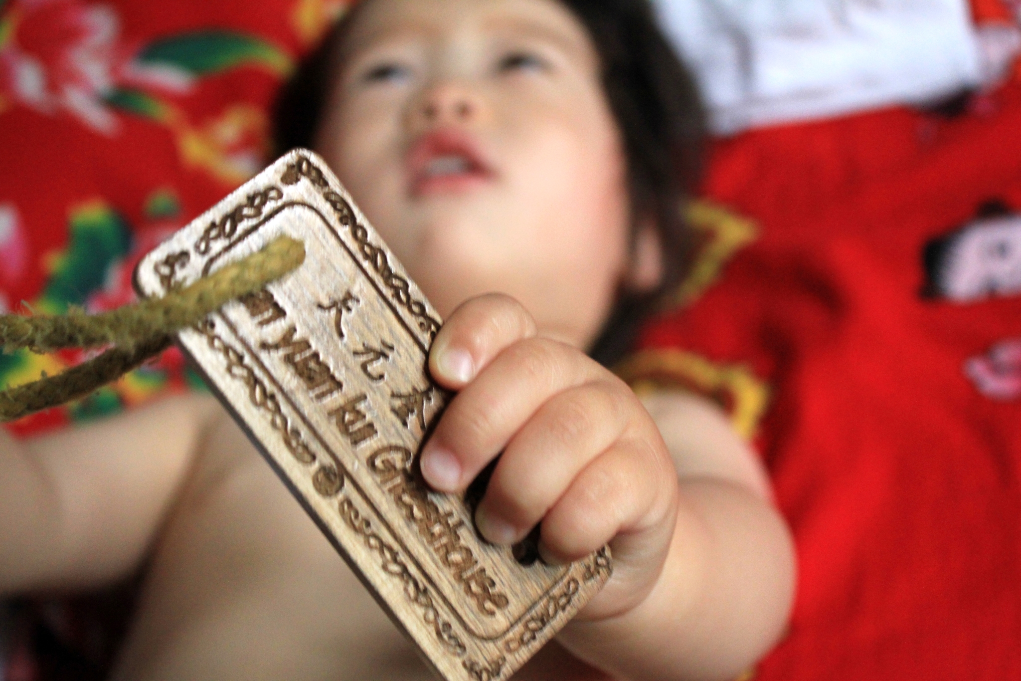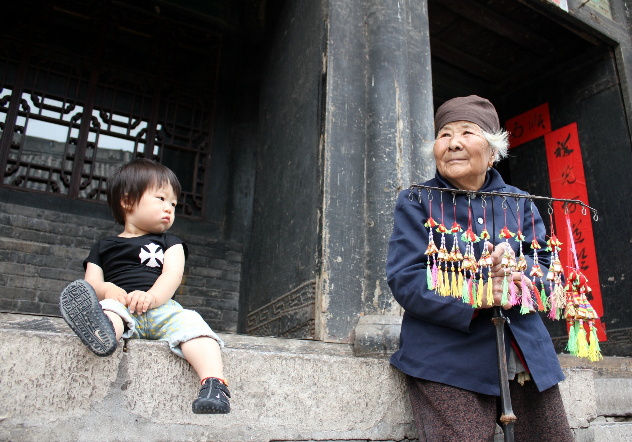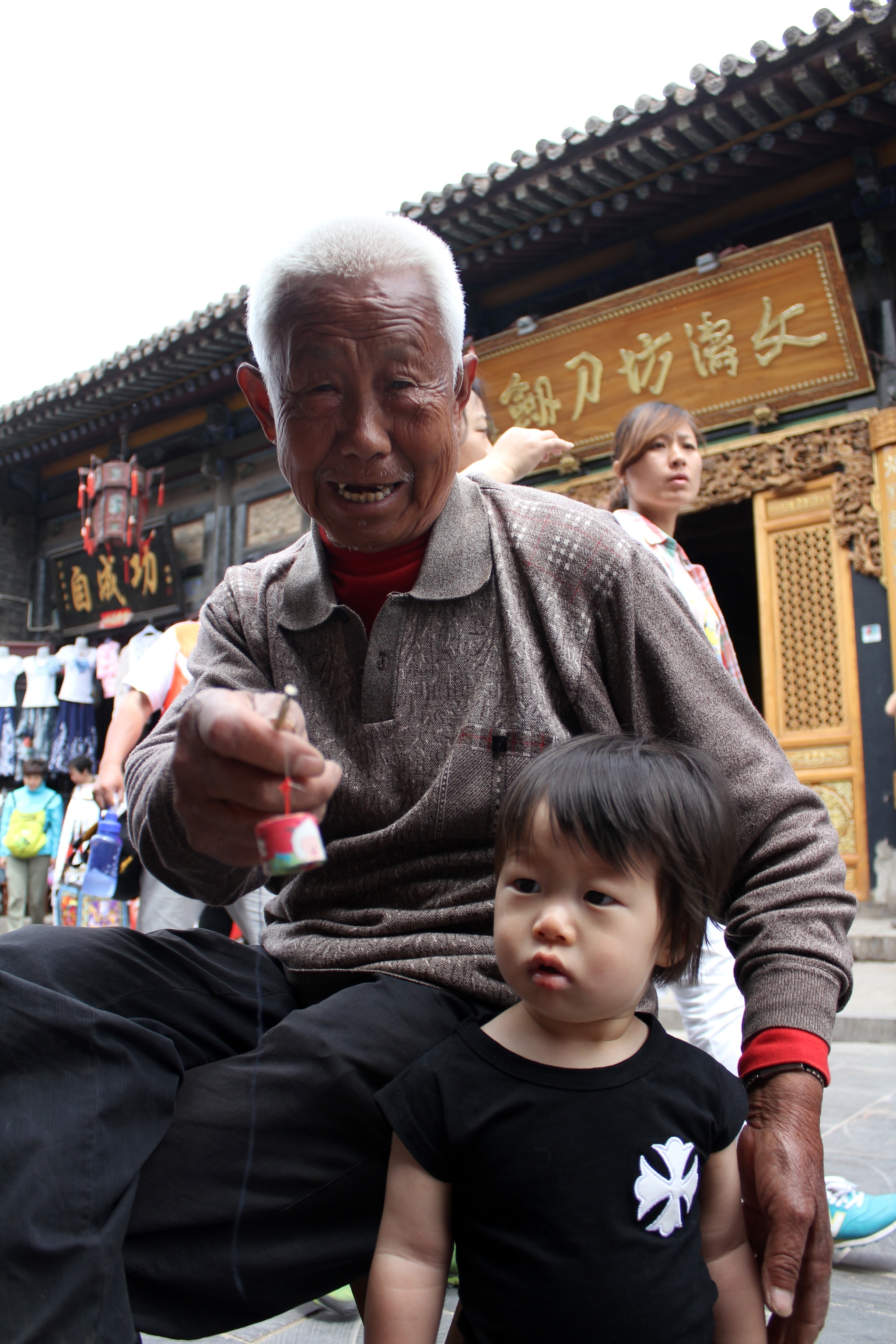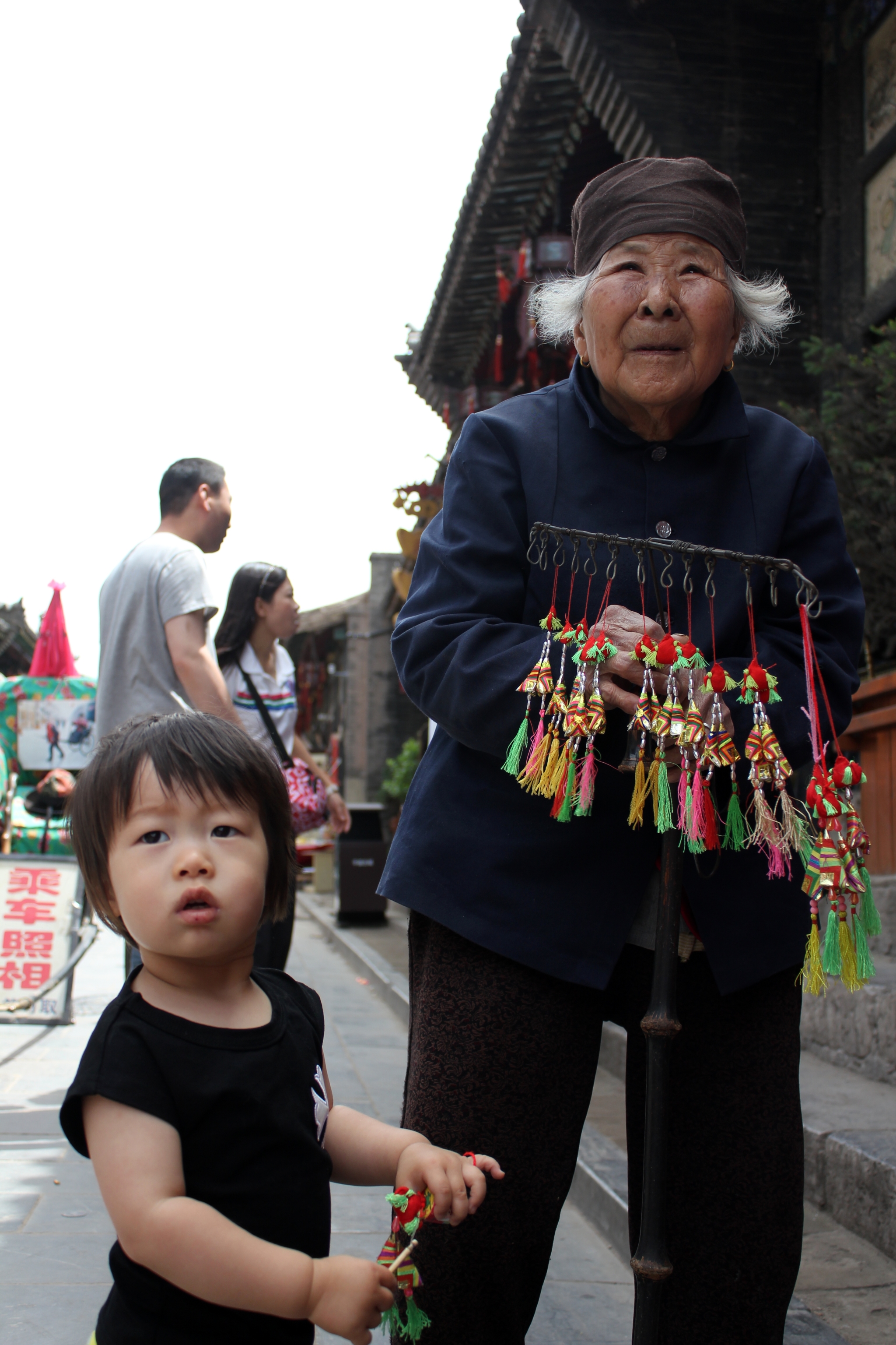 买了一张古城通票120,到了日升昌的门口,刚好有一个旅行团进去,我们就在门口转转。一个买穿线器的老爷爷,一脸的风霜,一个穿线器卖1块钱,esaon看上一个转一转就响的小玩具。三块钱。跟旁边的老太太比起来,实在太可爱了。
