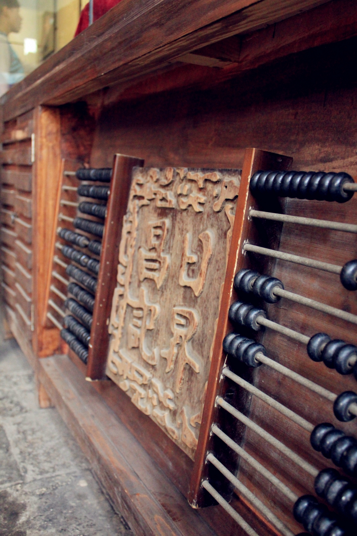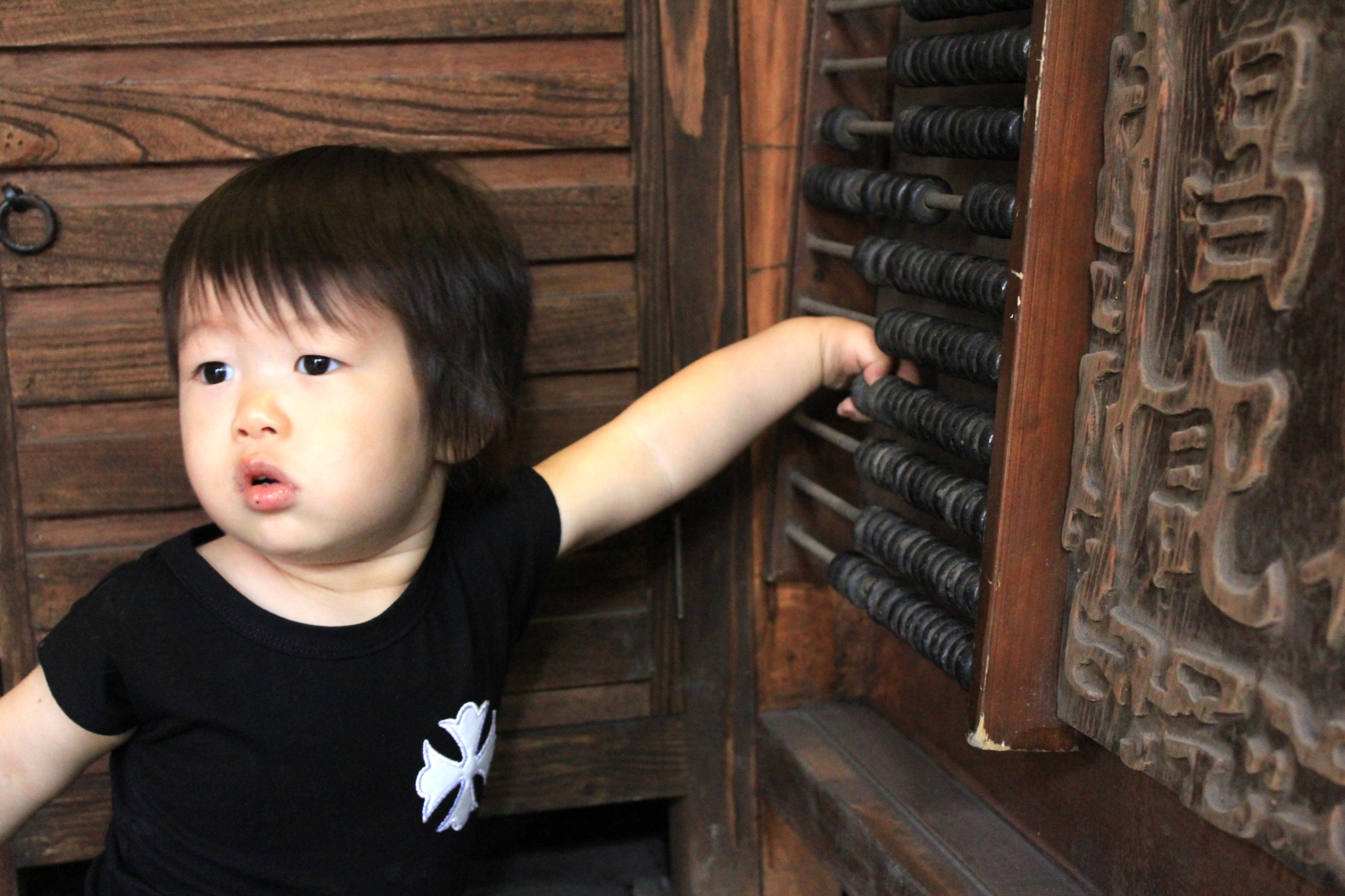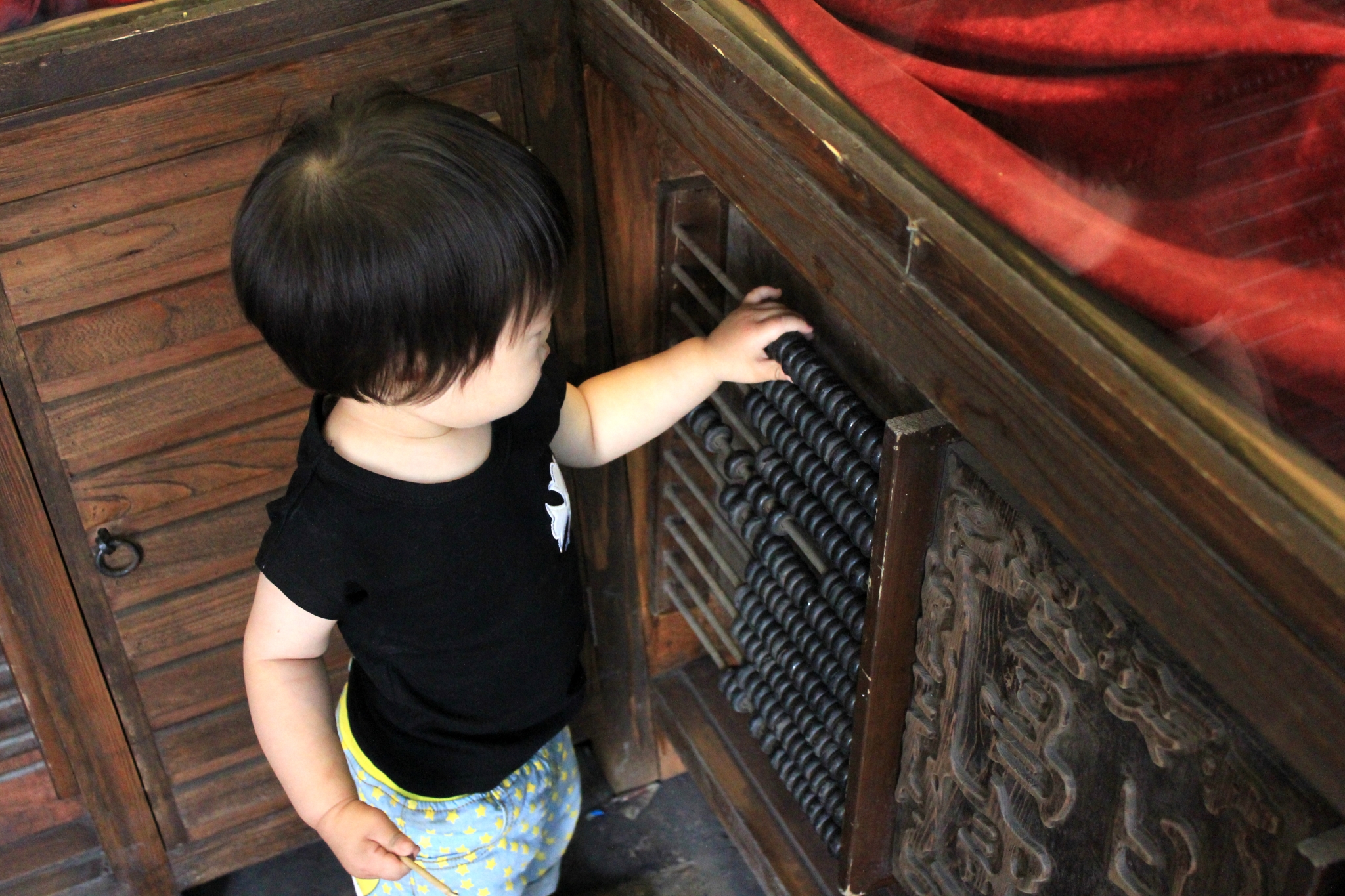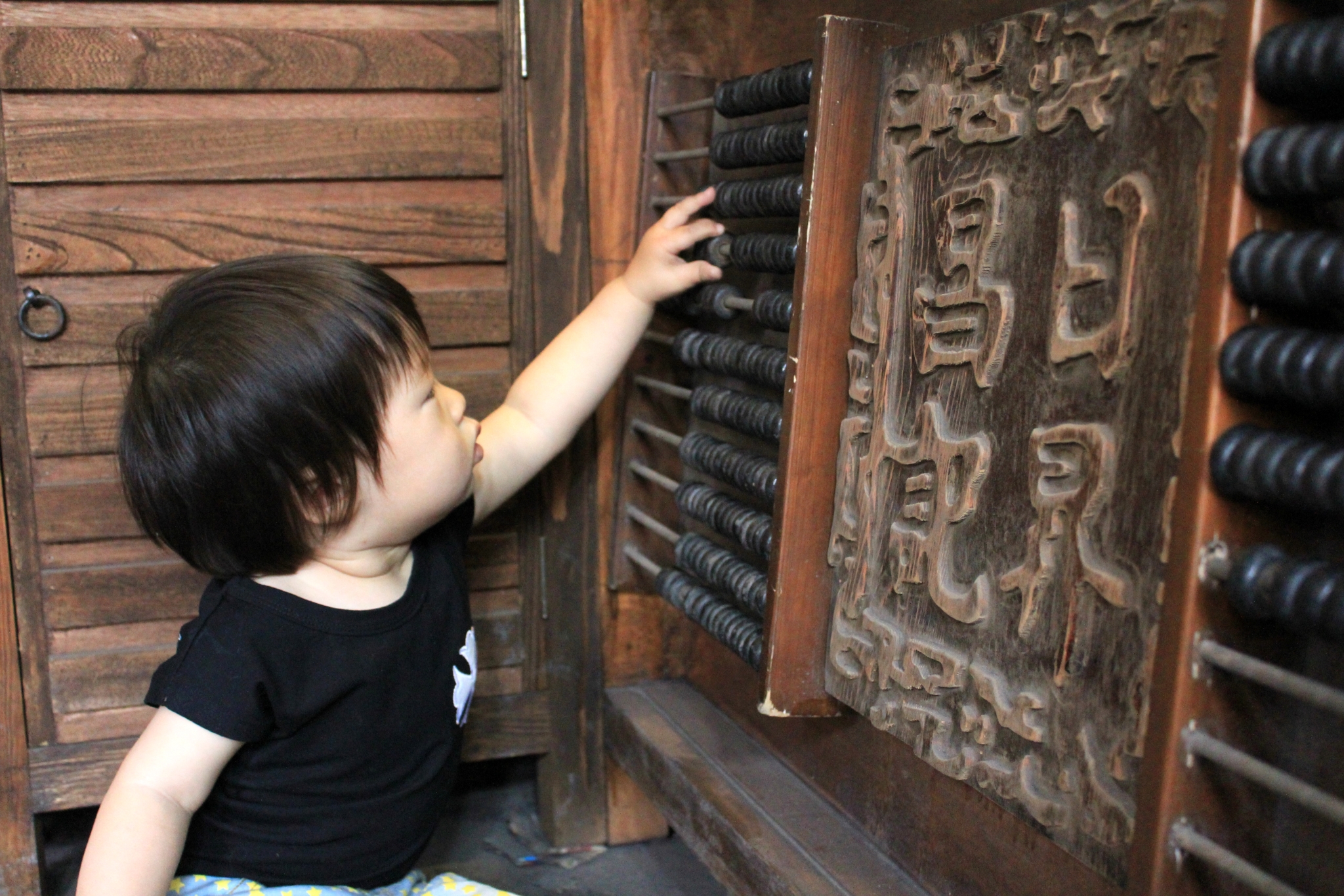 eason很喜欢这个展厅的展柜,都是算盘珠做的,索性就坐下不走了,一直在拨拉珠子。