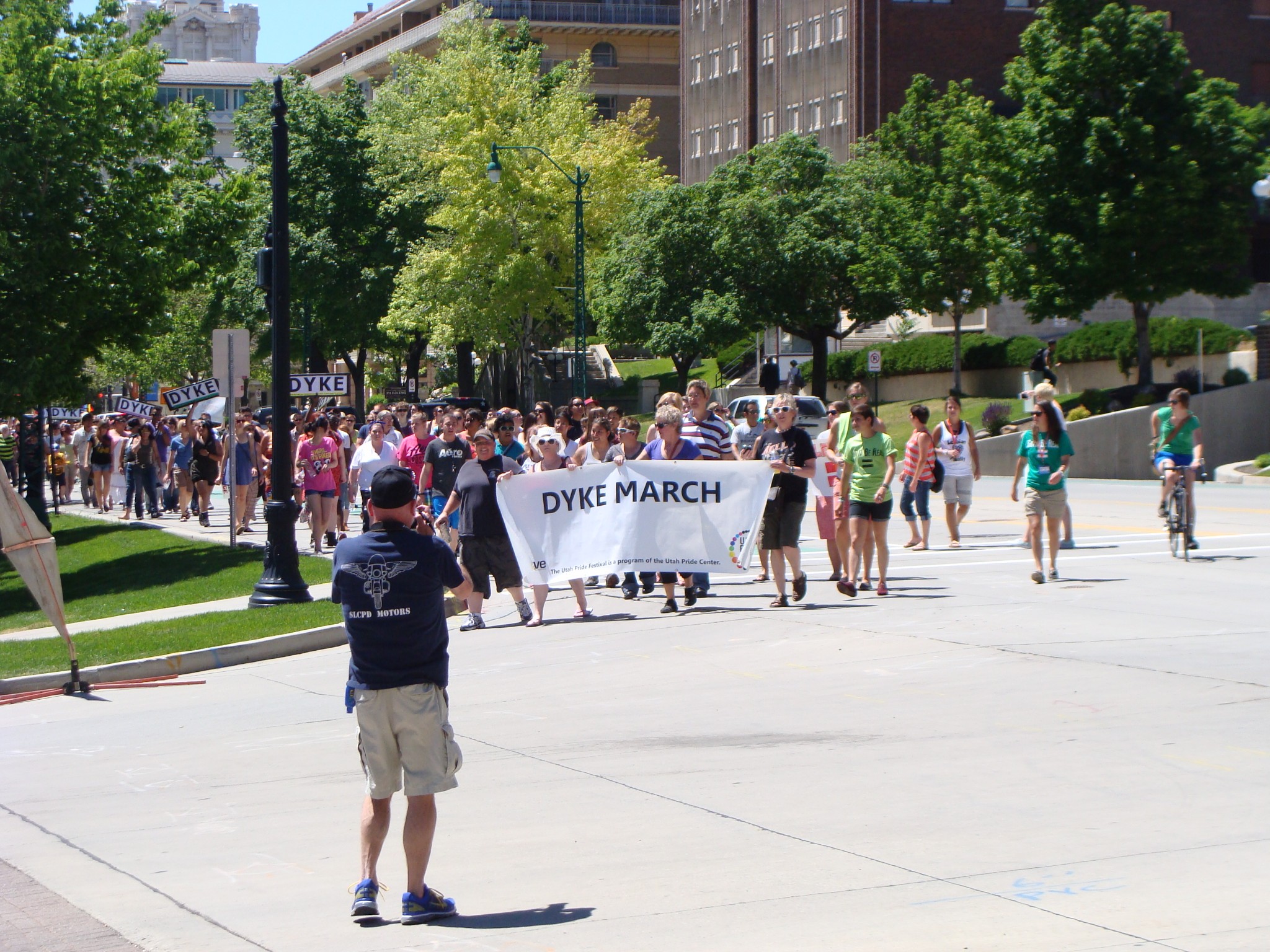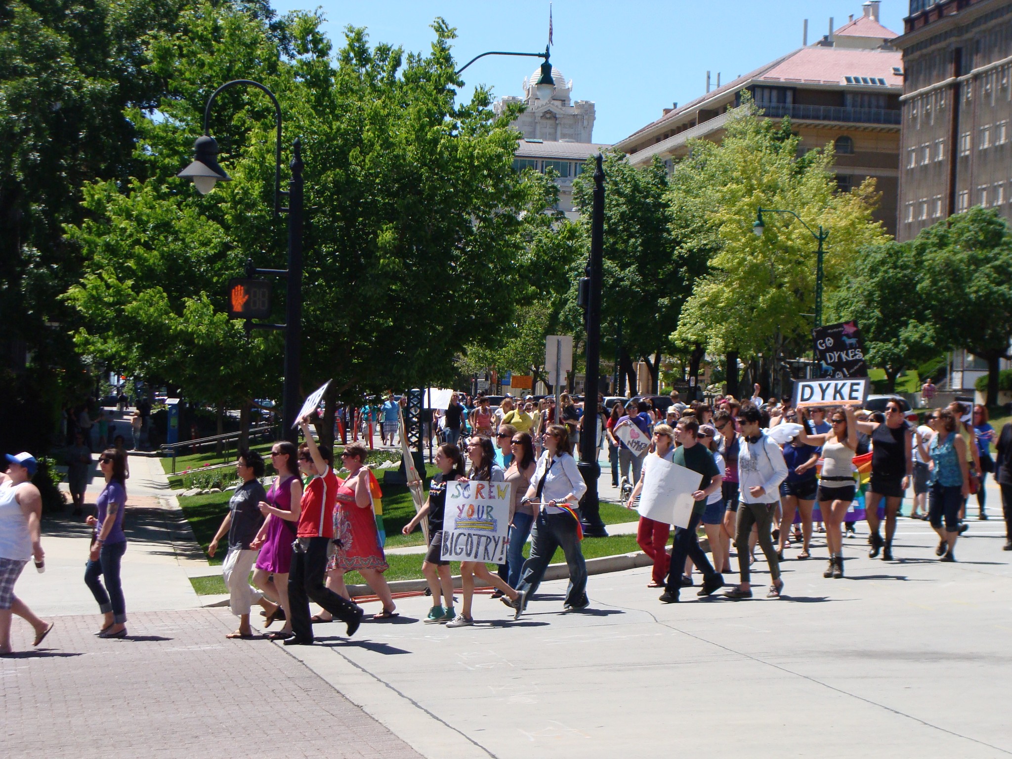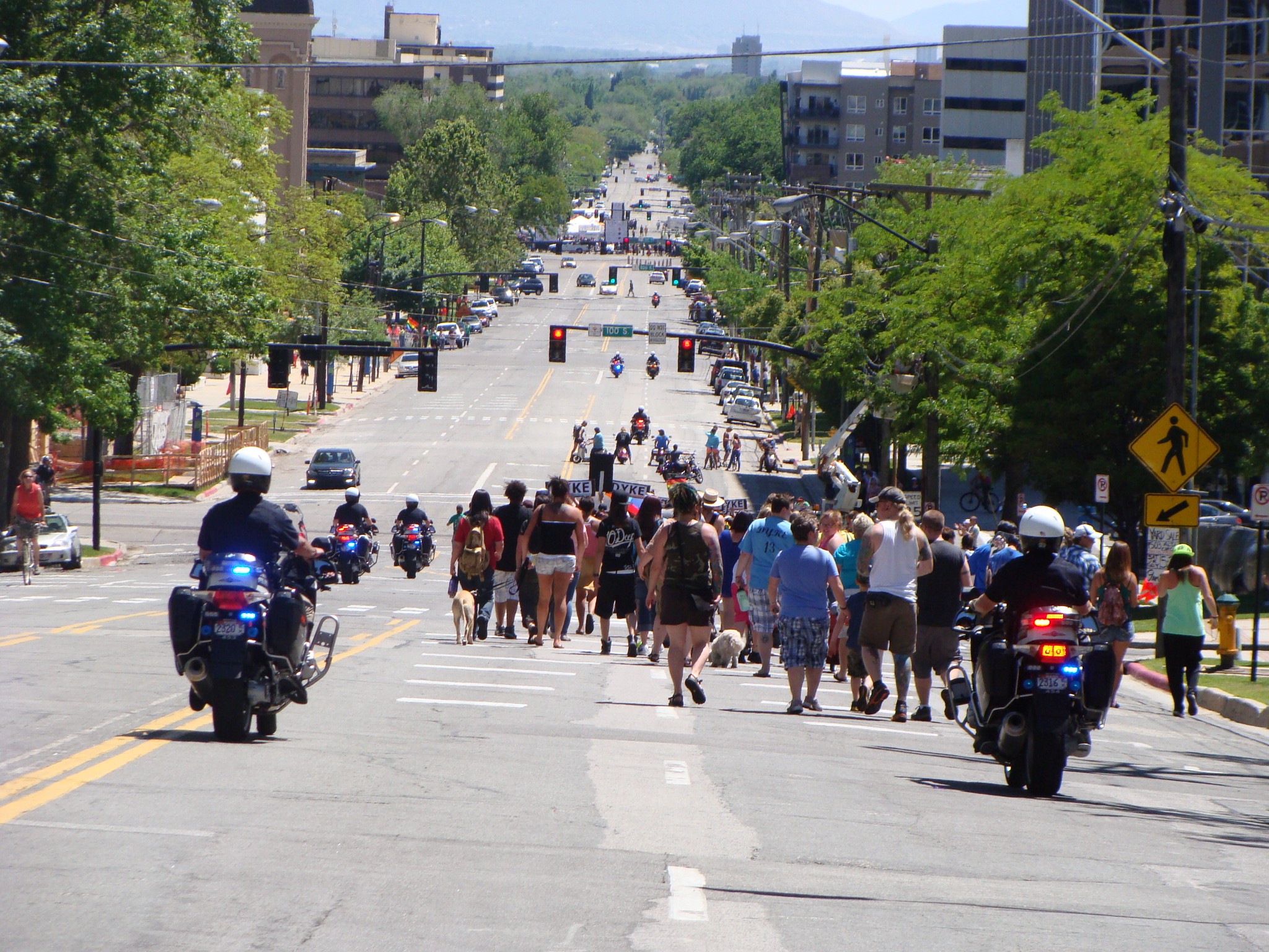 6月1日,盐湖城 ,从停车处往摩门教总部走的时候,突然路口过来四辆警用摩托车封锁路口,原来遇上游行,不时有人带领大家喊着口号,没听懂,不知道他们想表达啥诉求