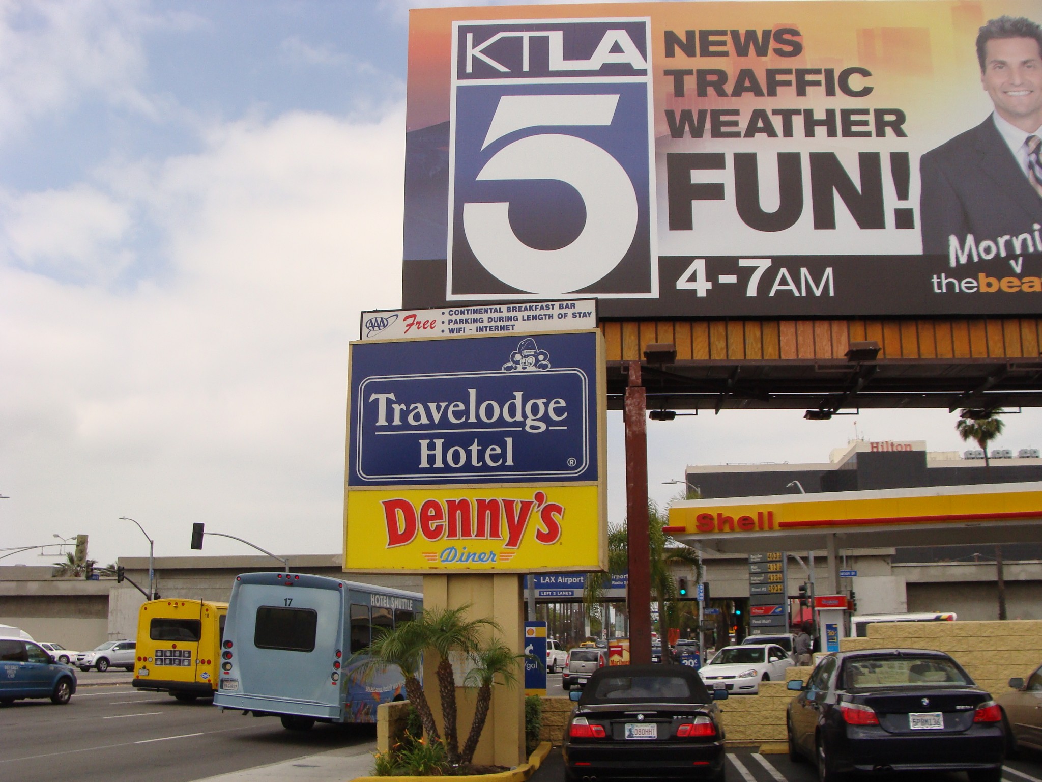 那个面包车样子的,车身上有字和图案的就是免费接送住客的;宾馆门口就是一家denny‘s