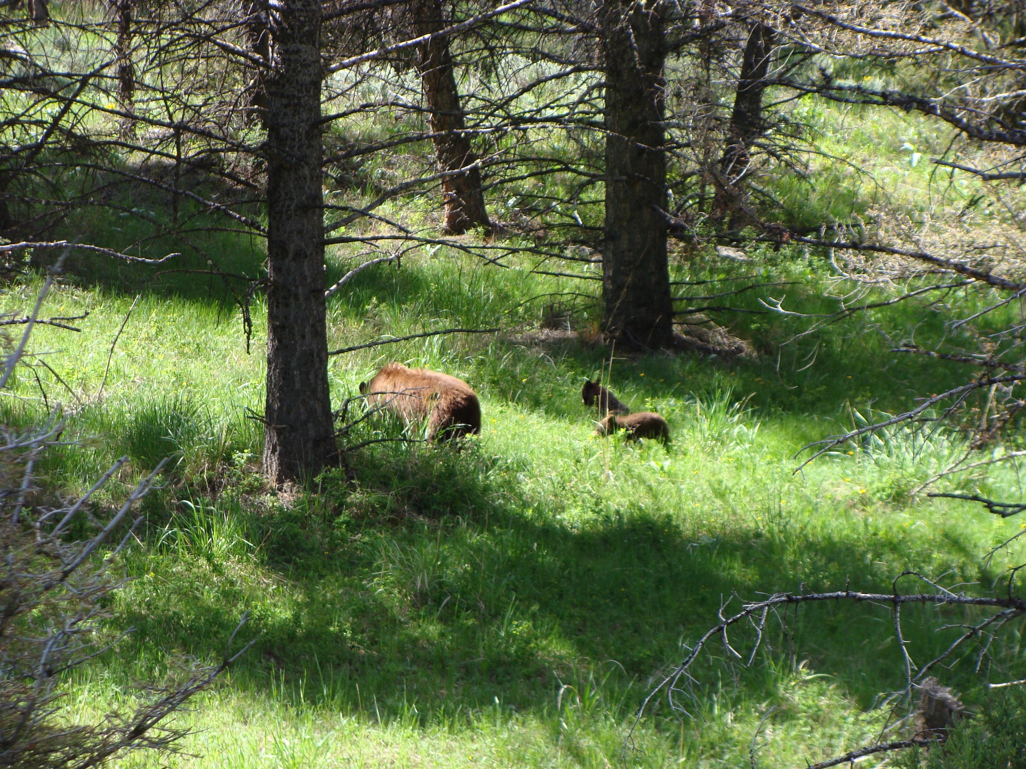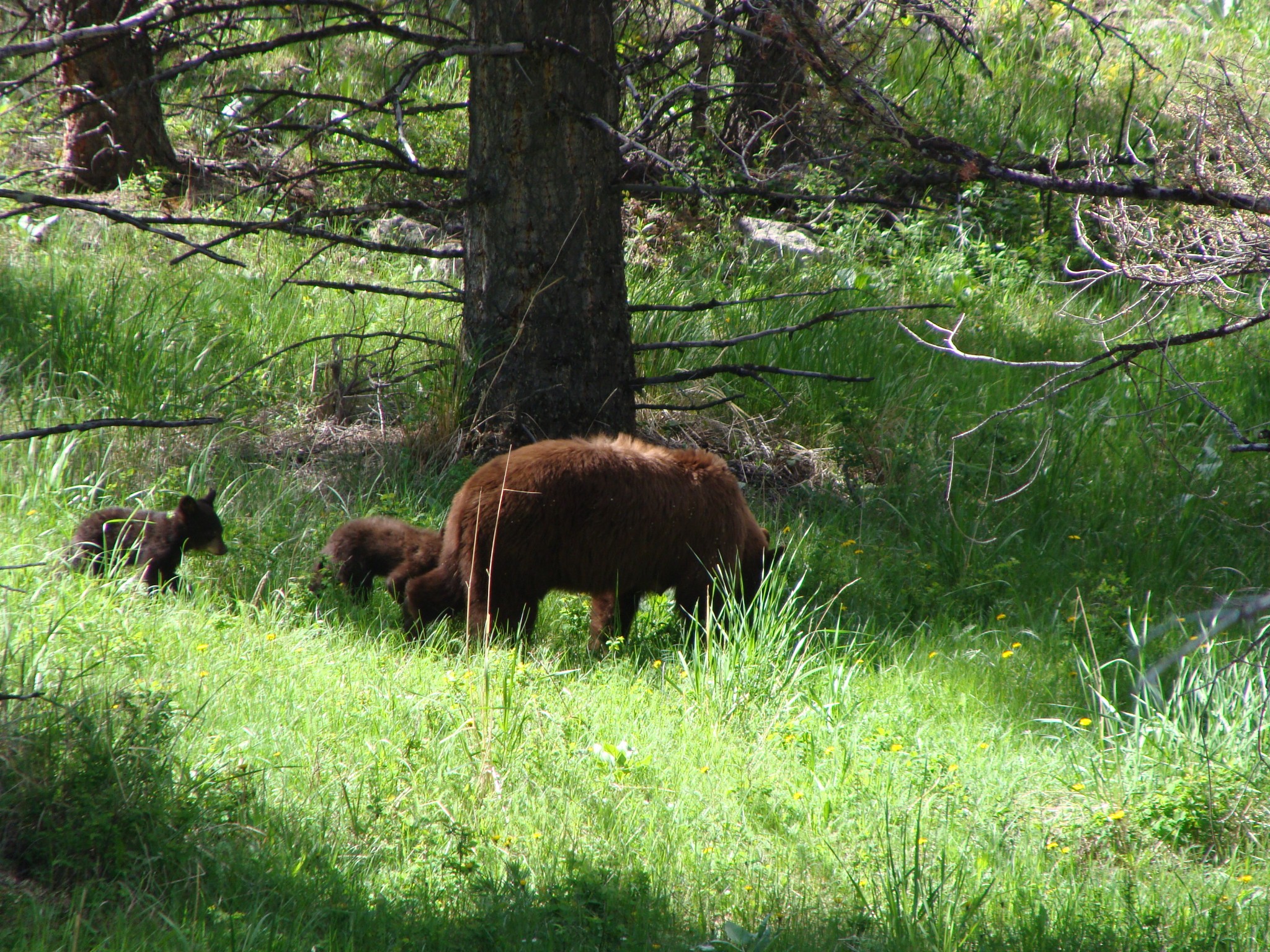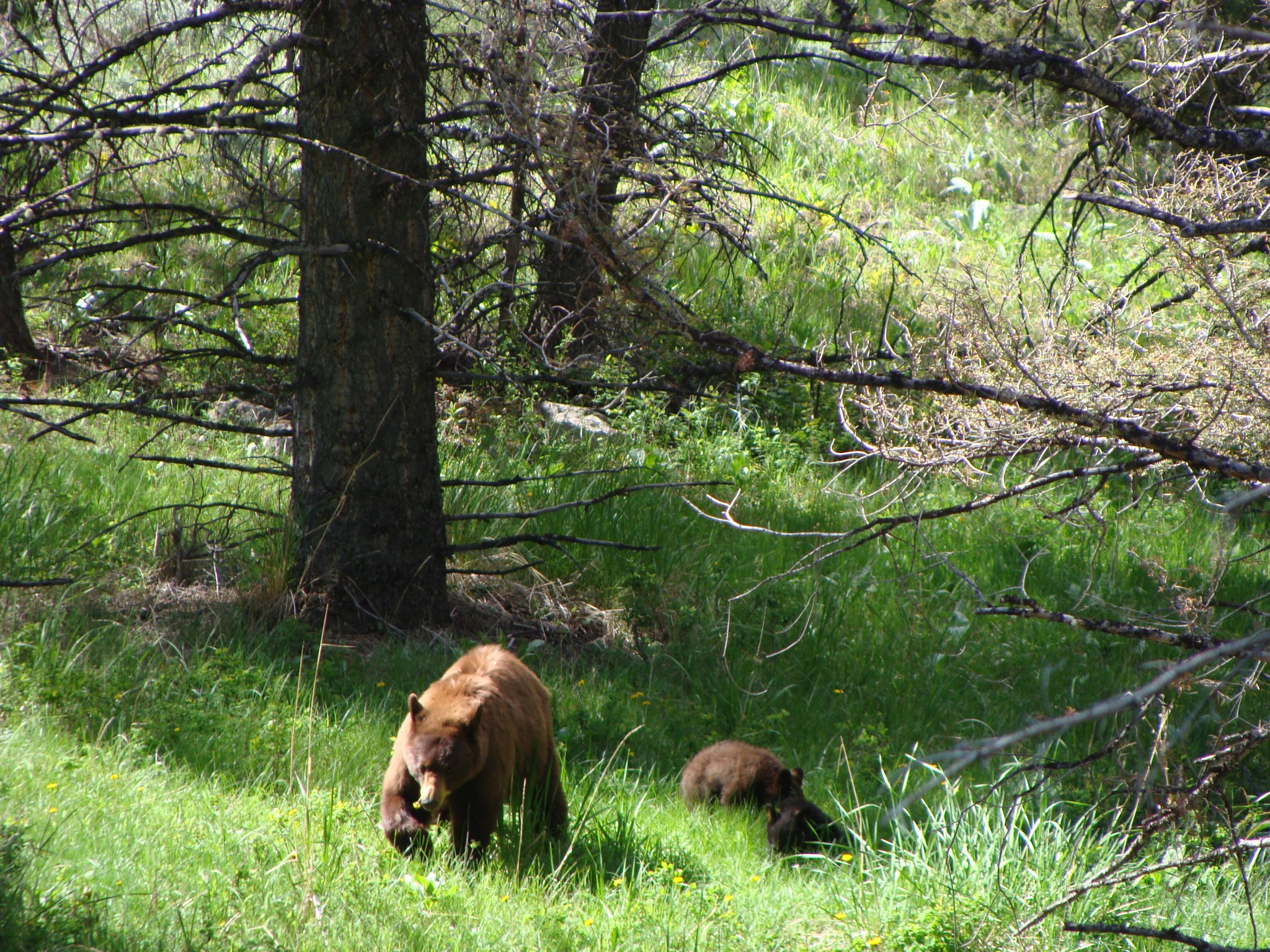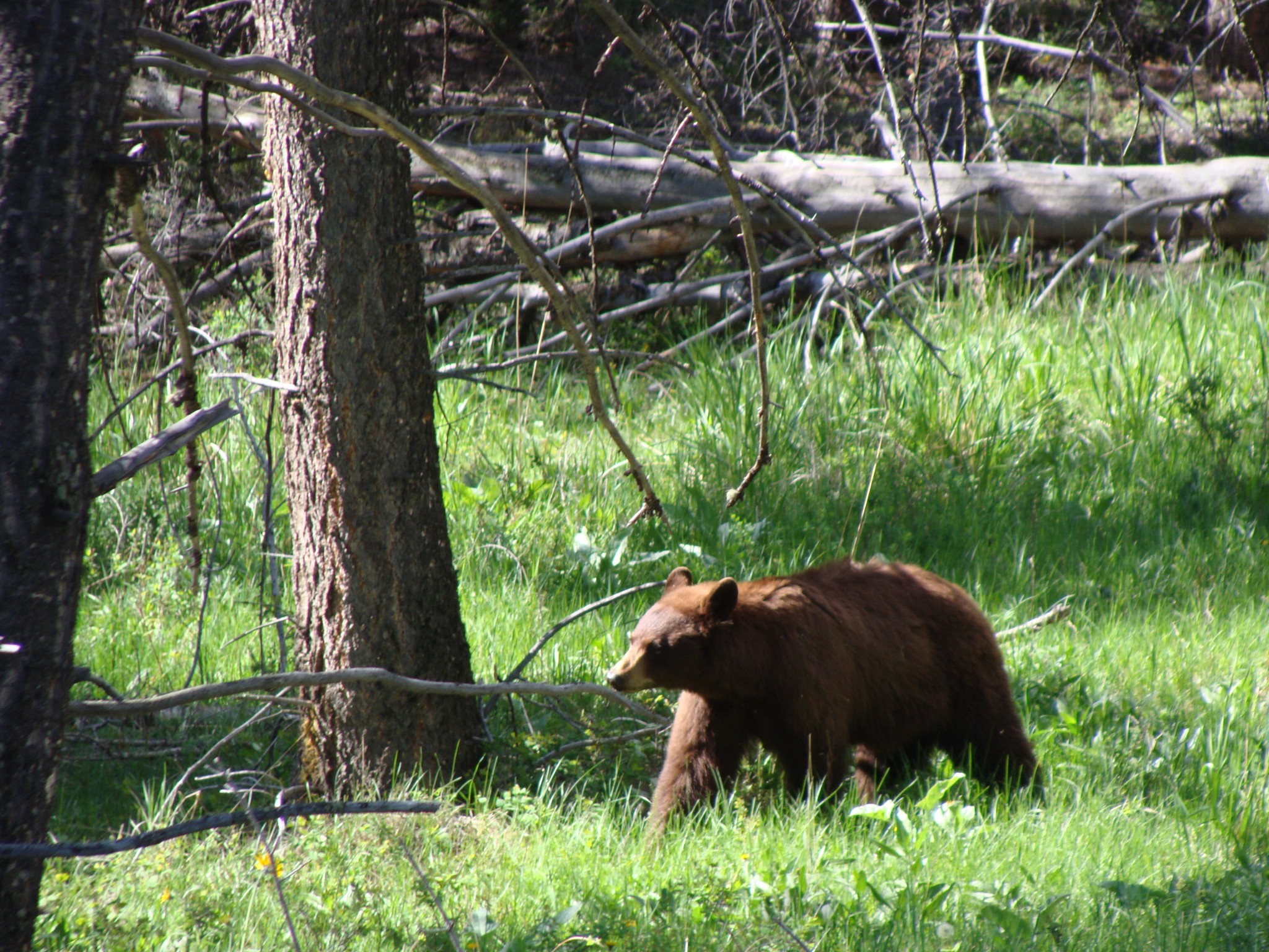 6月8日,即将离开黄石 ,下午的飞机飞往旧金山 ,当天一早,树一直念;“之前看到松鼠大角麋鹿野 牛美国 白鸛,就是没看到熊,能看到熊就完美了,要不我们再出去转一圈吧”其实根据公园指南,夕阳时分熊出来觅食,游人看到的概率比较高,昨晚特地在熊可能抓鱼的河边转过一圈的,都没看到,不过为了满足他的愿望,于是一同出去,在有可能出现熊的景区开车一路寻觅,寻觅无果车往回开的时候看到一群人围在路边,凭直觉树说应该是熊,路边停满车,只能再往前开一段靠边停好,树跳下车一路小跑,跑一半回头喊给我望远镜拿过来,我回车上拿了望远镜往人群聚集方向走,走过去一看哪需要望远镜,肉眼就可以看到