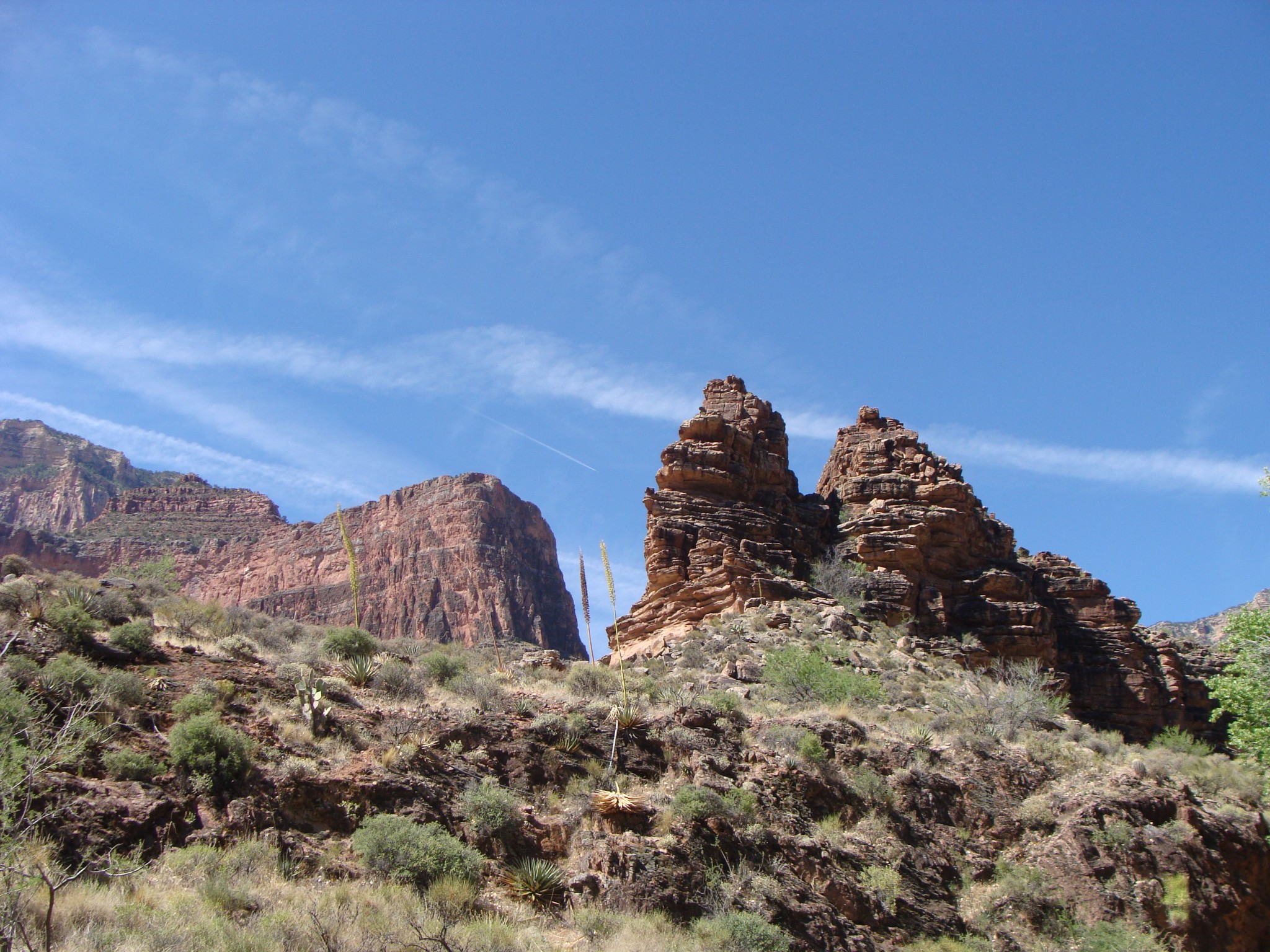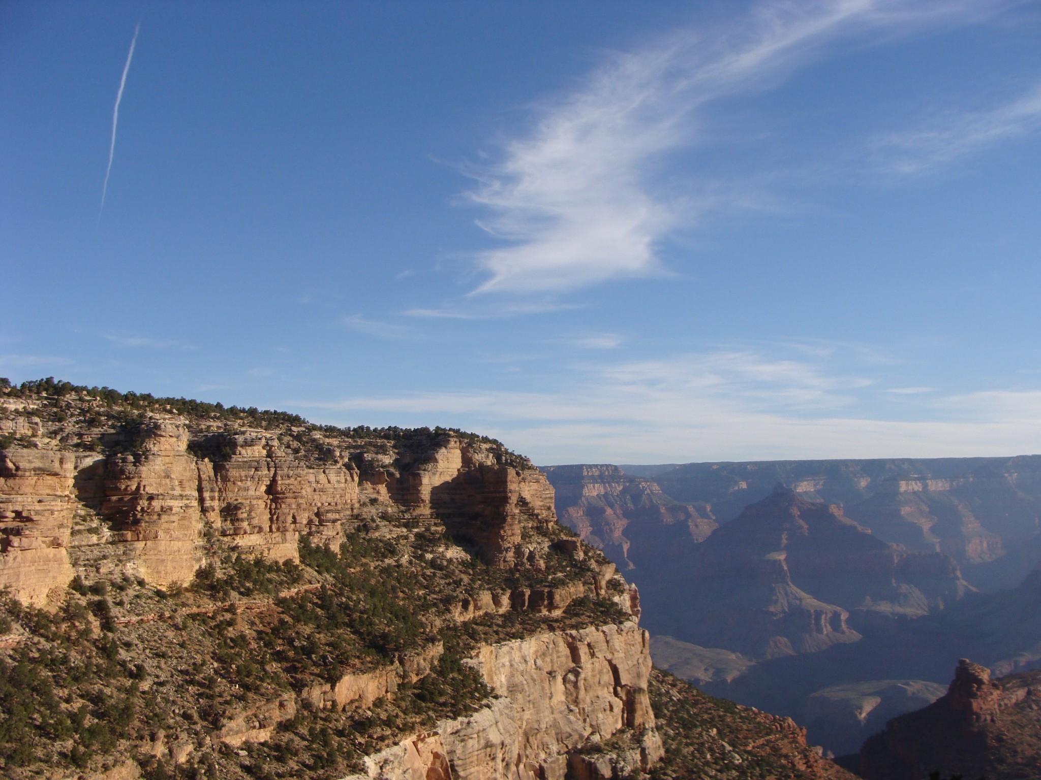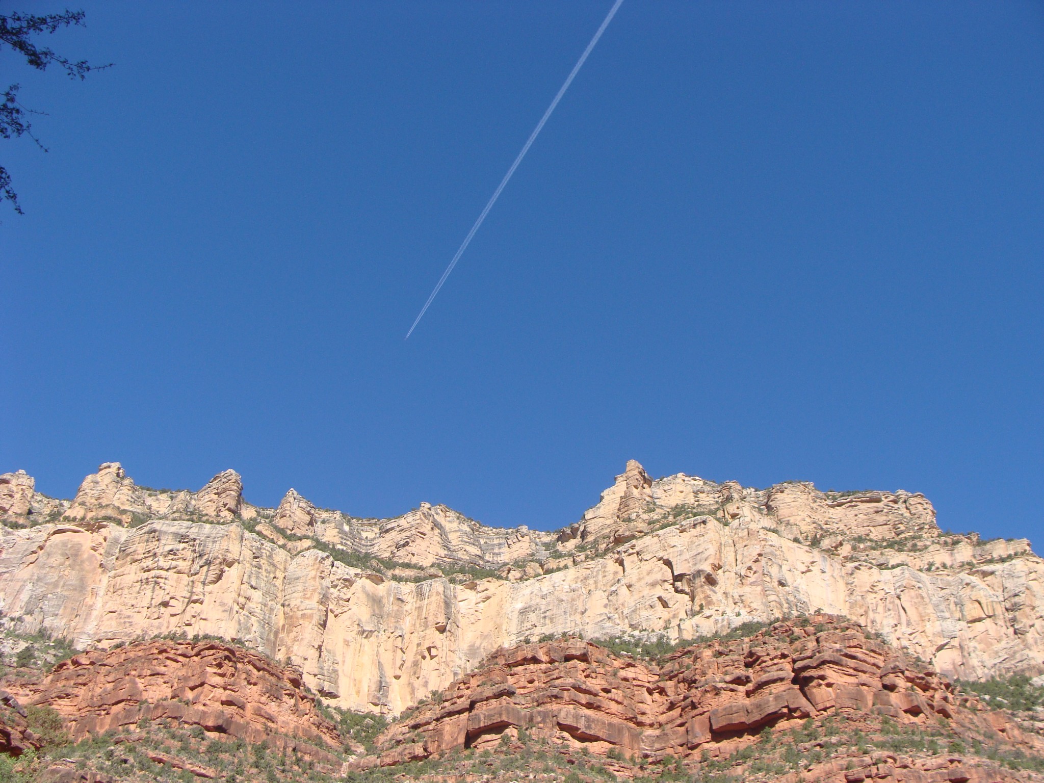 天空中直直的拉烟的是小飞机,大峡谷里私人小飞机很多,也有商业运营的