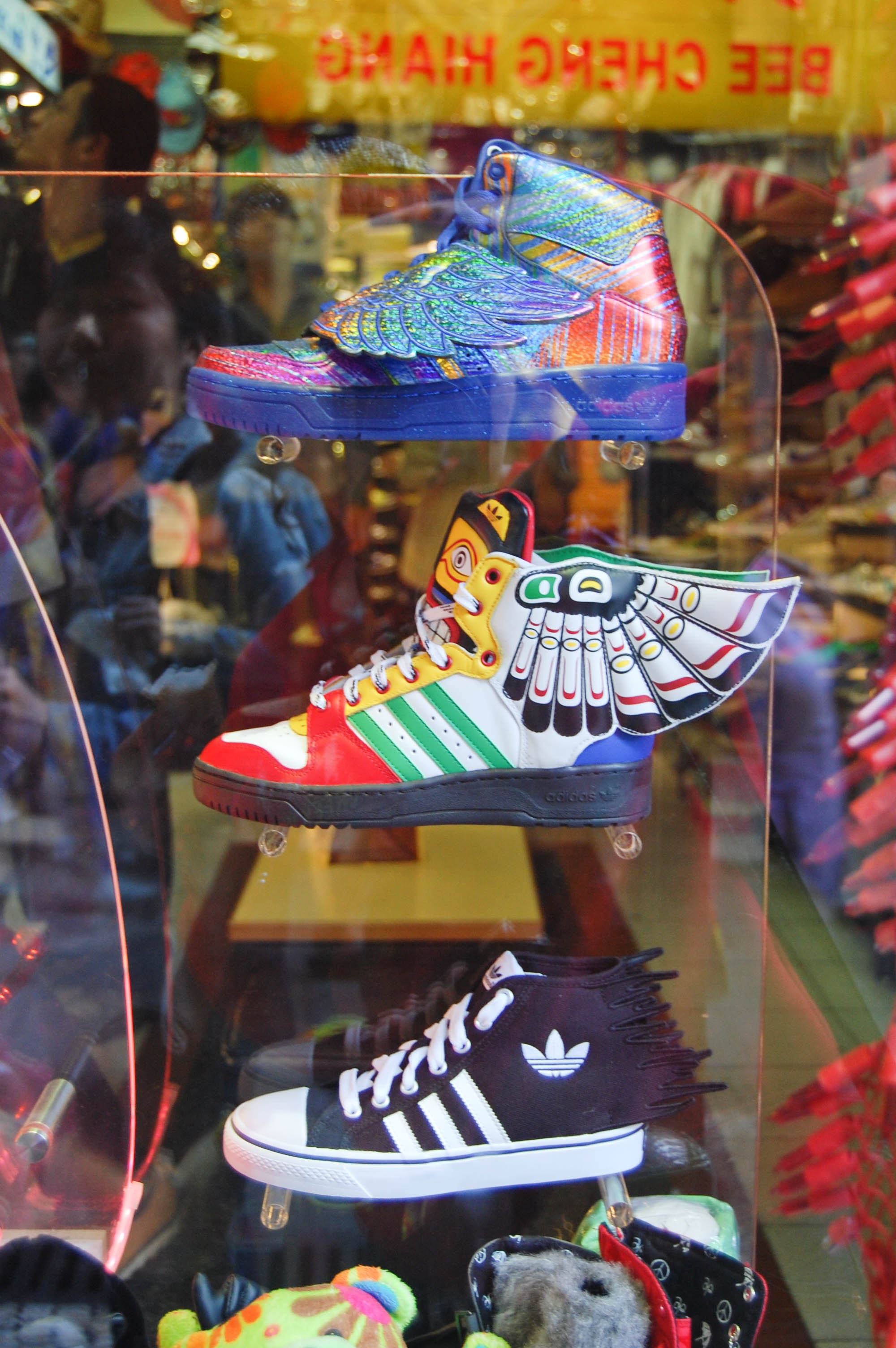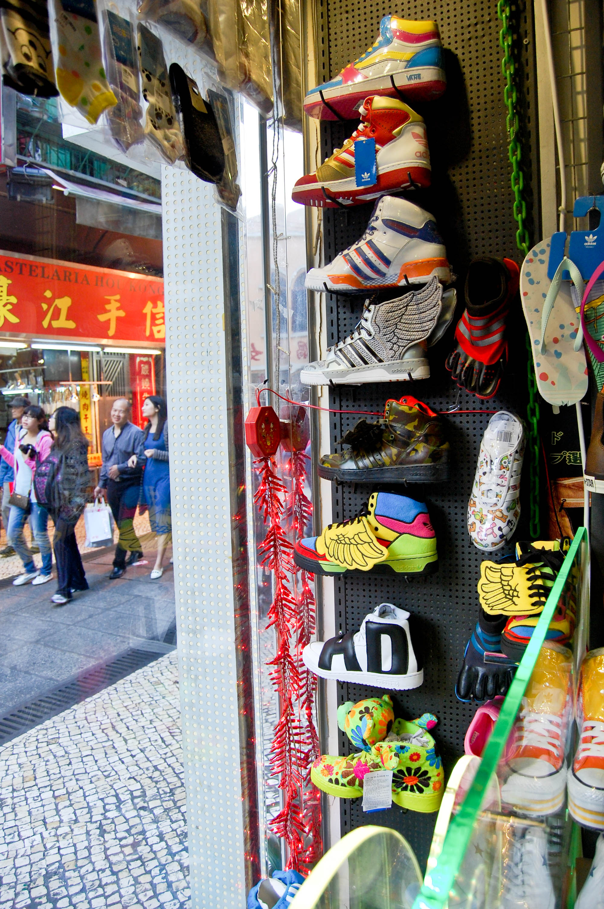 在一家鞋铺的入口处,摆放着昨天在海洋公园见到的那双“无敌飞鞋”以及它所在的“飞鞋家族”。估计用不了多久,内地就要刮起一场旷日持久的“无敌飞鞋山寨风”…呼——呼——呼——