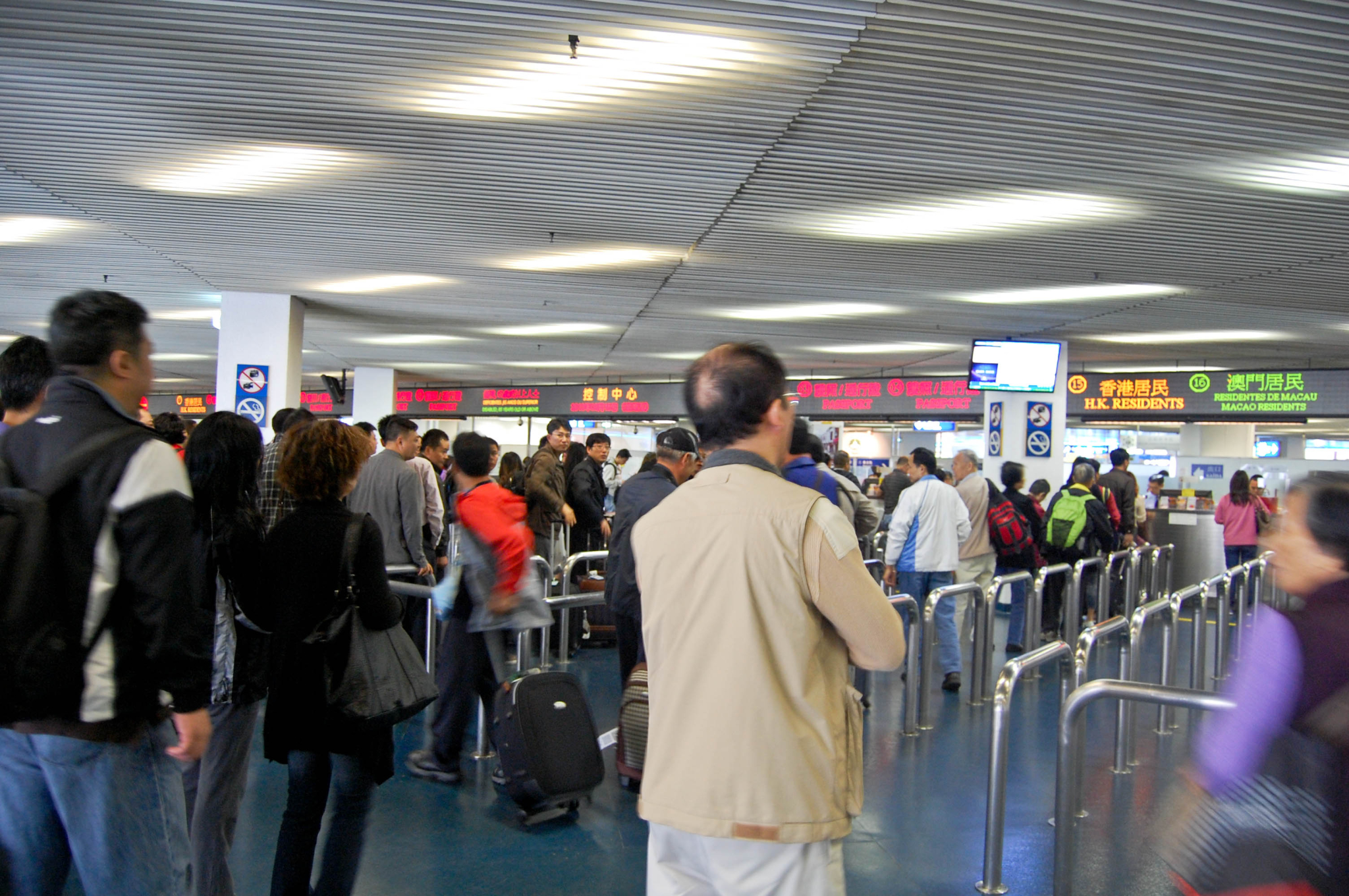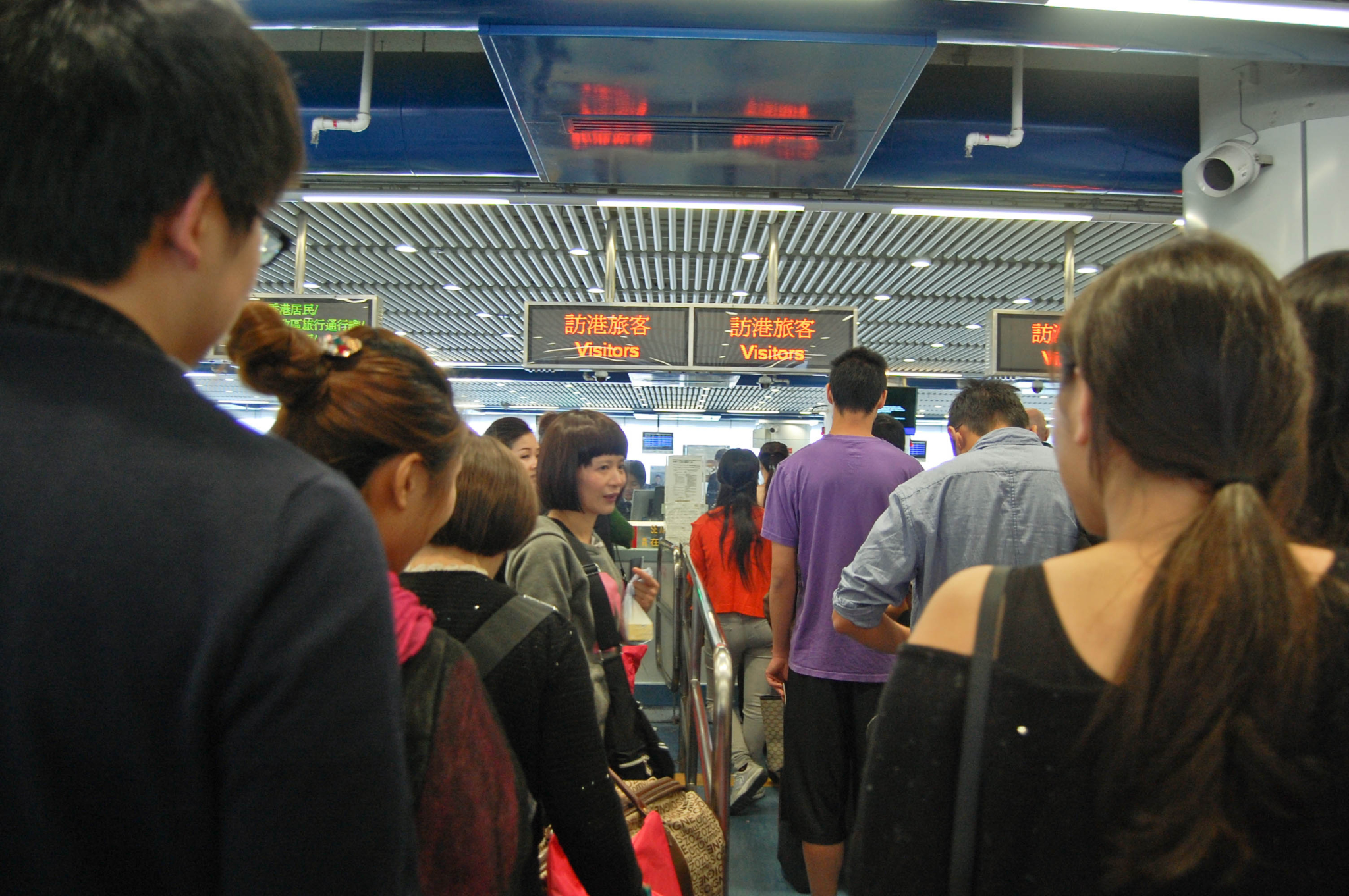 在出境口,把港澳通行证递给工作人员,核实一下~再卡个章~