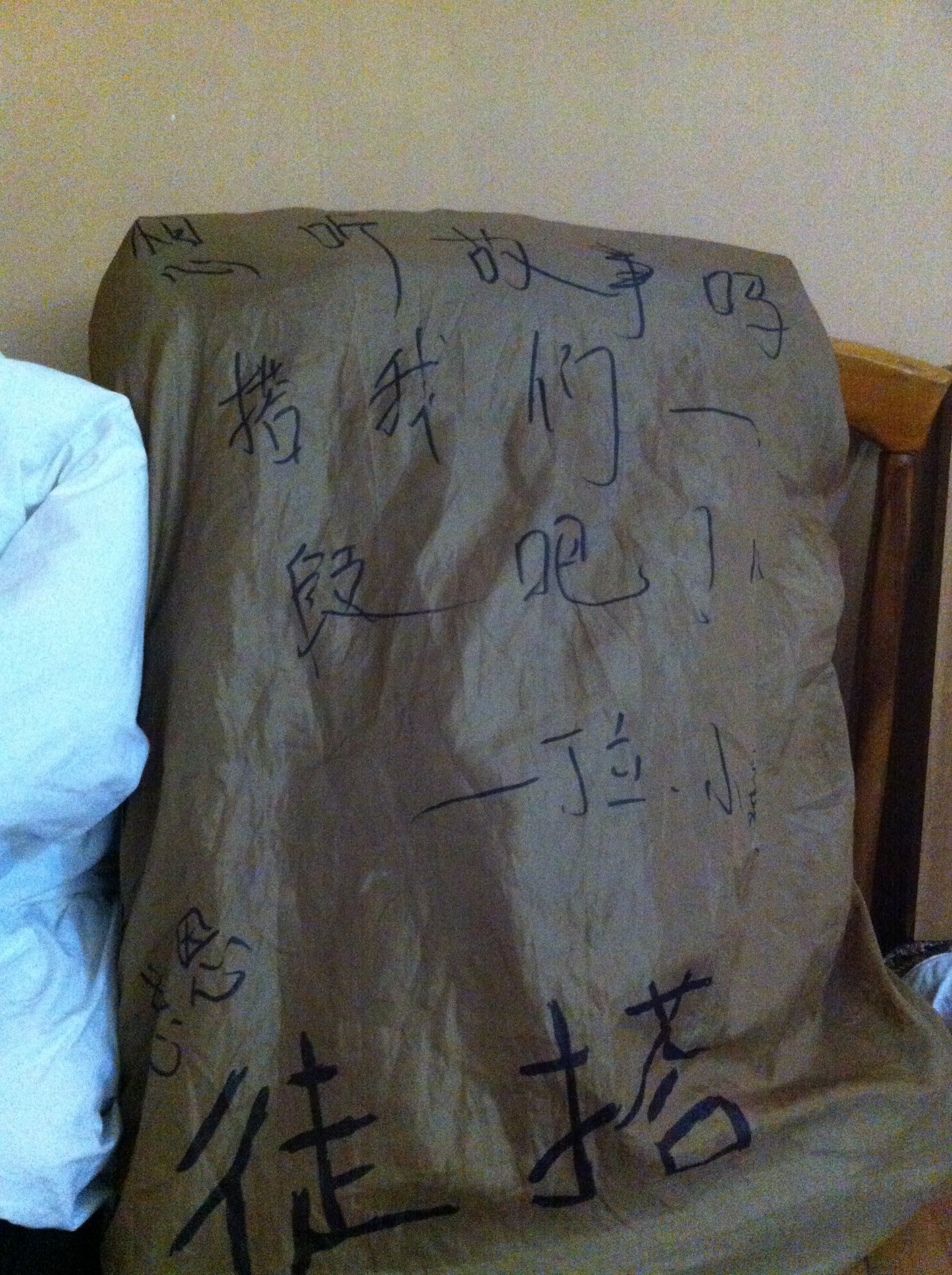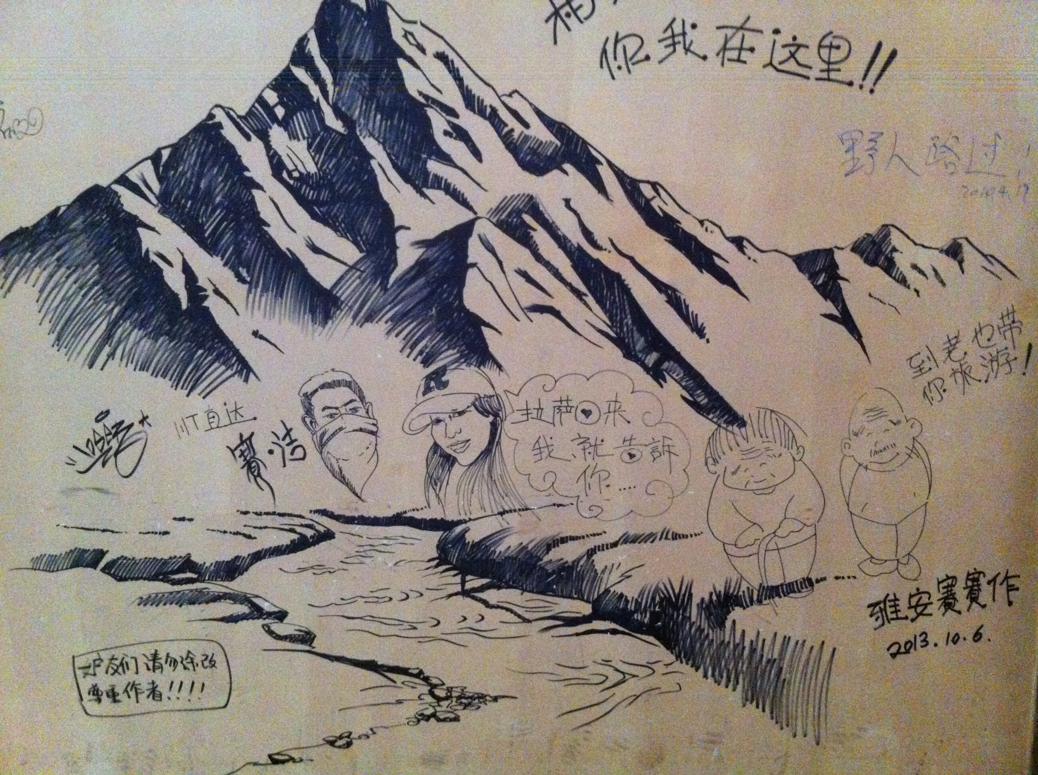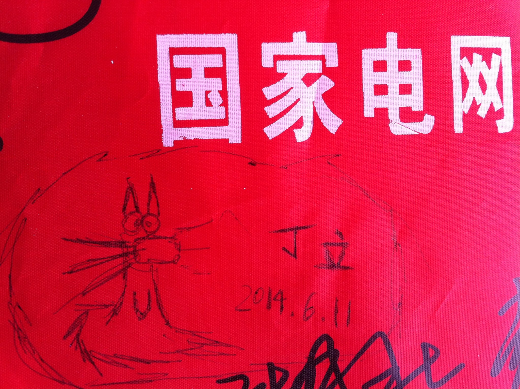 这里有免费的水,和泡面。国家电网就是好啊。我和小影在这里吃了泡面。留了印记。然后跟大叔借了笔写了这句话:如下图