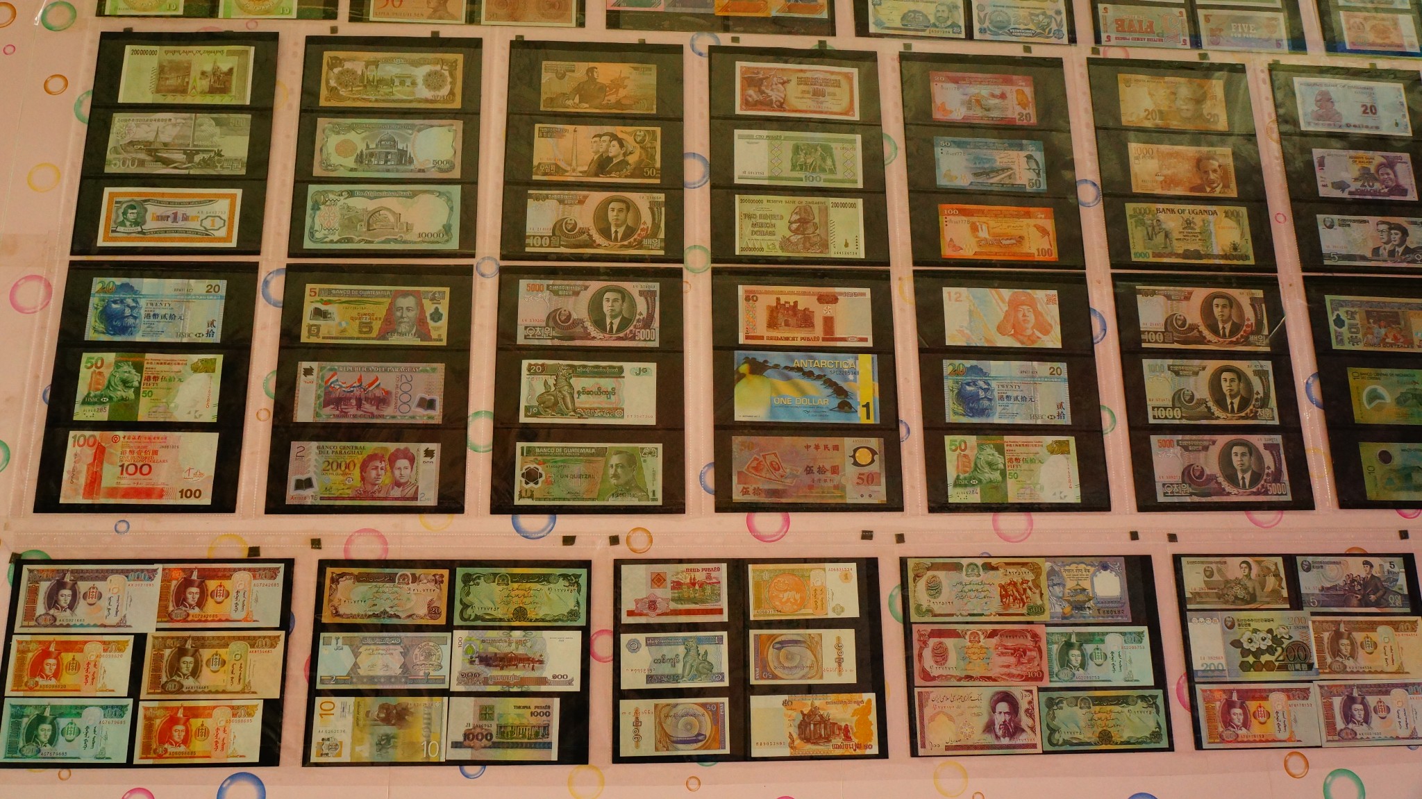 这边的老板爱搜集纸币 全是真的珍藏的,你一进门就可以看到。