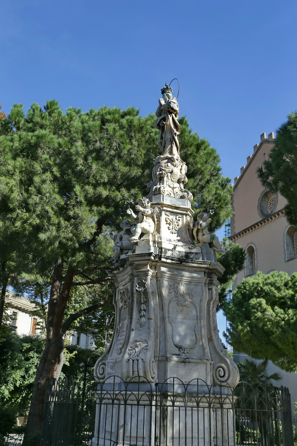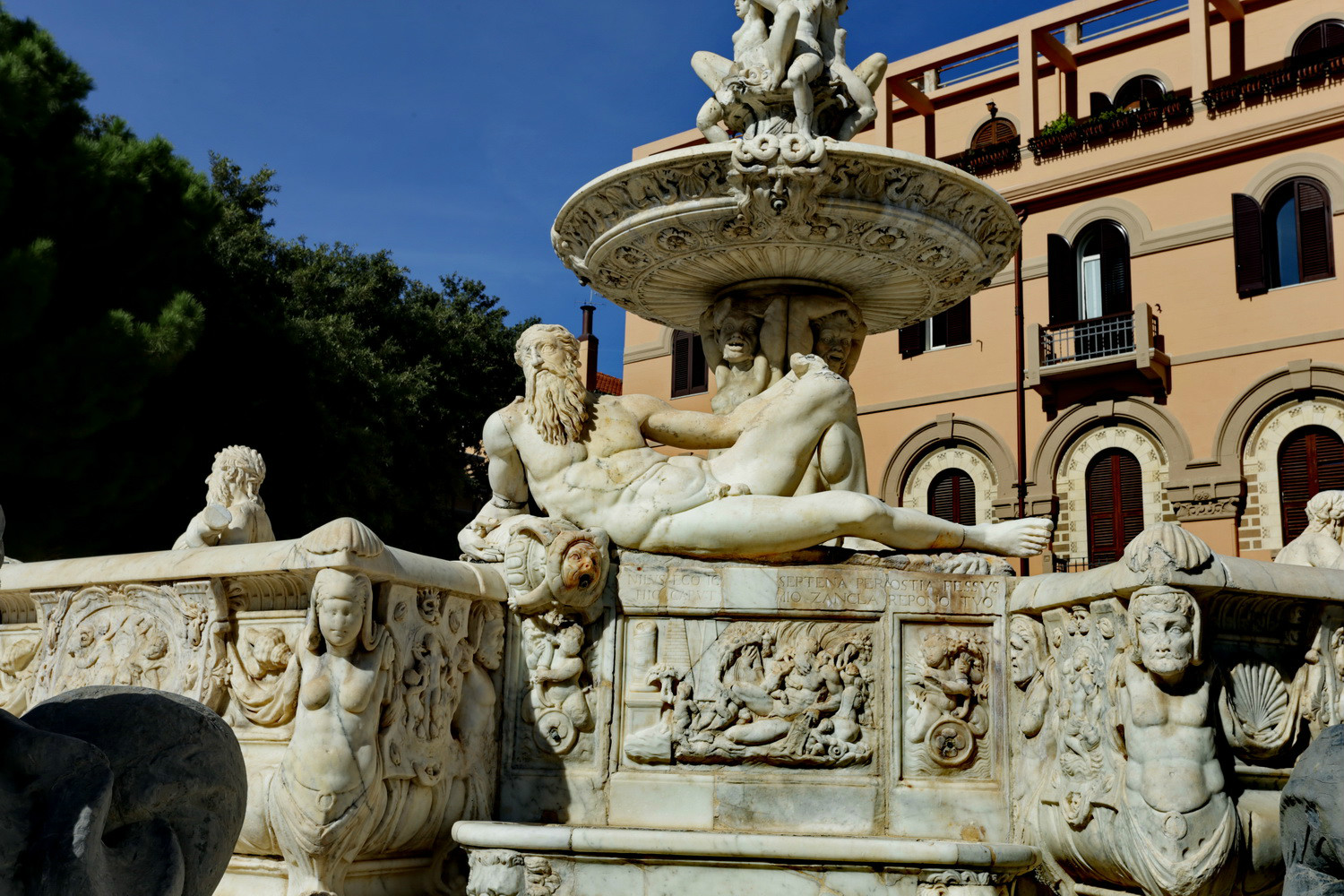 萨蒂西玛·安努兹亚塔教堂外面,意大利 设计师贾·蒙托索里(GA Montorsoli)设计俄里翁喷泉(Fontana d’Orione,1577)据说是为庆祝建立墨西拿城而建造的。喷泉塑像全部由大理 石雕刻而成,栩栩逼真,精致绝伦。可惜照片是在车内往外抓拍的,顶部的人物雕像没有拍全。