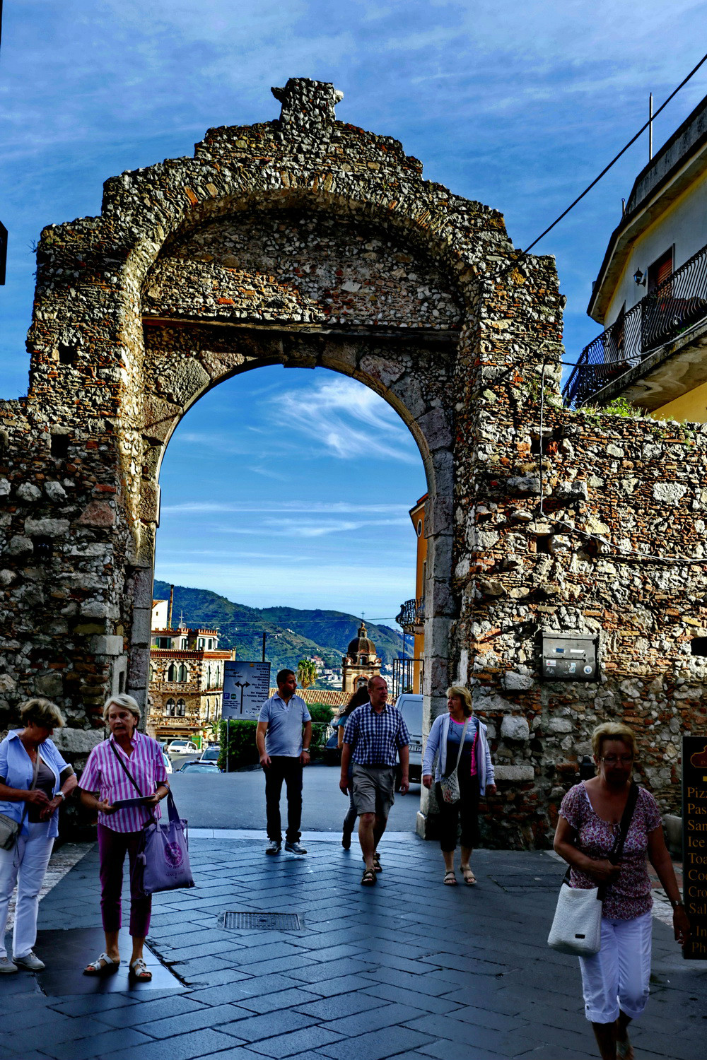 陶米纳坐落于陶尔山(Tauro)的半山腰上,俯瞰爱奥尼亚海湾,同时也可以眺望远处的埃特纳 火山,拥有绝佳地理位置及自然风光。山城有两道城门—北门Porta Messina和南门Porta Catania。